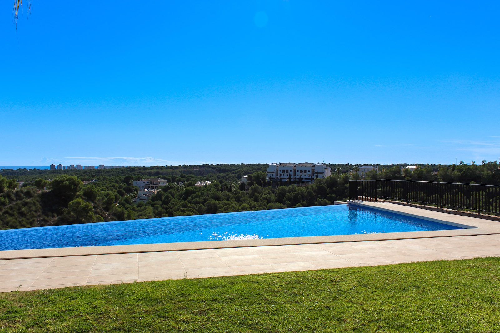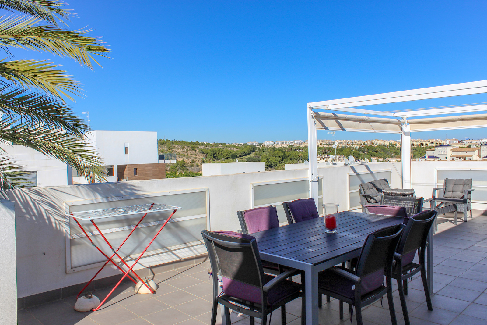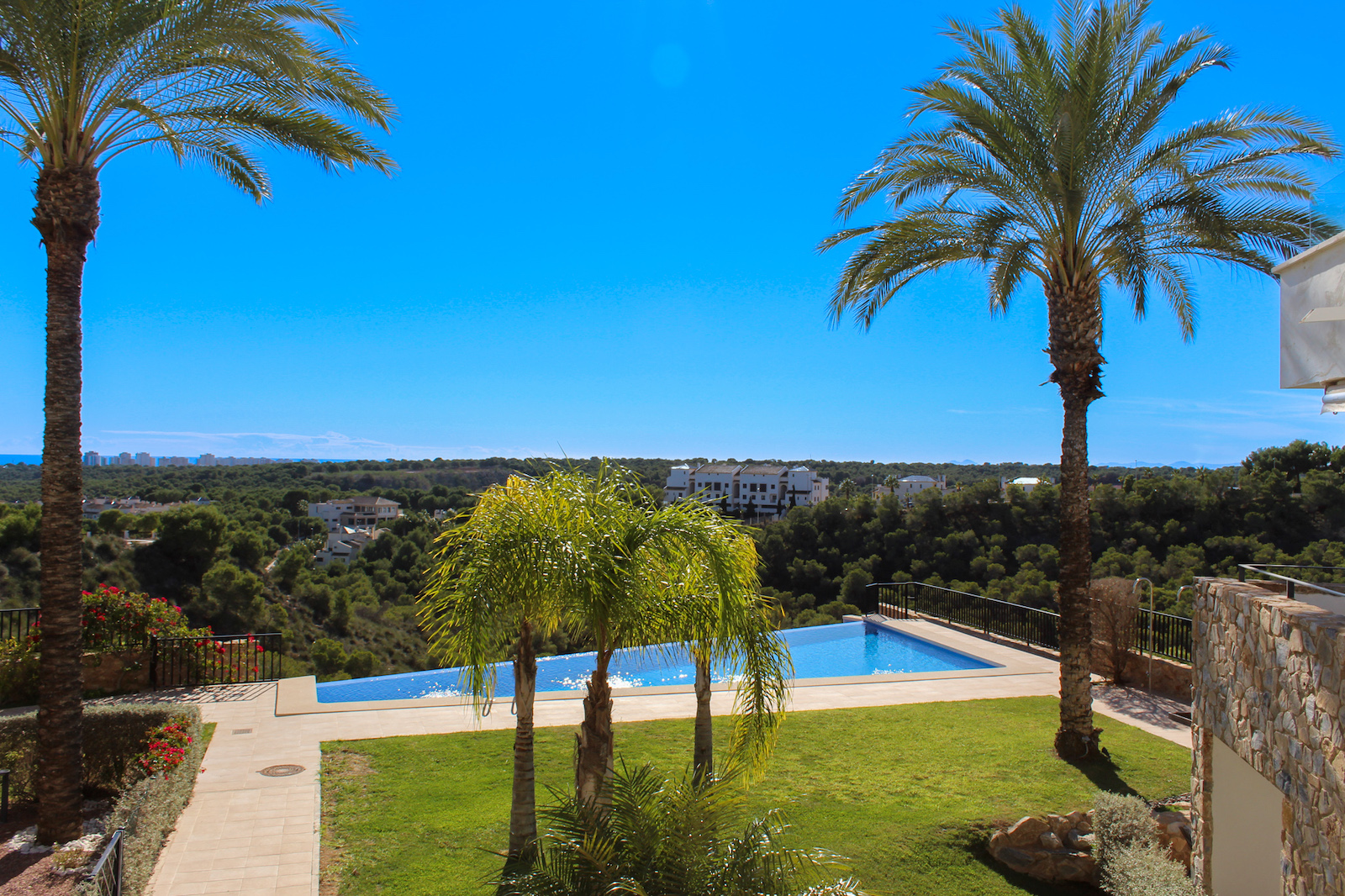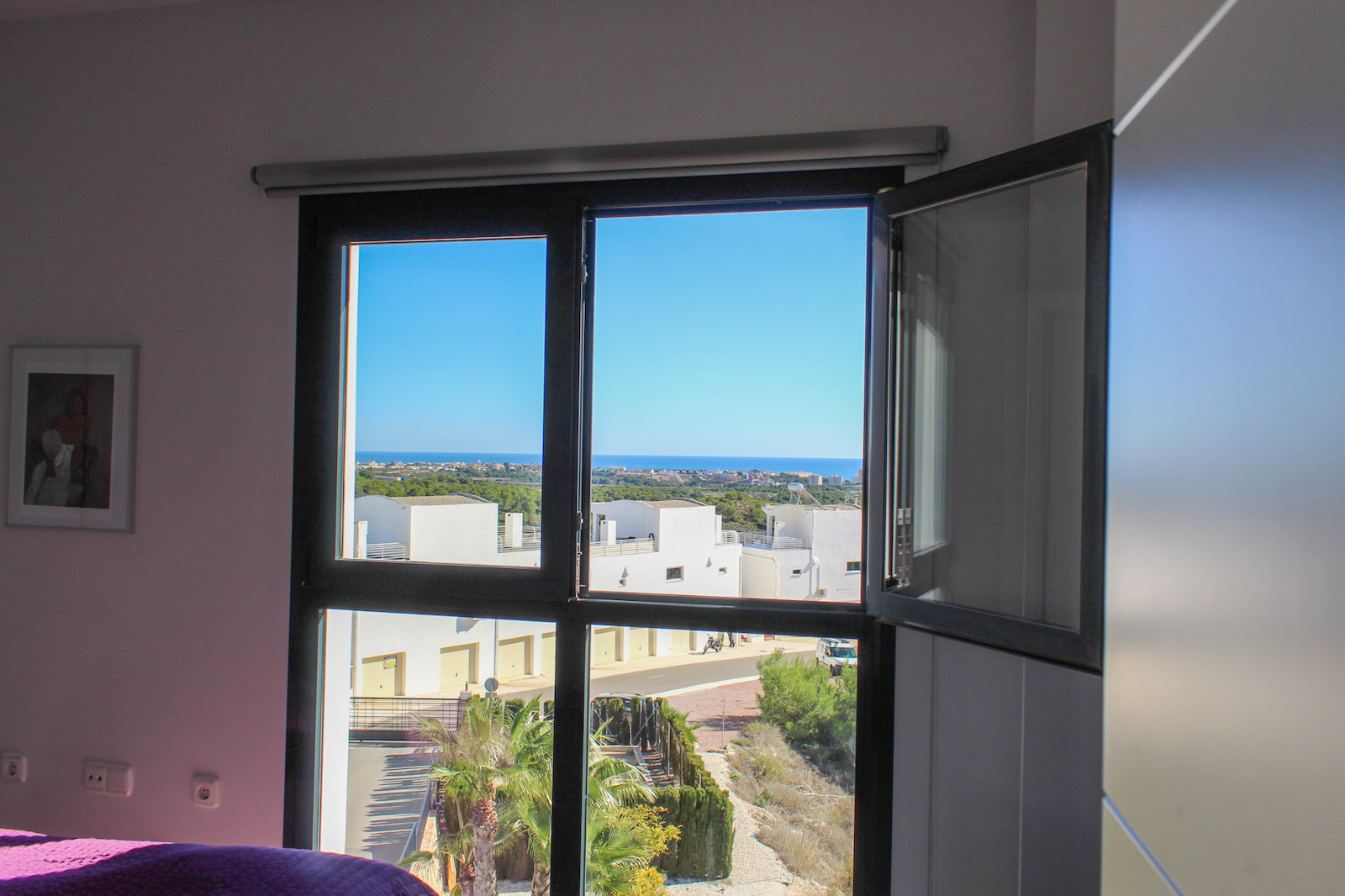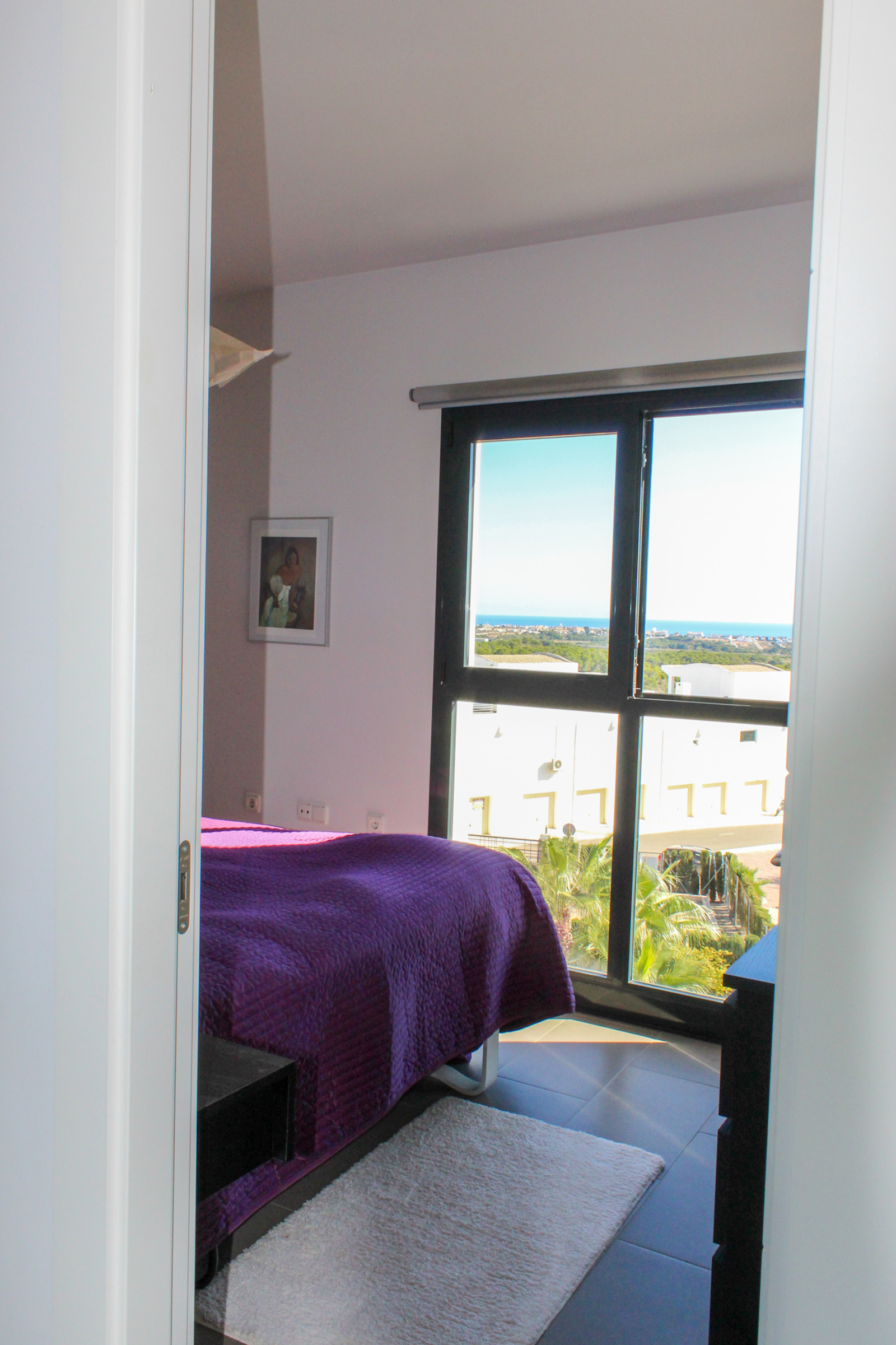 Denne fine og veldistribuerede bungalow-lejlighed med 3 værelser og 2 badeværelser, er beliggende i et decideret smørhul mellem hhv. Villamartín, Campoamor, Las Ramblas og Las Colinas golfbaner. Foruden udsigten over en fredet lund af pinjetræer, samt Las Ramblas golfbane, er der ligeledes en fantastisk, uforstyrret havudsigt; man kan sågar se Middelhavet idet man træder ind i boligen, takket være de store vinduespartier i køkken/alrummet, der går fra gulv til loft.
