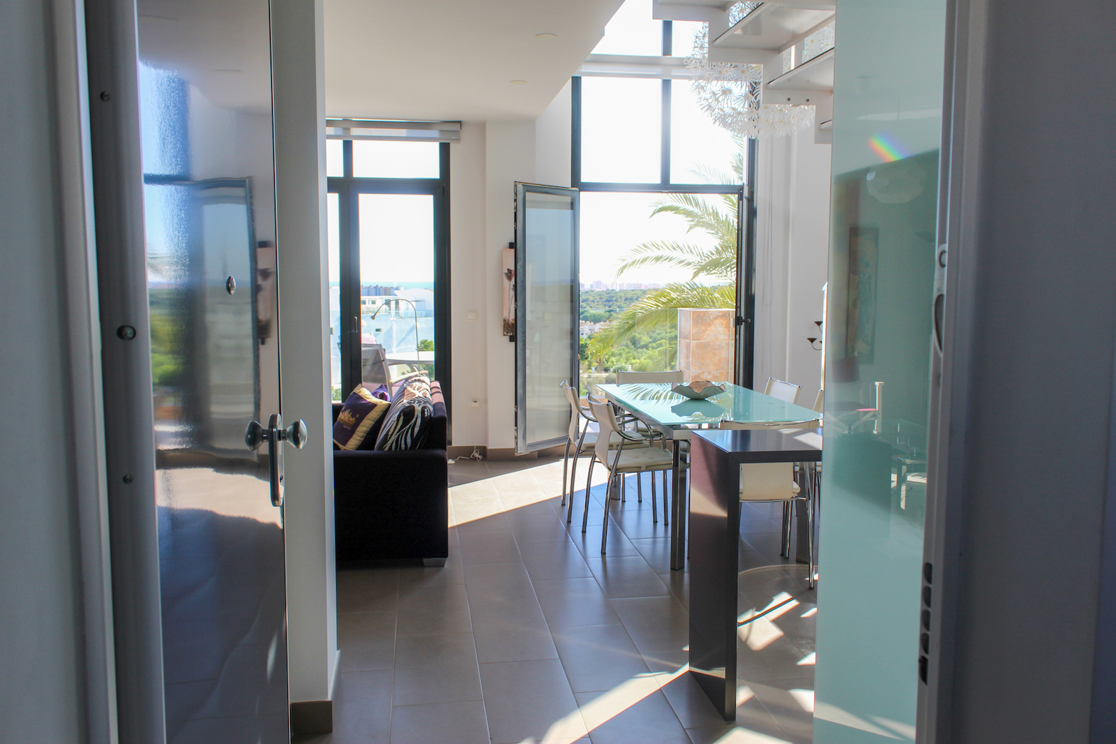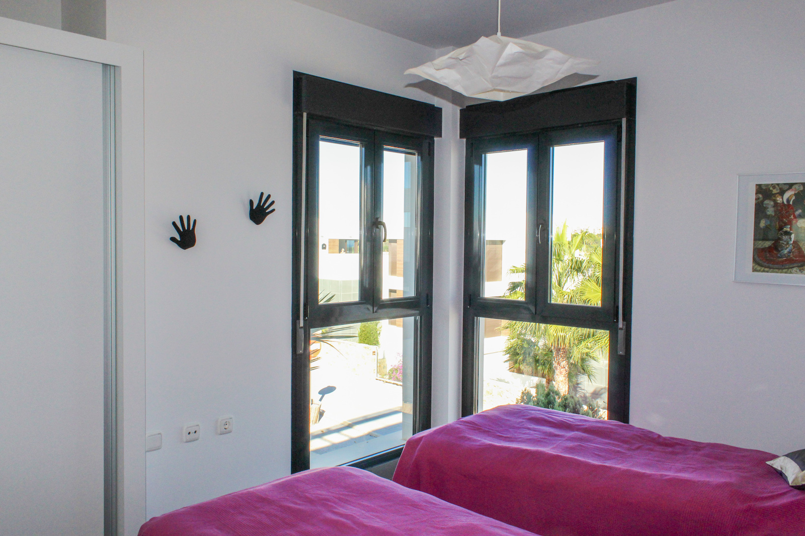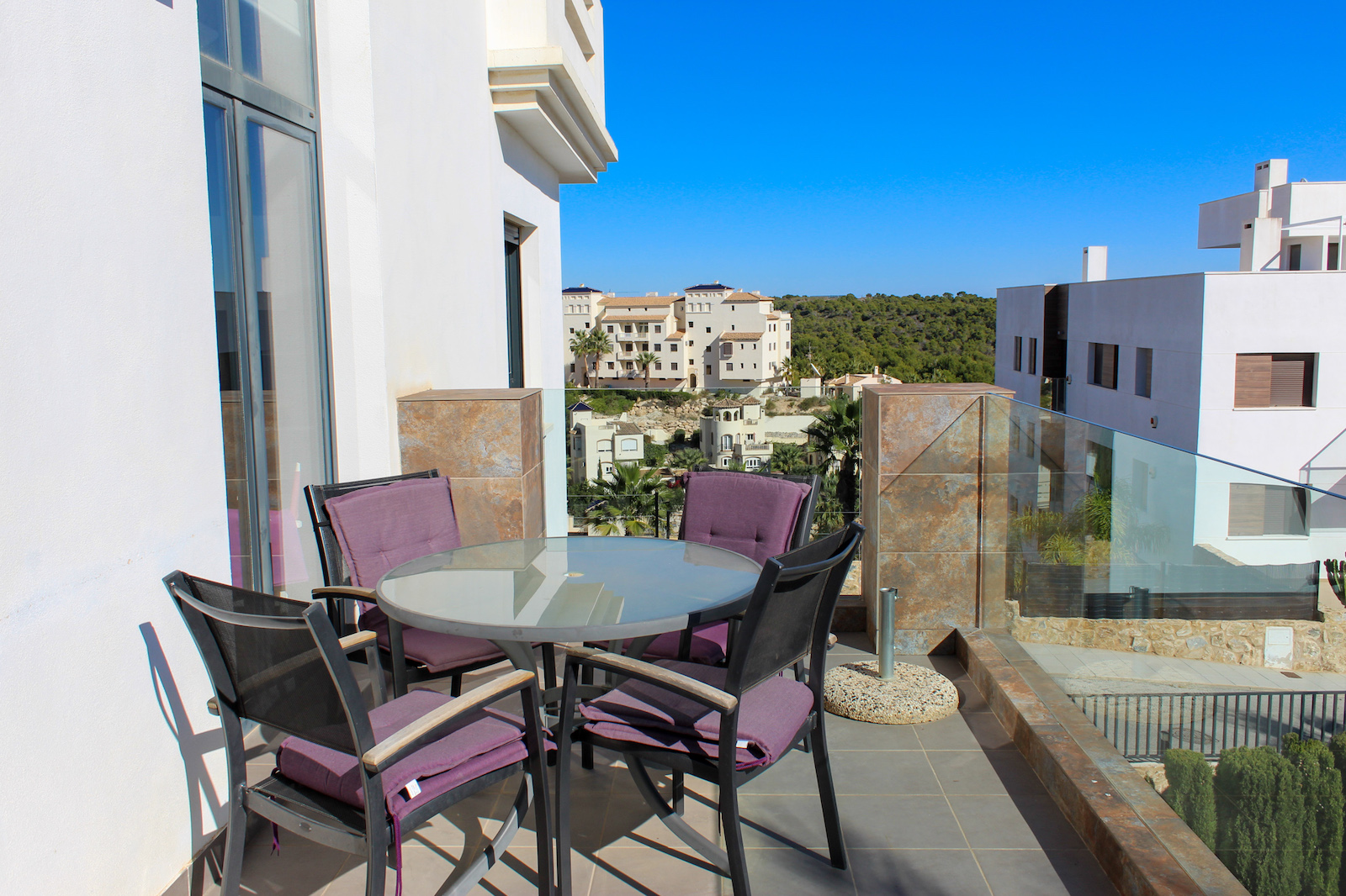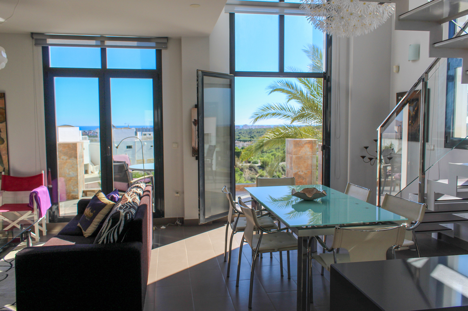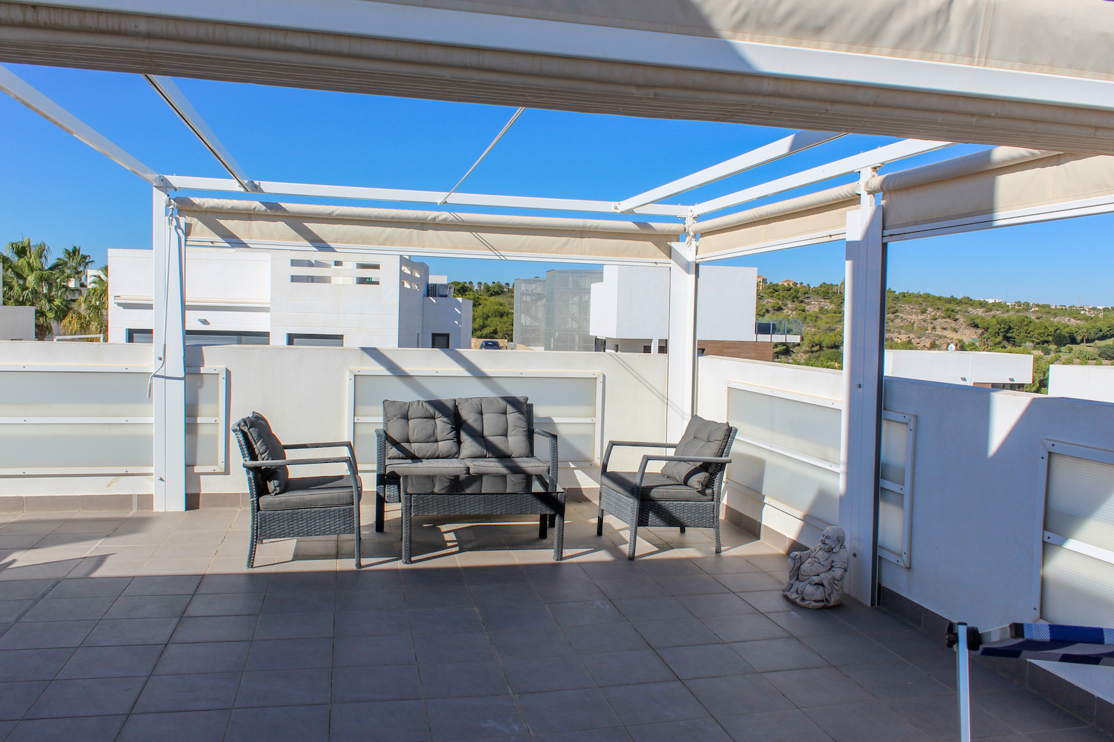 Denne fine og veldistribuerede bungalow-lejlighed med 3 værelser og 2 badeværelser, er beliggende i et decideret smørhul mellem hhv. Villamartín, Campoamor, Las Ramblas og Las Colinas golfbaner. Foruden udsigten over en fredet lund af pinjetræer, samt Las Ramblas golfbane, er der ligeledes en fantastisk, uforstyrret havudsigt; man kan sågar se Middelhavet idet man træder ind i boligen, takket være de store vinduespartier i køkken/alrummet, der går fra gulv til loft.