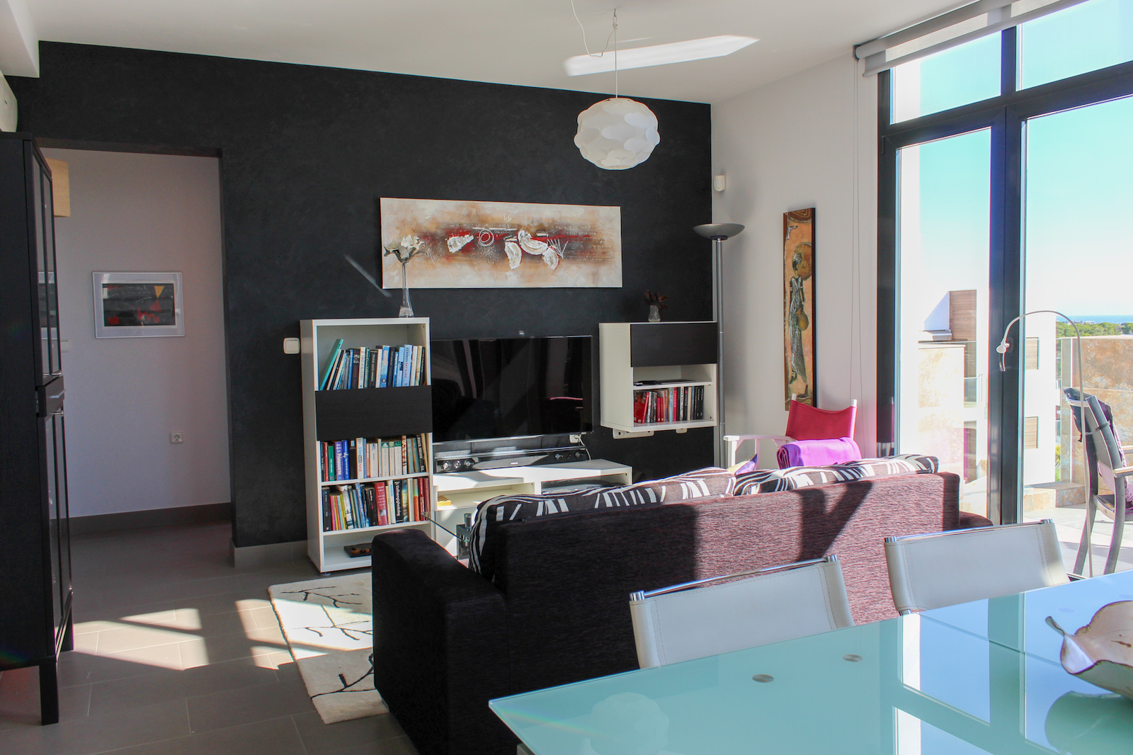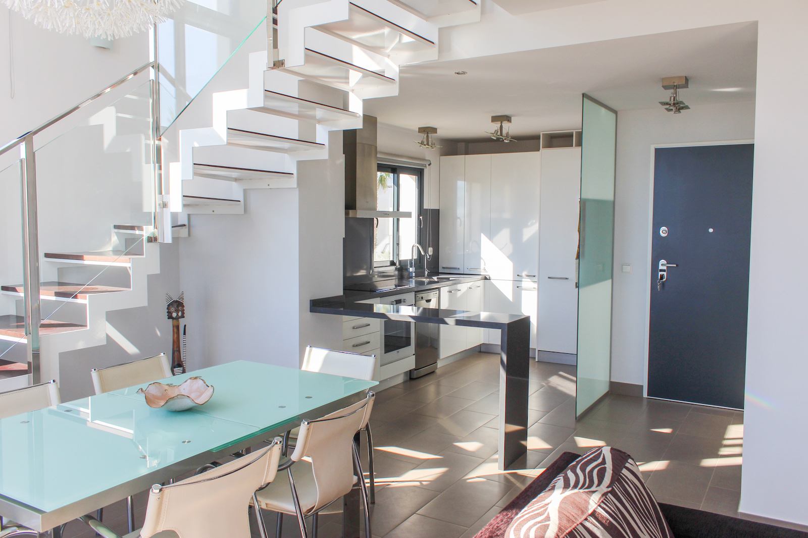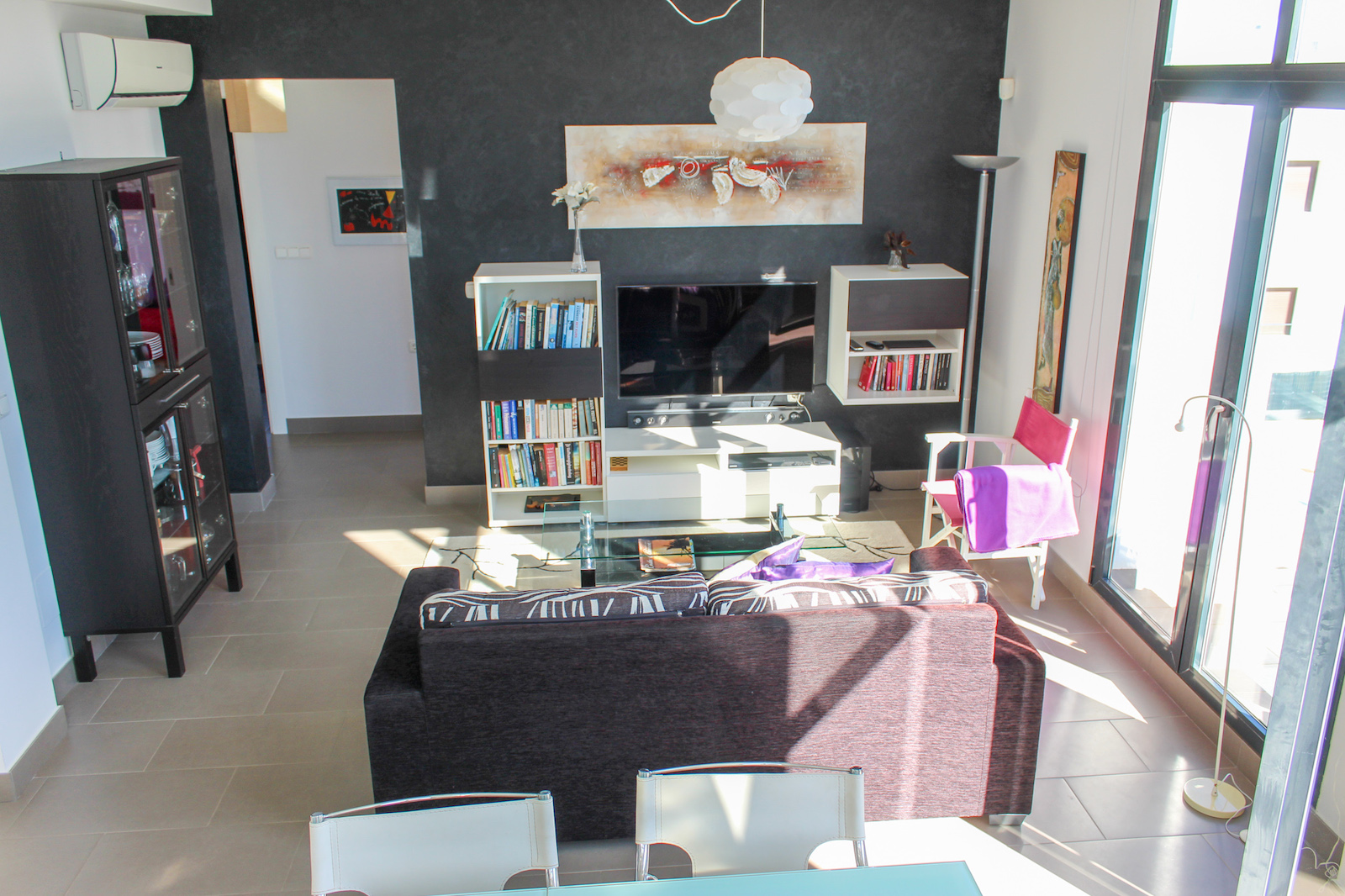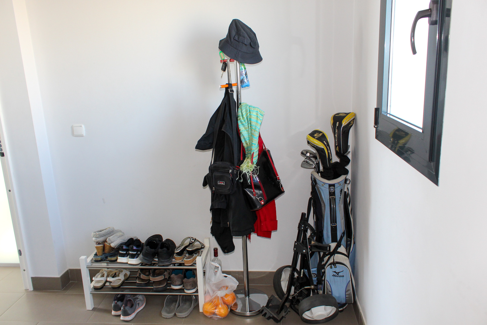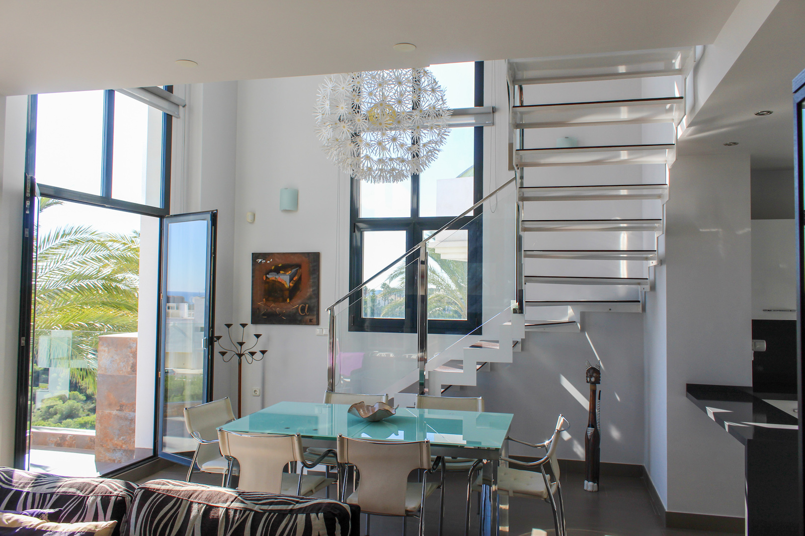 Boligen er beliggende på første sal og når man kommer op ad trappen, er der et stort repos som bruges til opbevaring af eksempelvis golfbags samt entré, hvor jakker og fodtøj stilles, inden man går ind i boligen. På boligens første etage, har man et stort, lyst køkken/alrum med et moderne køkken, spisestue samt dagligstue. I dette rum er der som tidligere nævnt et fantastisk lysindfald, samt en loftshøjde, der giver en fantastisk rumfornemmelse. Fra køkken/alrummet er der adgang til en 12 m2 stor sydvendt terrasse hvorfra man kan nyde udsigten over poolområdet, golfbanen, Middelhavet samt de flotte lys nede på kysten om aftenen. Foruden køkken/alrummet er der 2 gode soveværelser med faste skabe samt et badeværelse.