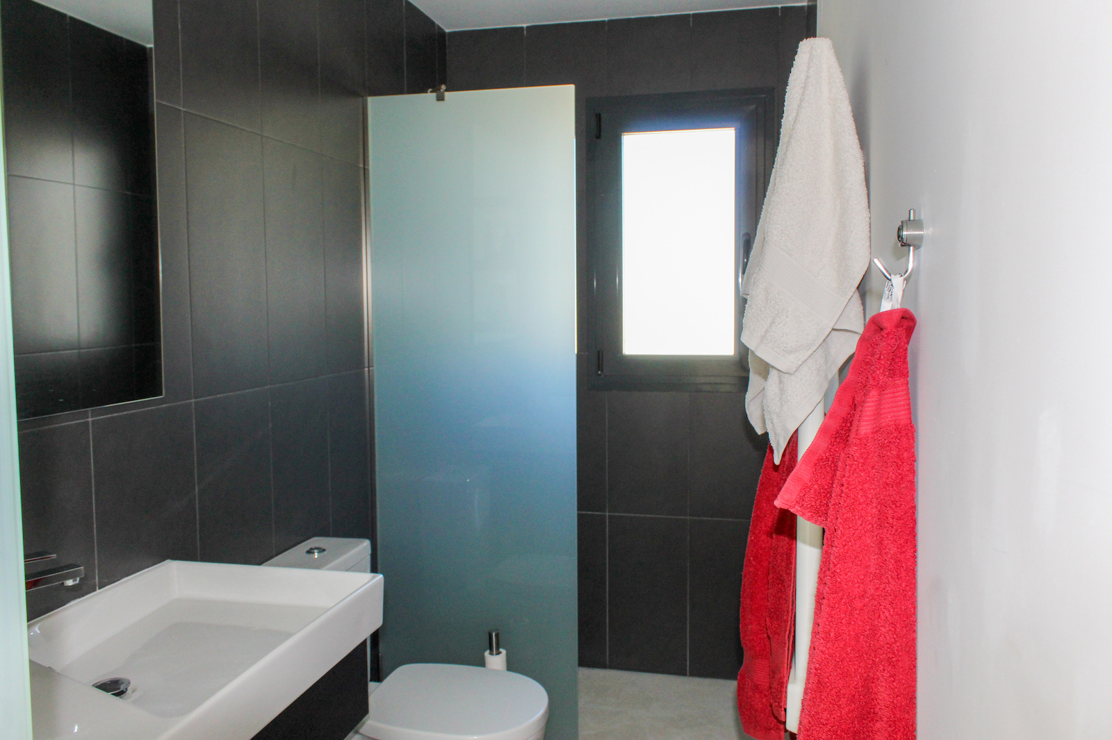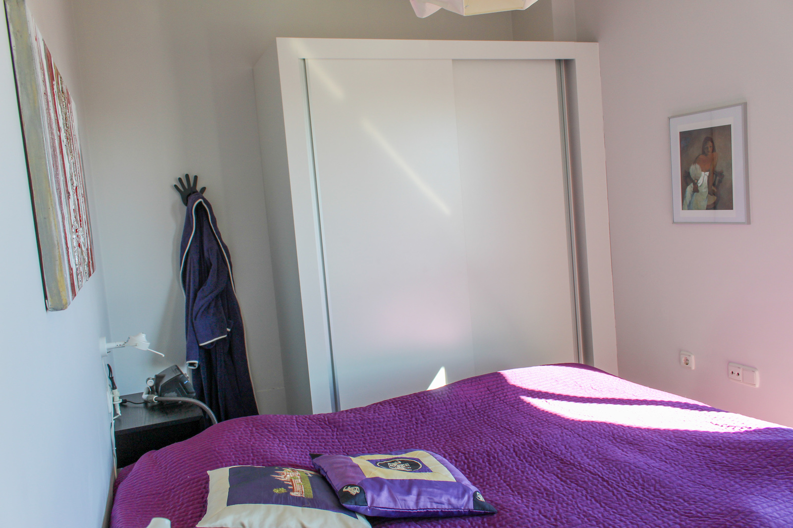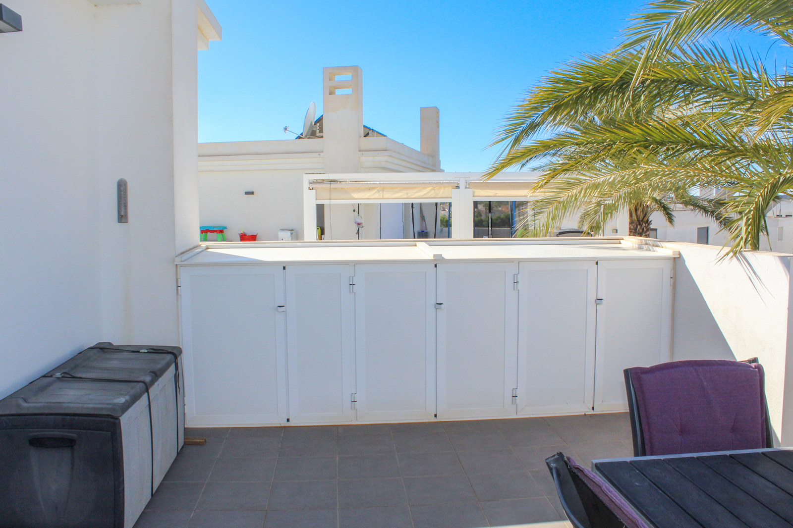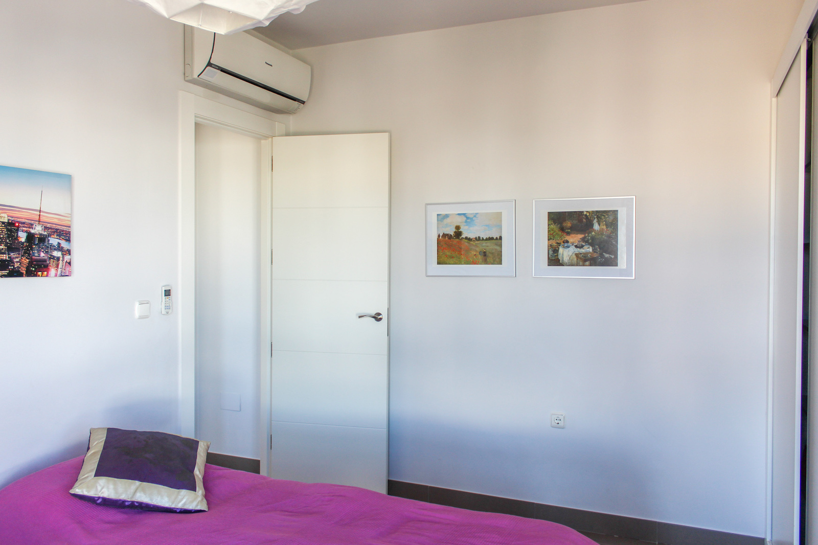 På førstesalen finder man boligens master bedroom, hvorfra man ligeledes har en fantastisk udsigt over Middelhavet, samt et badeværelse og den 69 m2 store tagterrasse. På tagterrassen har sælger lavet opbevaringsrum langs hele den ene side, hvor der også er installeret køleskab. De har ligeledes installeret pergola, som giver mulighed for at lukke såvel siderne som toppen, når man trænger til skygge fra den bagende sol – eller læ for vinden. Dette gør at tagterrassen kan bruges året rundt. Der er aircondition i hele boligen og den sælges møbleret og er derfor fuldstændig indflytningsklar!