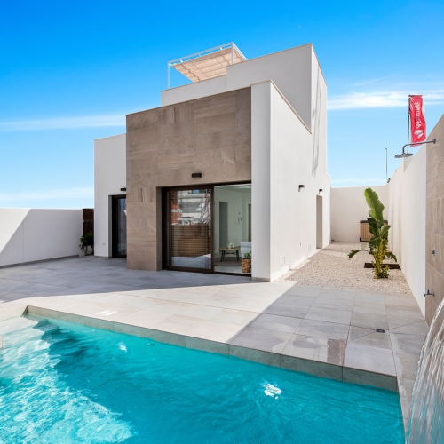 This east/west facing semi detached villa has all of the living space on one level, this includes a great size living room with feature fireplace and air-conditioning, an open plan American style kitchen with modern units and appliances including a dishwasher. The main double bedroom has an ensuite shower room and the other 2 bedrooms are a good size with fitted wardrobes and share a full size bathroom. From this level a doorway leads to the utility cupboard with the water boiler and washing machine and a staircase up onto the very private roof solarium with views across to the parkland.
