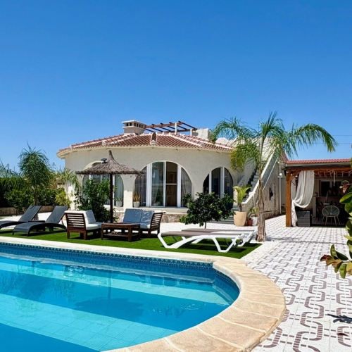 Back at the entrance of the property where there is a space for off road parking and a covered “morning” terrace we find a staircase leading down to a corner seating area and pathway along the side of the house which opens onto the swimming pool and sun terrace. Due to the elevation of the villa we also find a full unfinished under build that has lots of potential for extra storage space or rooms! There is already one finished room with French doors that open onto the pool and is used as a day room and another space with a patio window that is used as a games area, there is so much potential and would make a great project for a new owner!