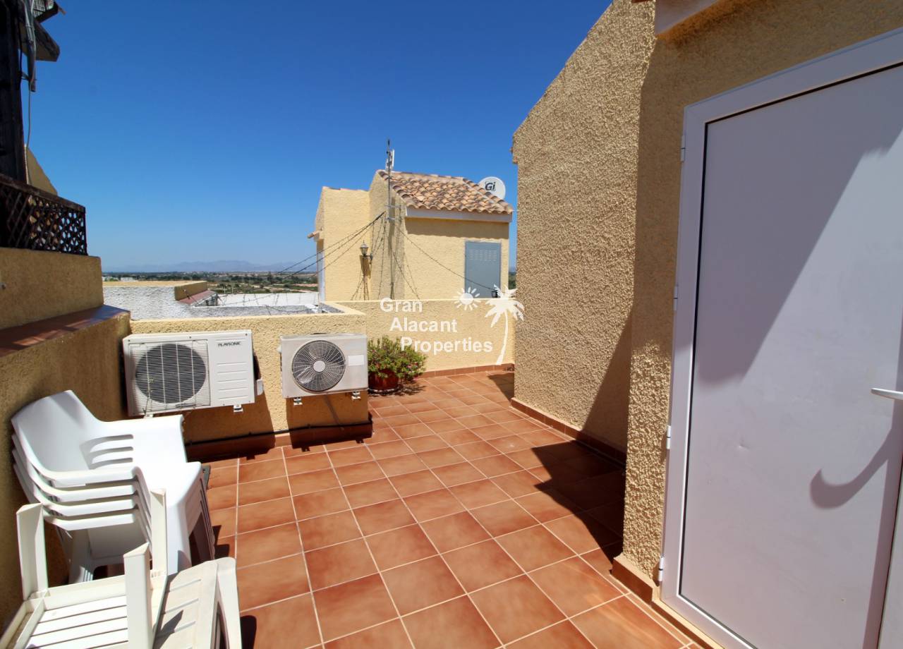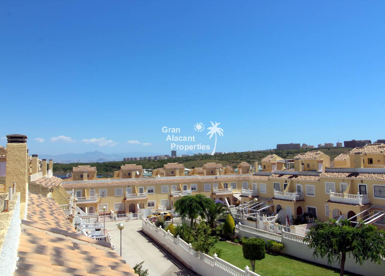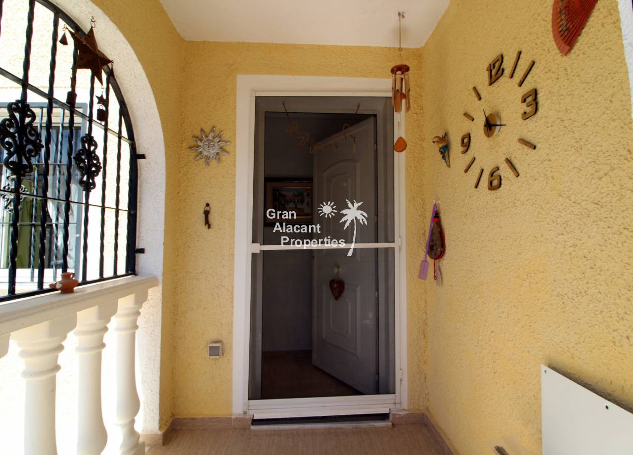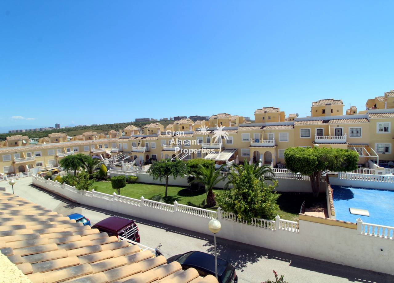 Immaculate south-east facing Gran Alacant townhouse in a great location for sale! We are proud to offer this well presented 2/3 bed townhouse on a sought after community in the lower part of Gran Alacant (zona colegio). Walk to the beach, shops, bars and more. On the ground floor, there is a large open plan air-conditioned living and dining space with an American-style kitchen which has been extended into the covered galleria and a bathroom. On the first floor, there is an air-conditioned master bedroom with built-in his and her wardrobes and private balcony overlooking the pool and community gardens, a second double bedroom with built-in wardrobe and a family bathroom. Located in the lower level of the house, there is a large basement with a window, which has been set up by the current owner as an additional bedroom, lounge and storage area. There are security bars and the property is sold fully furnished including all white goods (not including personal items) so the house move-in ready. Unpack your suitcase and enjoy.