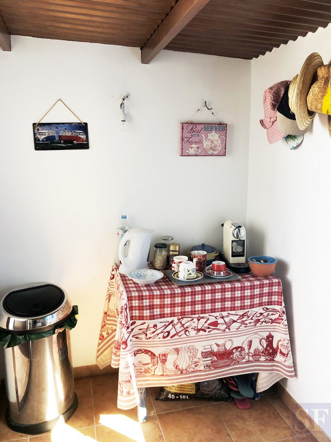 The property has lots of character with beamed ceilings, wood windows with shutters and in the master bedroom French doors opening out to a Juliette balcony. The living area features a free-standing log burning stove.