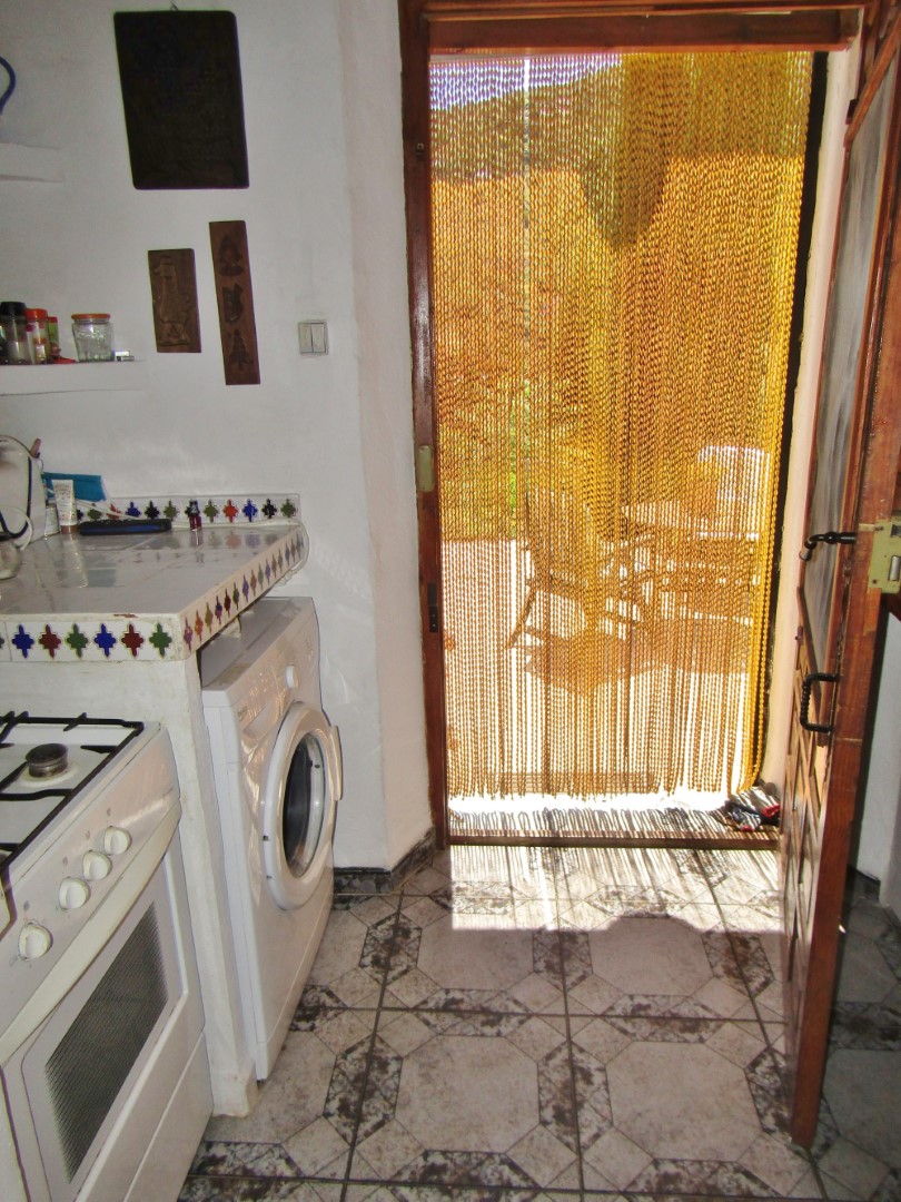 To the far left, an opening through thick walls leads into a delightful kitchen, also with high ceilings, beams and alcoves. This lovely room has a door out to a very sunny East side terrace (30m2), catching the sun all day and hence a perfect place for a morning coffee or a glass of wine on a winter afternoon.