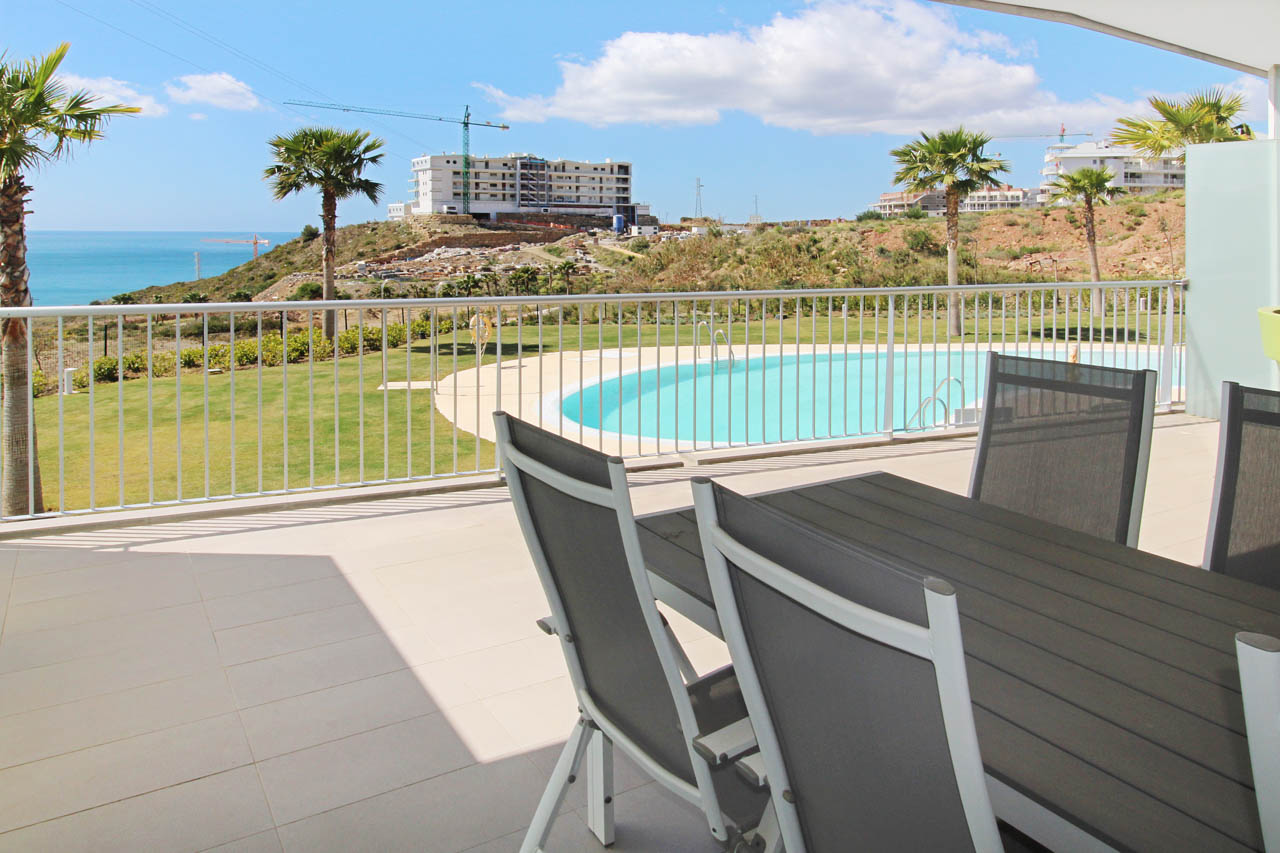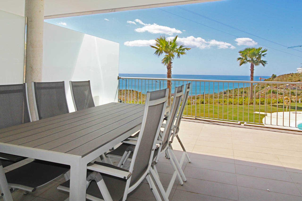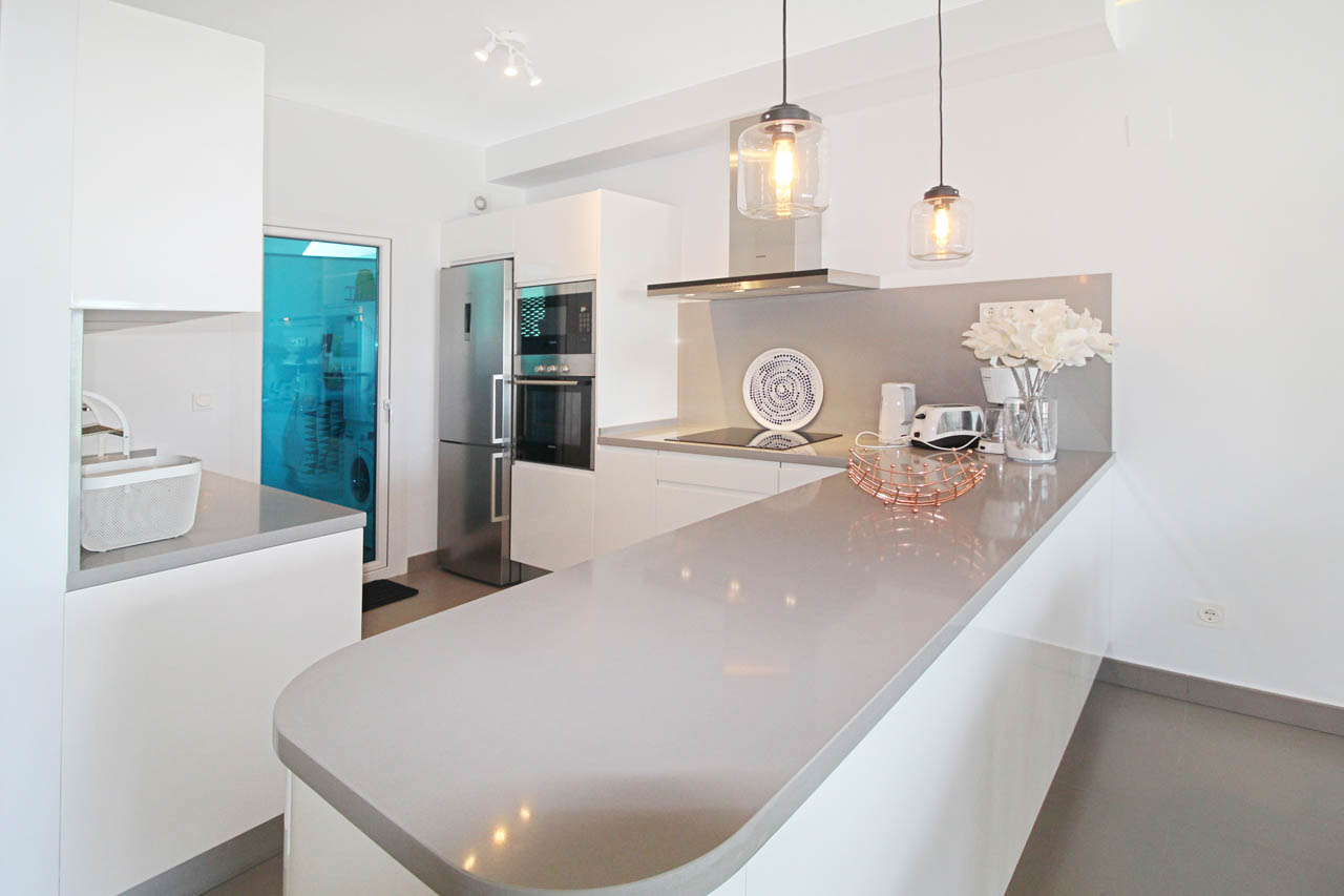 Fra det åbne køkken og stue er der adgang til terrassen igennem en stor gulv til loft glasdør. Herfra har man en skøn udsigt til pool, haven og havet.