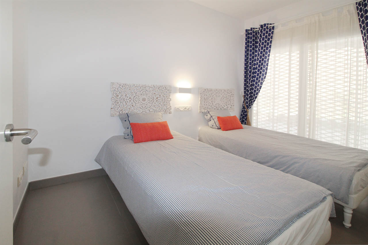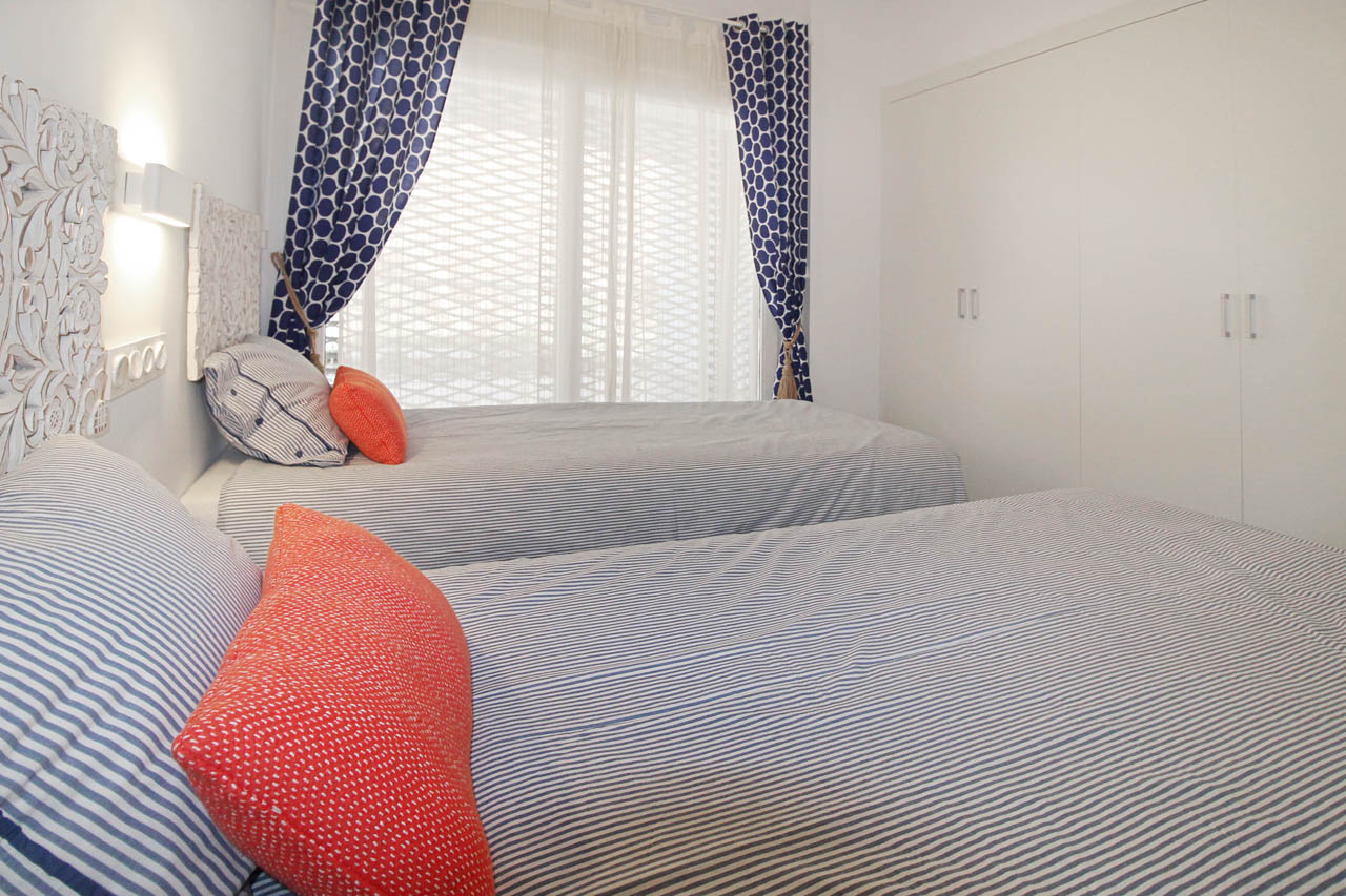 Begge soveværelser har indbyggede skabe og store terrassedøre i stedet for vinduer.