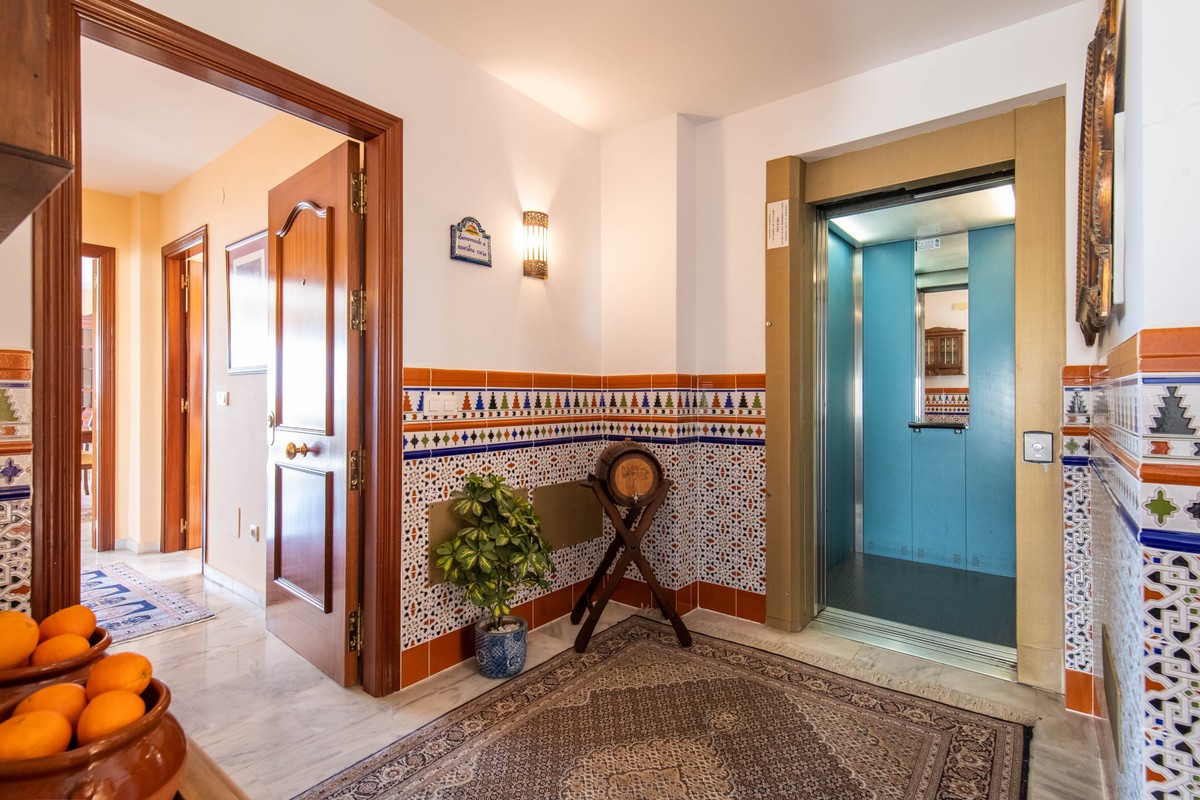 Bare et par skridt ved siden af parkeringen finder du elevatoren, som giver dig eksklusiv og privat adgang direkte op i entreen af lejligheden. Ejendommen optager hele femte sal i denne portal.