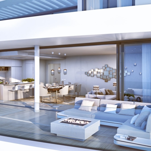 Når du træder ind i entréen, har du på din vestre hånd den rummelig lyse stue med højt til loftet, gulv-til-loft vinduespartier med skydefunktion, som udgør hele den ene væg ud til den sydvest vendte store private terrasse og have med græsplæne. Fra haven som byder på havudsigt, har du din private gangsti ned til den ene (ud af to) fællespool og de flotte grønne områder.