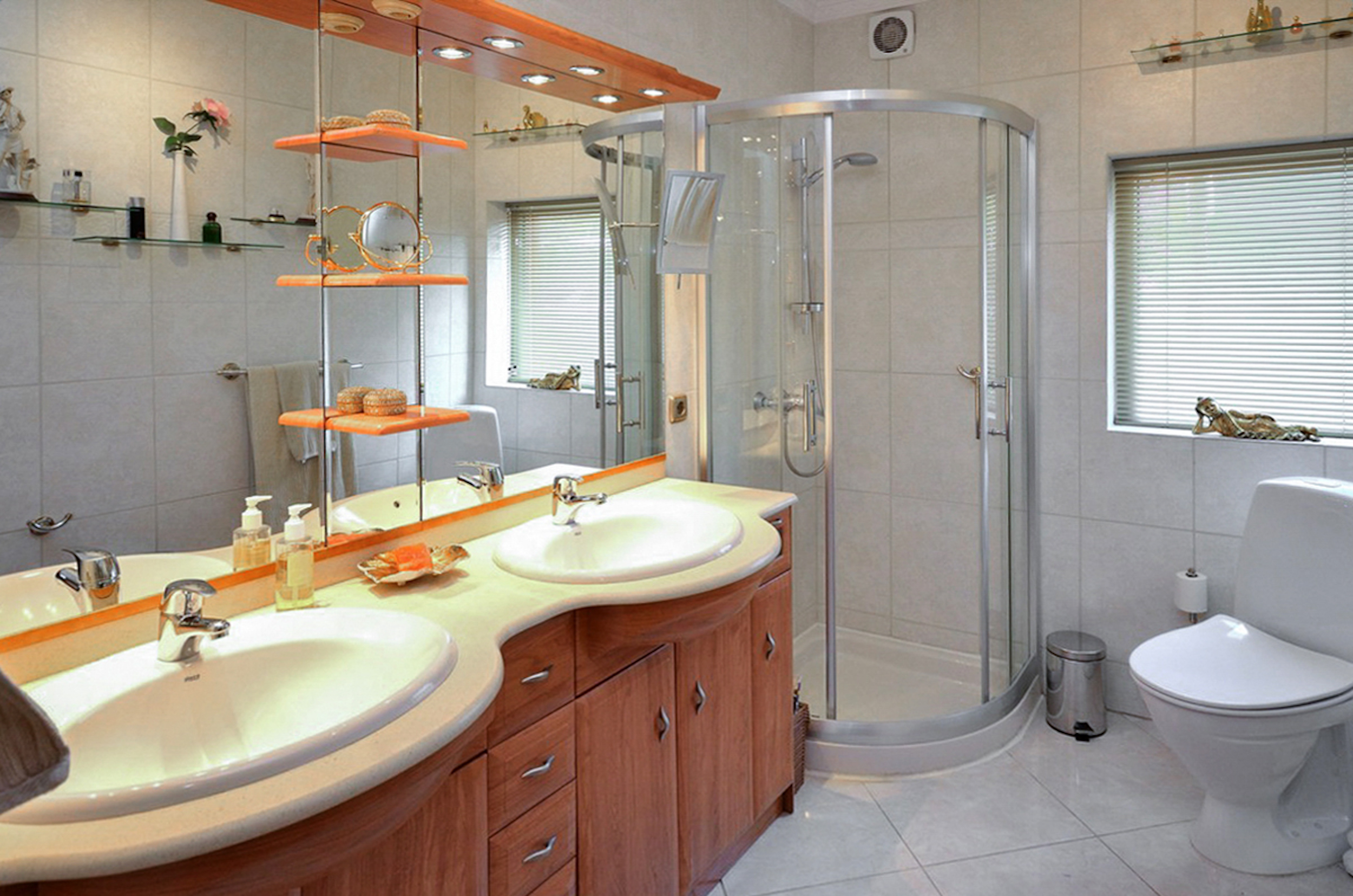Huset består af 6 soveværelser, hvor 4 af dem er i hovedhuset sammen med 3 af badeværelserne. Nedenunder finder man en seperat lejlighed med 2 soveværelser, badeværelse, stue og fuldt udstyret køkken, som er helt nyt. Man kan komme ind i lejligheden igennem hovedhuset eller igennem garagen eller fra haven.