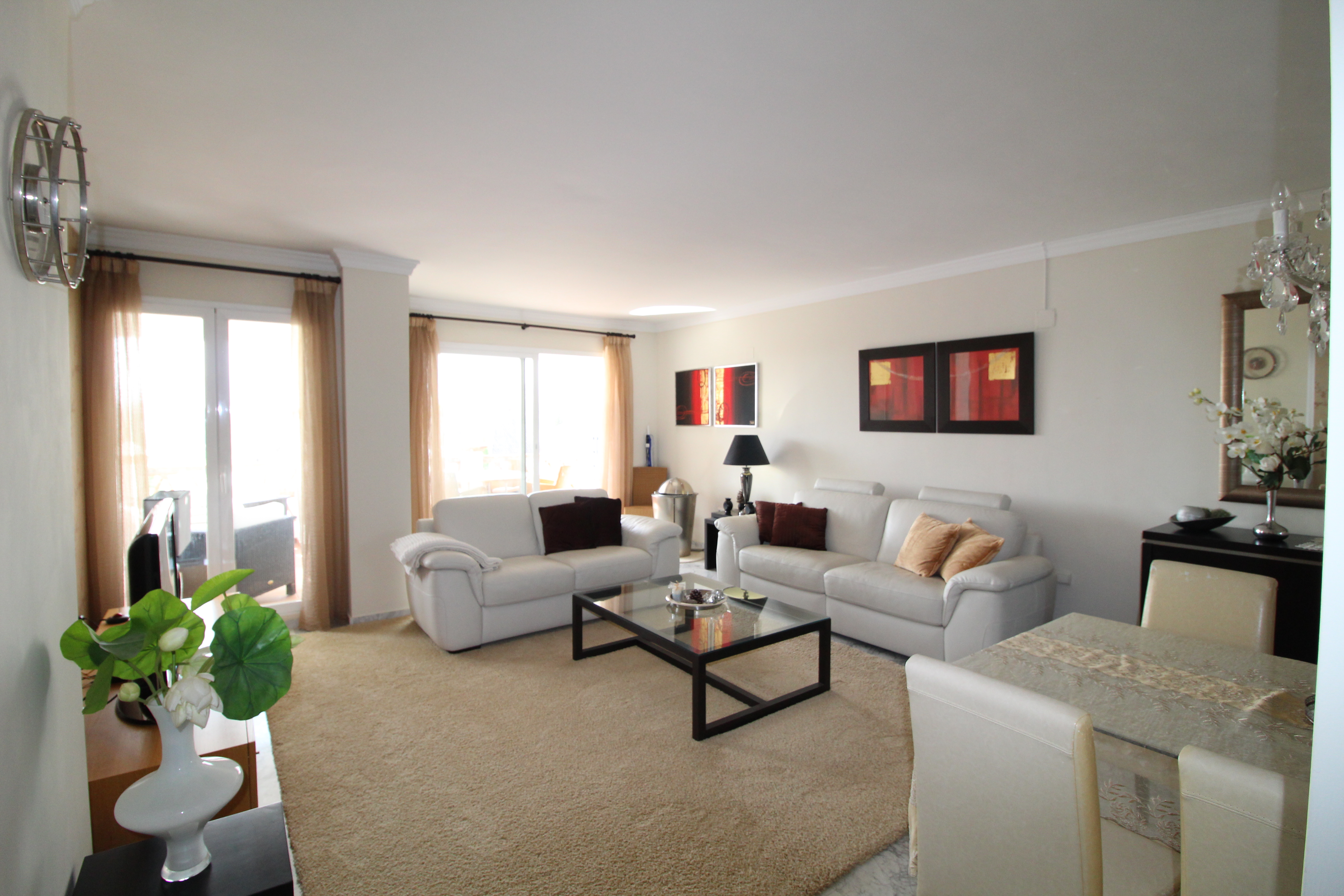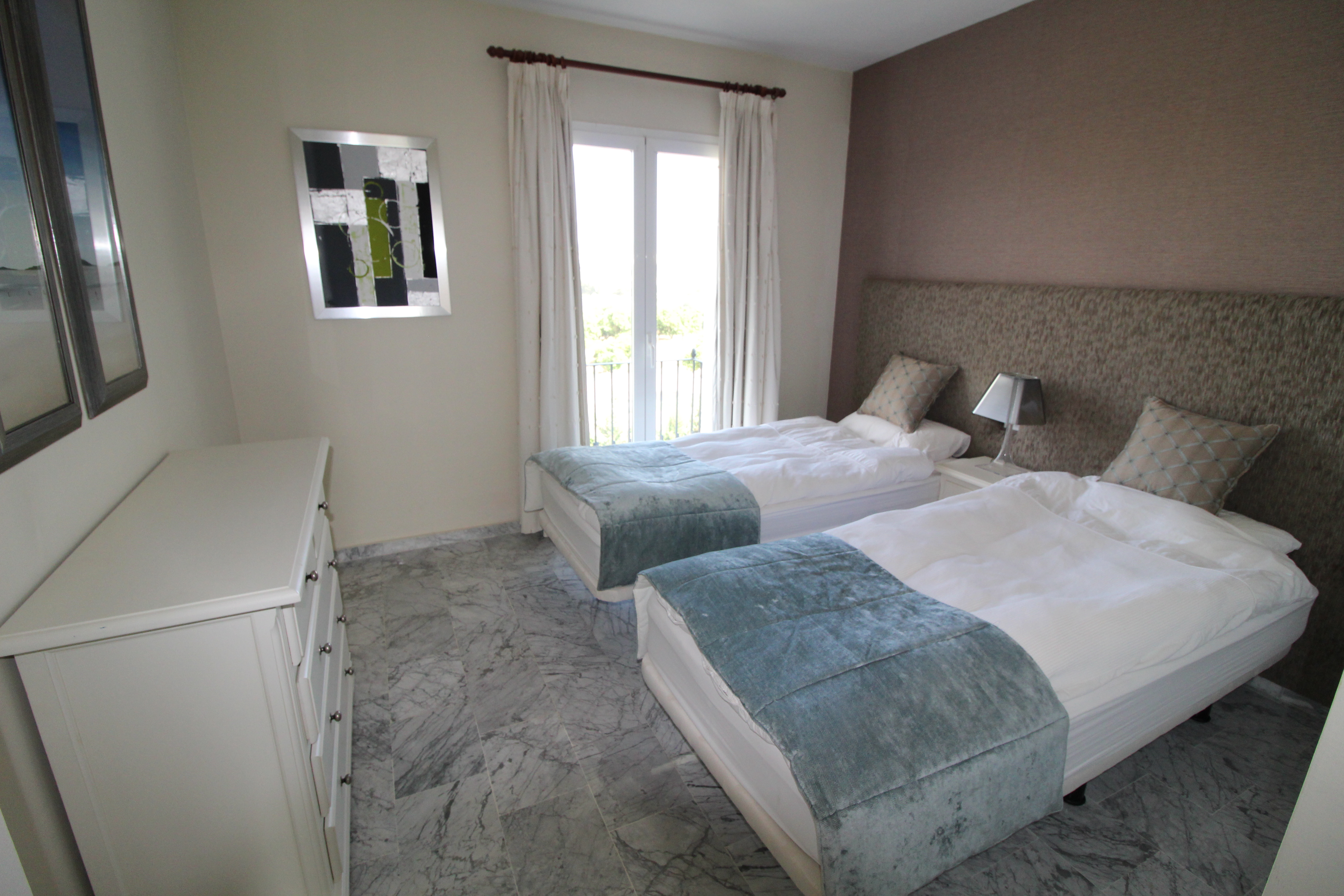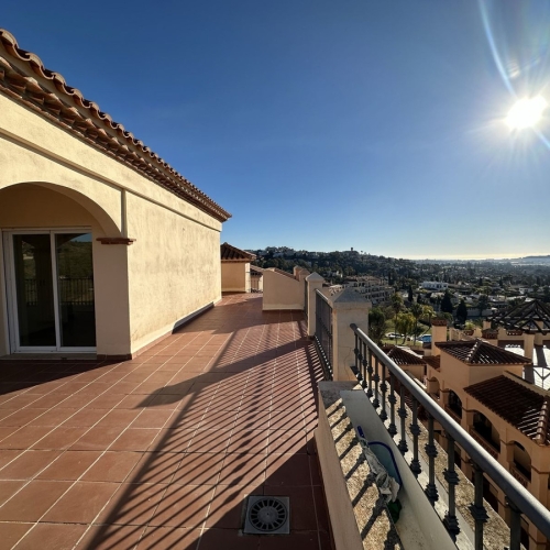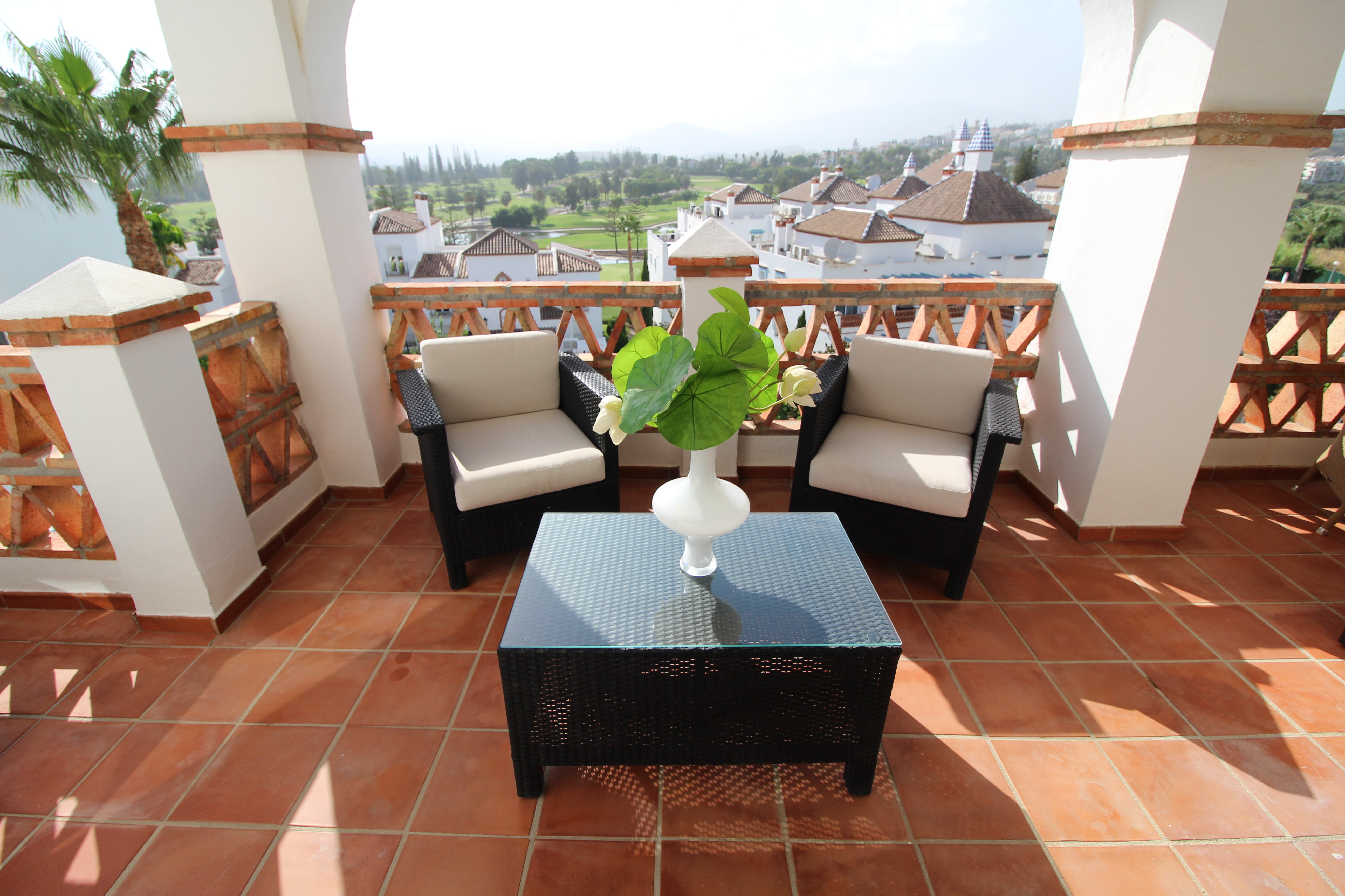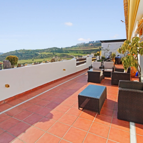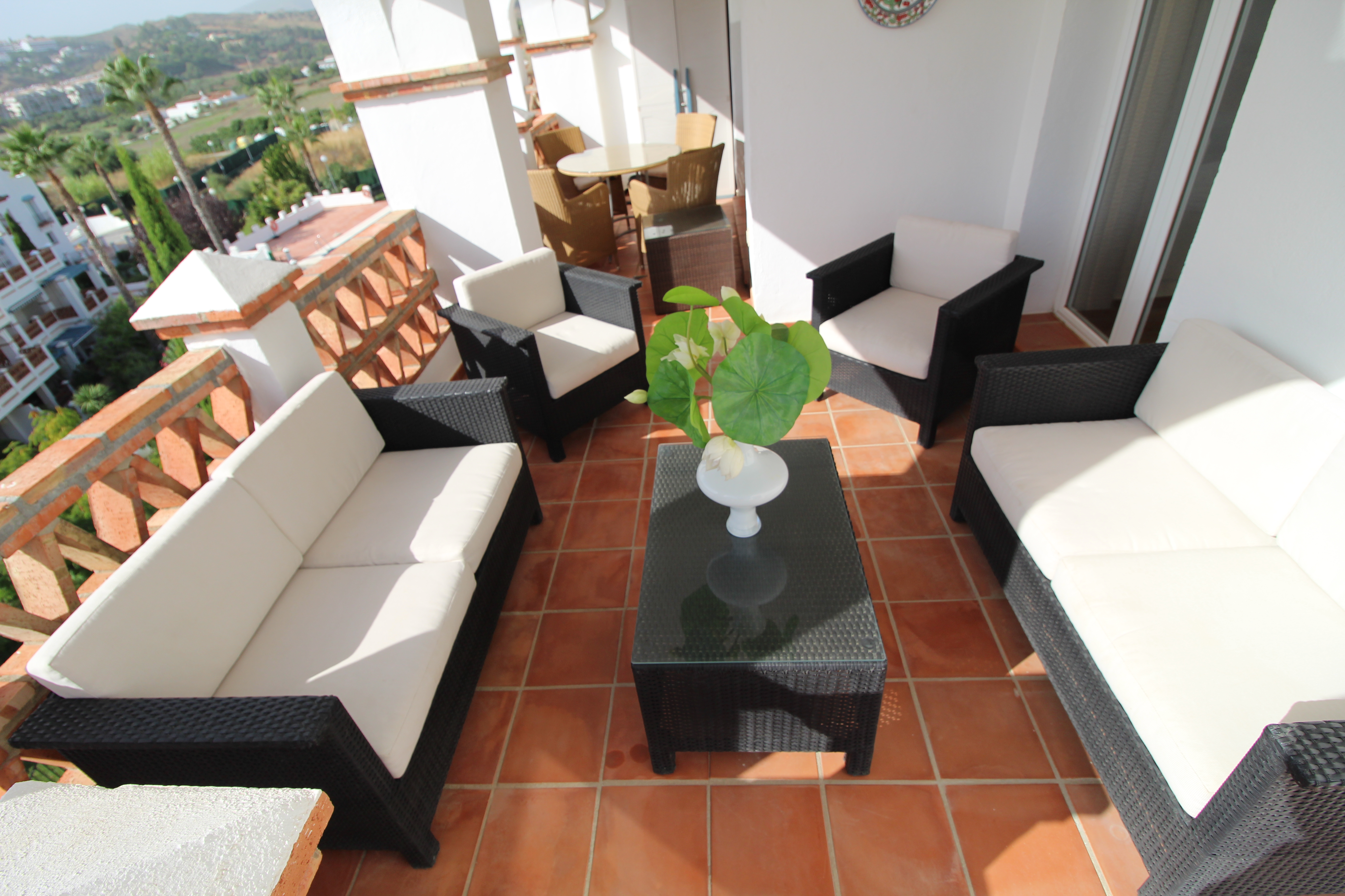 Fra den 30 m2 store sydvest vendte terrasse kan man nyde den skønne udsigt til golfbanen og bjergene. Herfra har man sol hele eftermiddagen og aftenen.