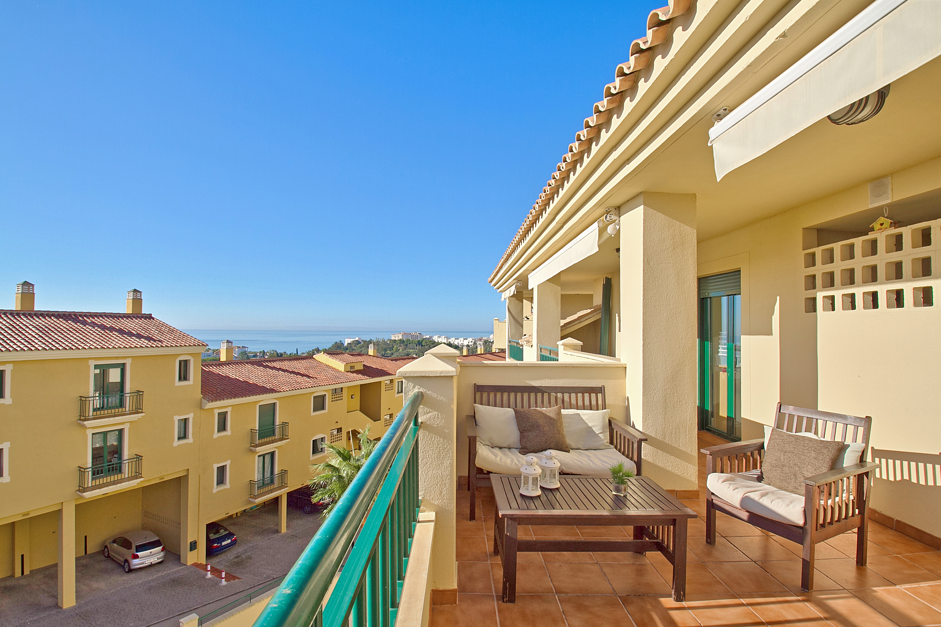 Fra terrassen har du en dejlig havudsigt samt udsigt til poolen.