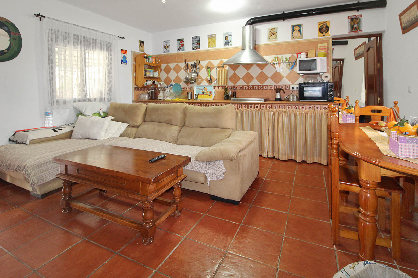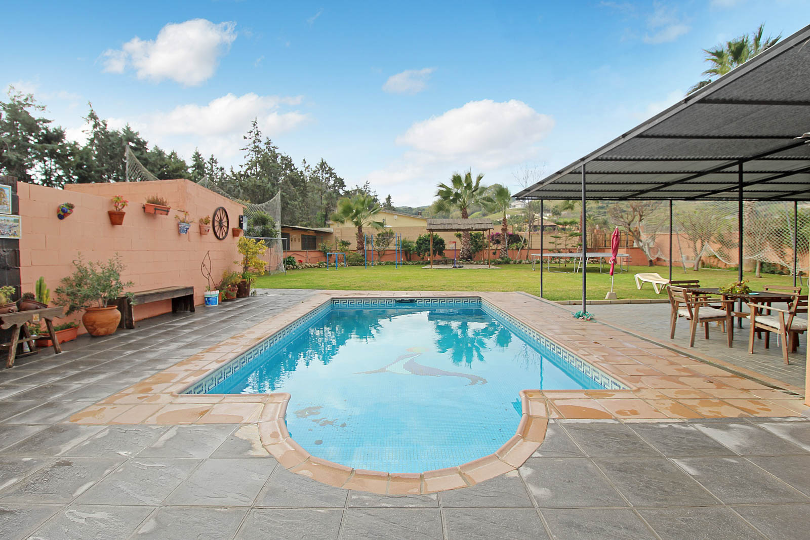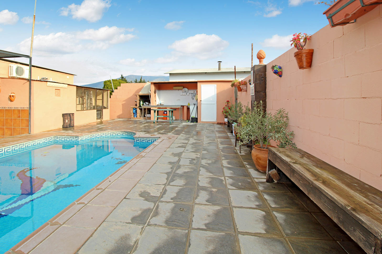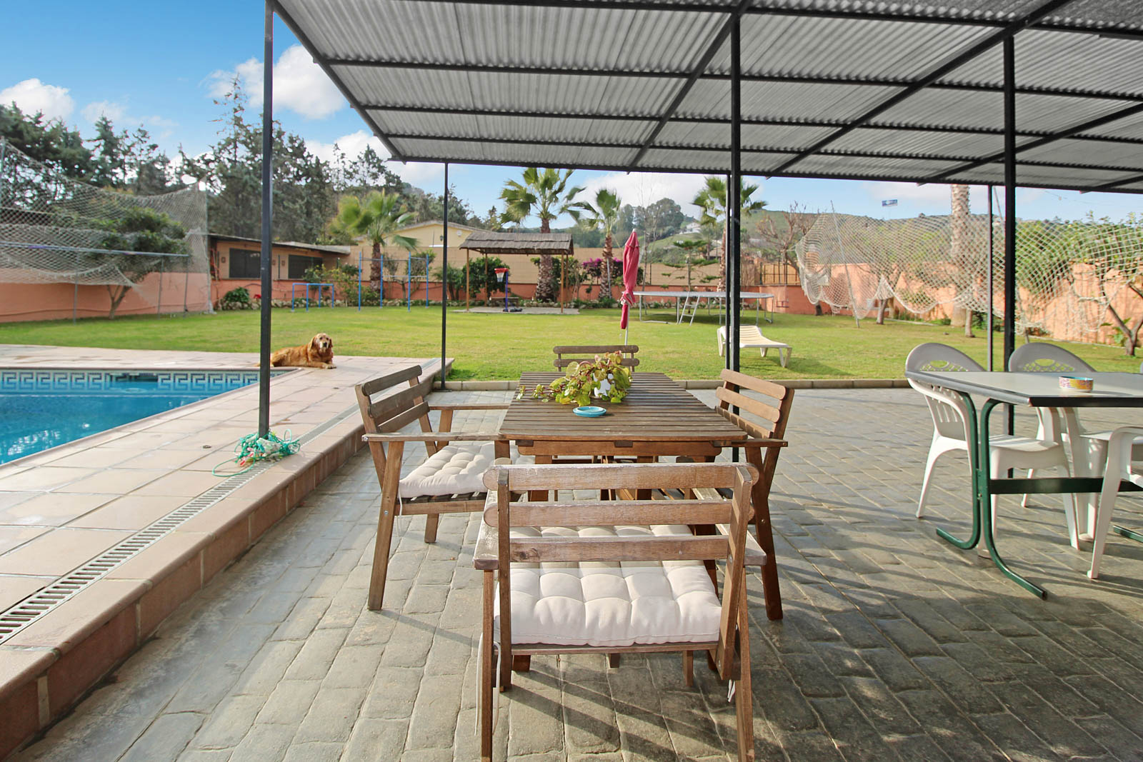 Huset rummer 2 soveværelser, 1 badeværelse, åbent køkken og stue med adgang lige ud til den dejlige og rummelige gårdhave med direkte adgang til den store have og pool område, med masser af plads til underholdning og hygge!