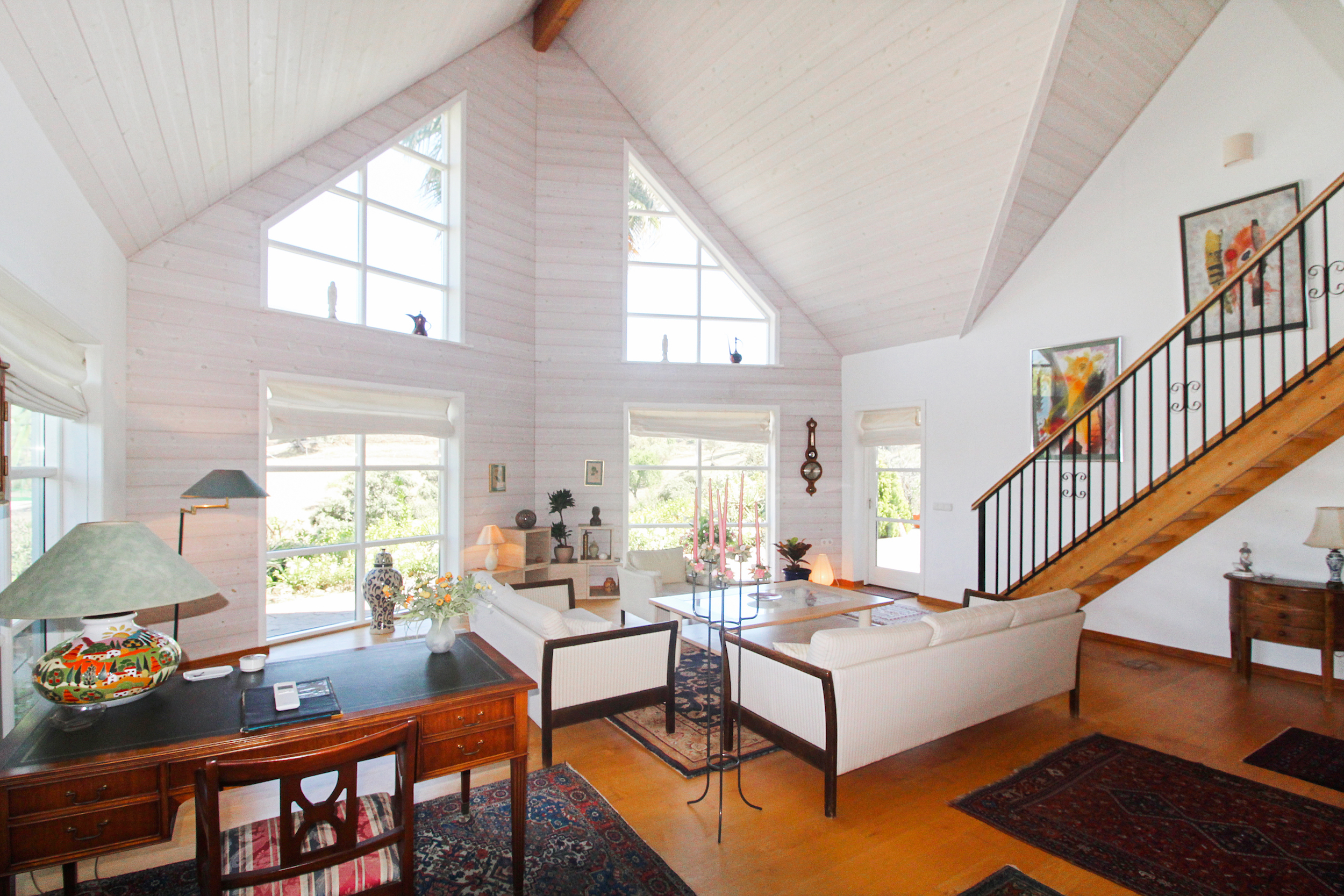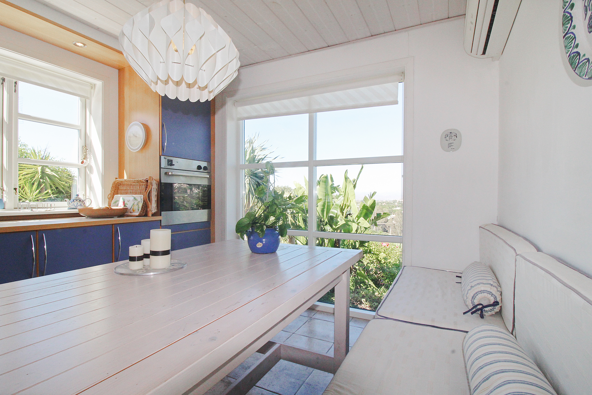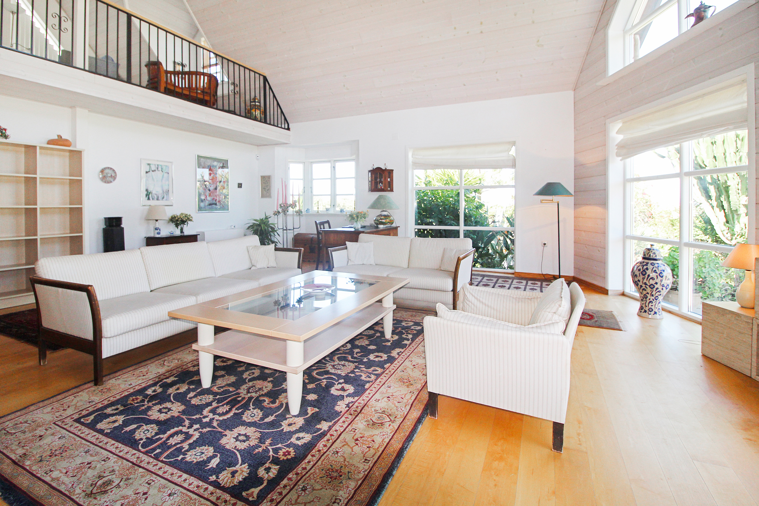 Når du er kommet gennem køkken og stue, kan du gå lige ud på den store terrasse med flot udsigt over bjergene. Stuen har store vinduer, som gør at det strømmer ind med fantastisk naturligt lys.