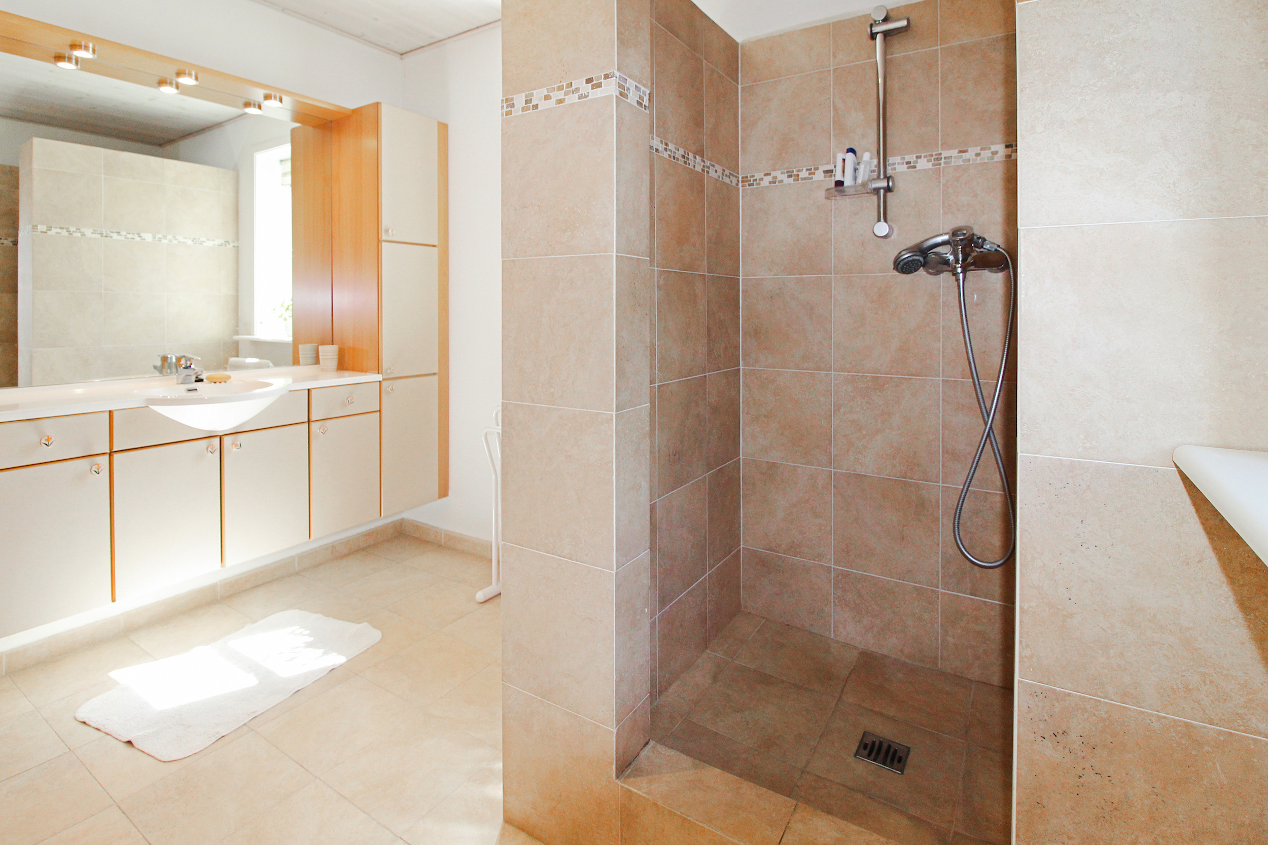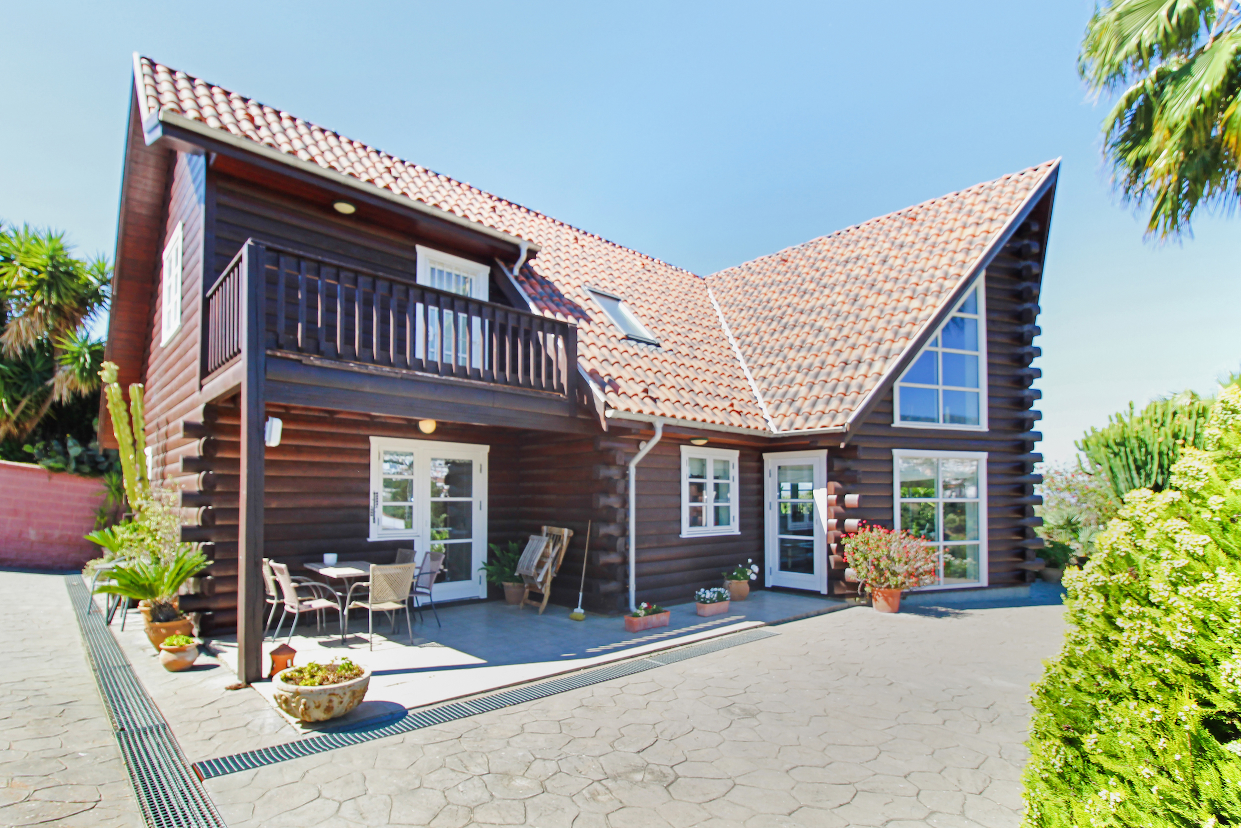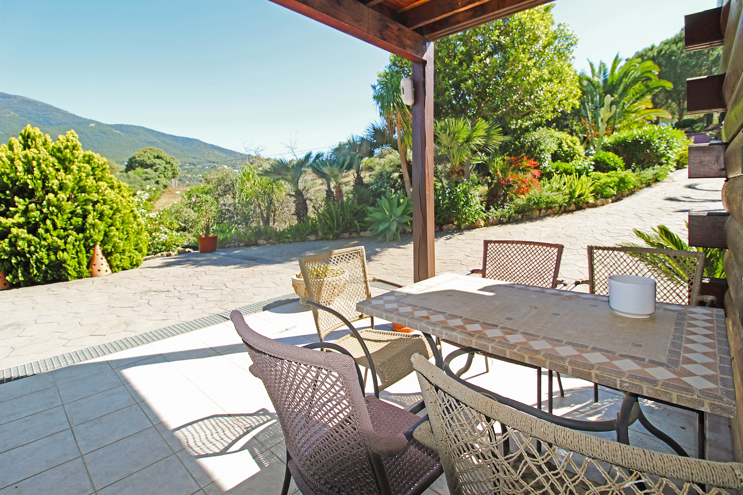 Når du er kommet gennem køkken og stue, kan du gå lige ud på den store terrasse med flot udsigt over bjergene. Stuen har store vinduer, som gør at det strømmer ind med fantastisk naturligt lys.