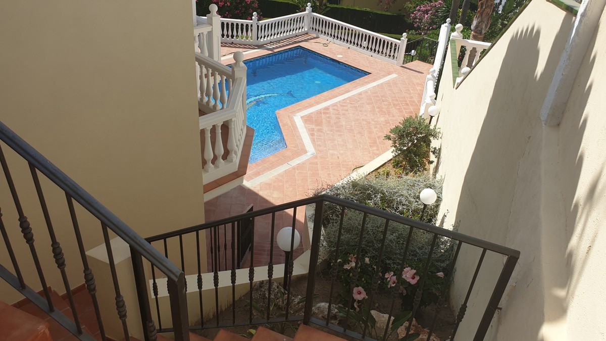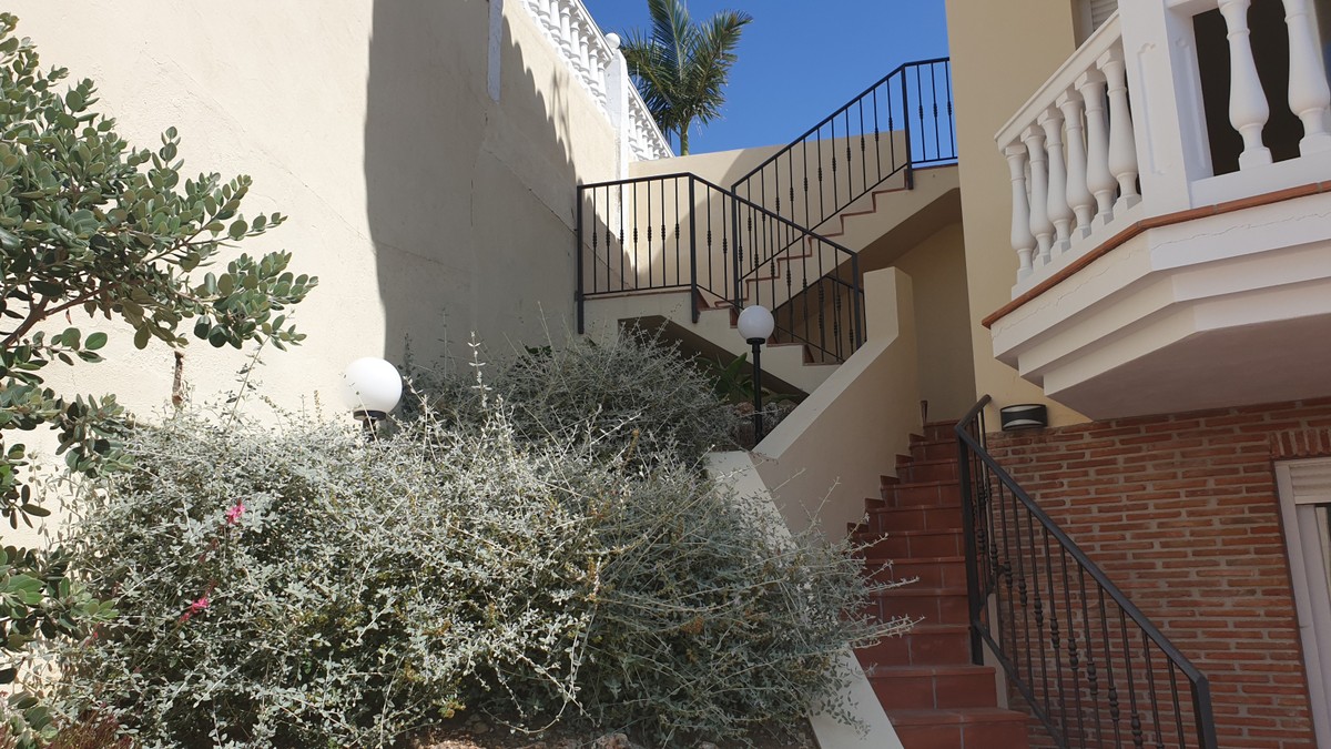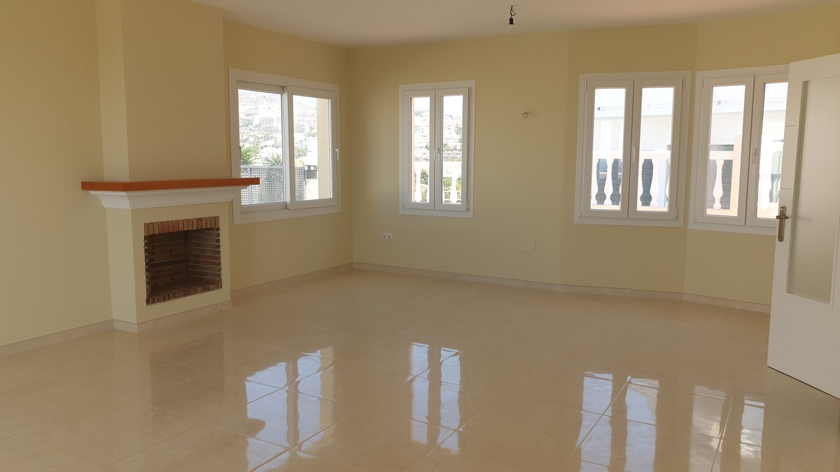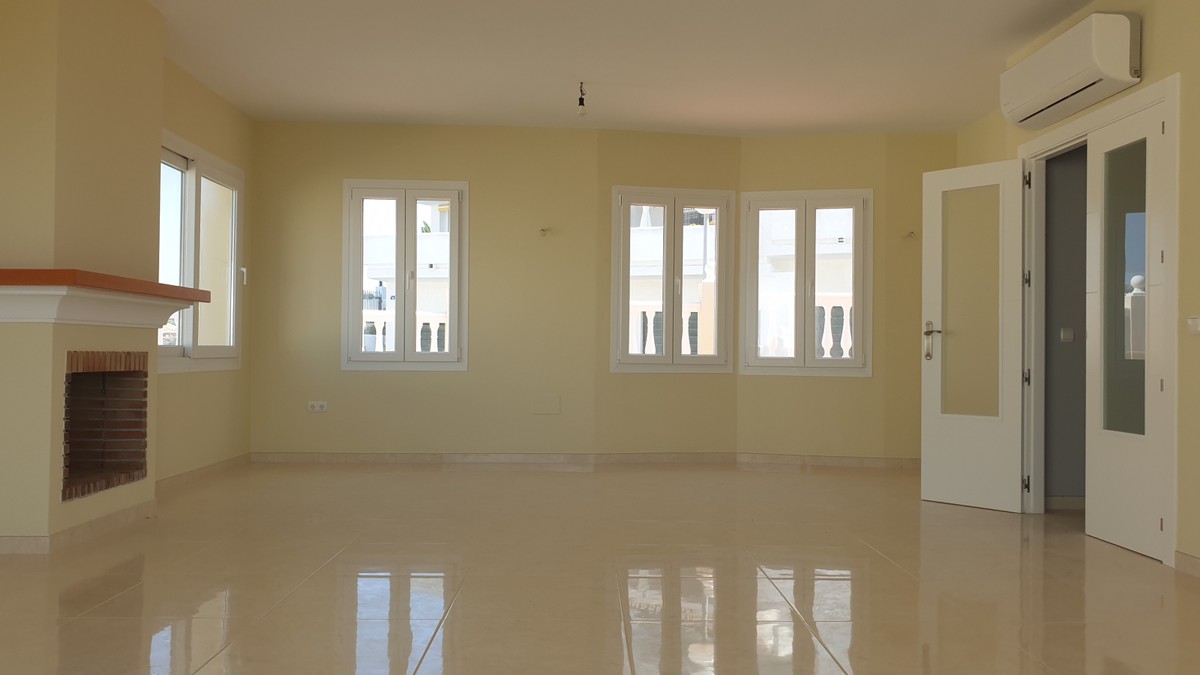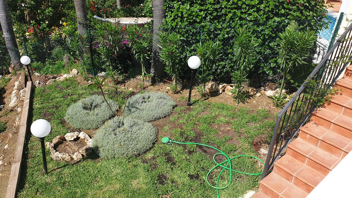 Built on 3 floors the villa is distributed as follows: Main entrance via a floor to ceiling double door leading into a nice sized entrance hall, to the left of the entrance there is a large fully fitted, top of the range kitchen with integrated appliances and granite worktops, together with a small utility room which leads off from the kitchen. To the right of the hall is a large bright and airy lounge with a fireplace leading onto an open terrace that runs the length of the villa. Off the entrance hall we find a lovely good sized contemporary guest bathroom and stairs leading to the lower levels. Down one flight of stairs we find a very large master bedroom with an en suite full sized bathroom and enough partitioned space ready to install a walk in dressing room, a further 2 good sized bedrooms with fitted wardrobes, one of these bedrooms has a privately accessed covered terrace, there is also another full large contemporary bathroom and also another large covered terrace that runs the length of the villa on this level. The lower floor has direct access to the garden and comprises of a very large bedroom/games room and a large storage room