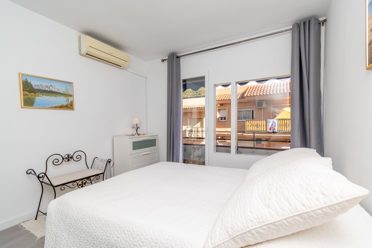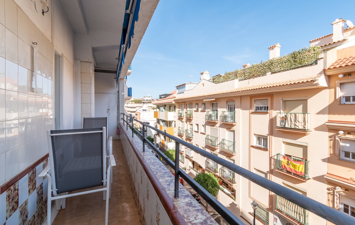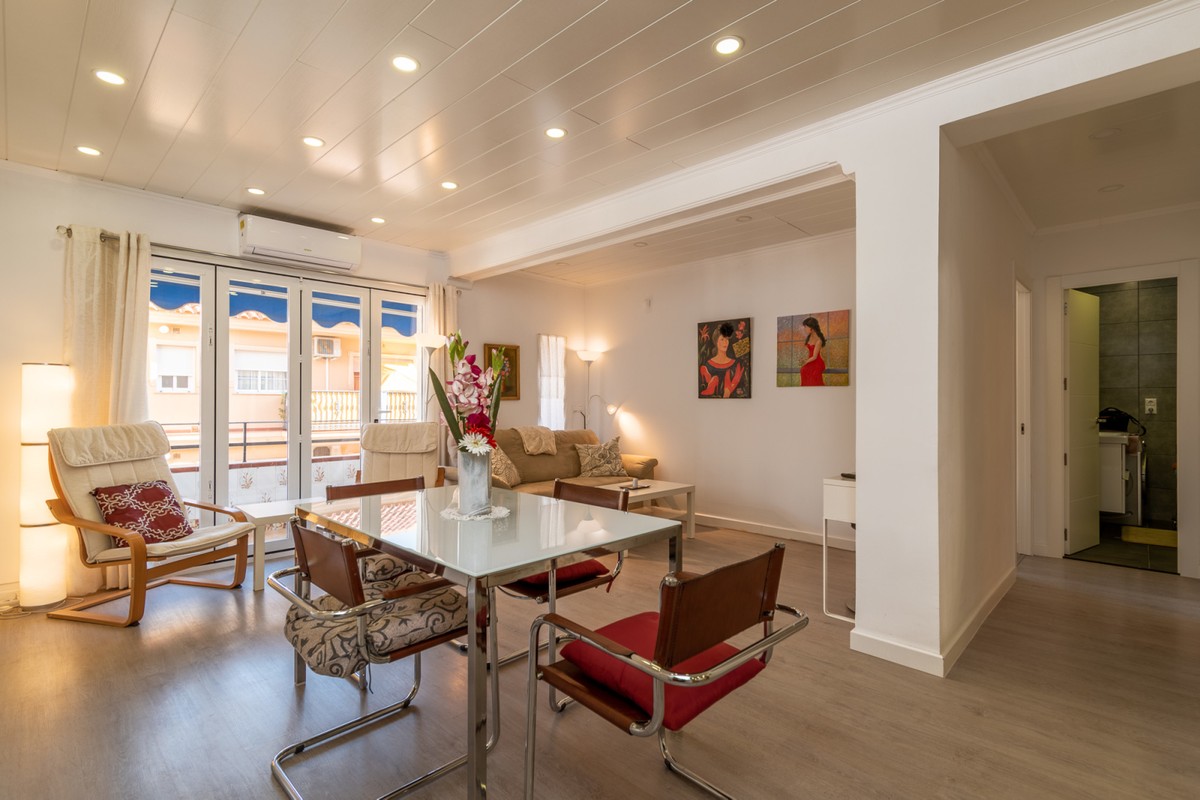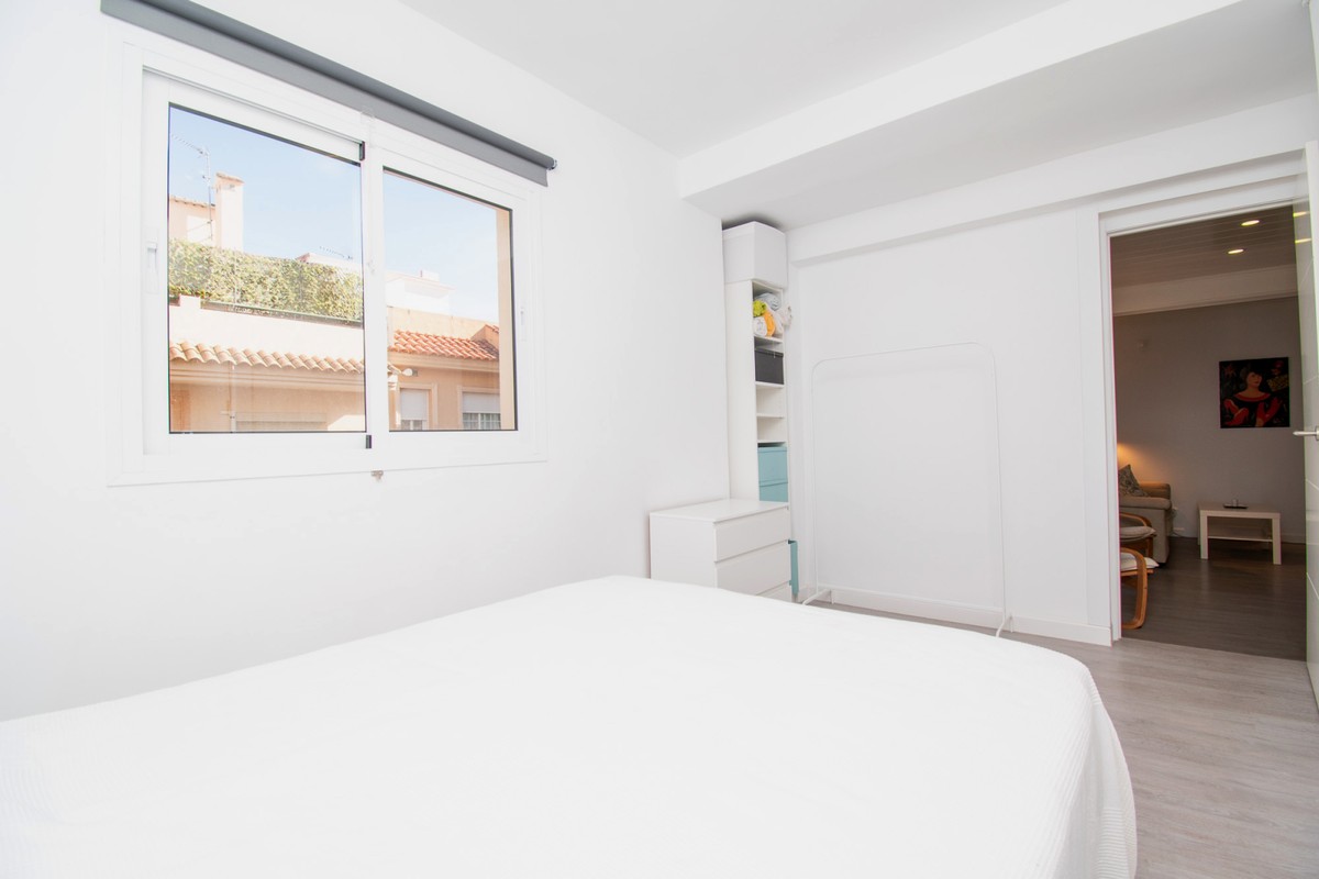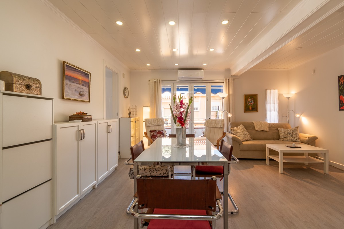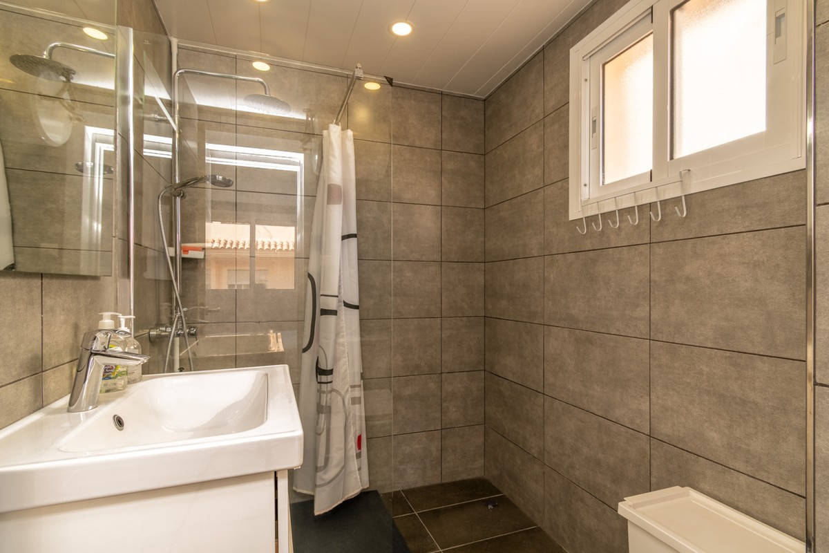 Welcome to this fantastic, fully renovated apartment in the centre of Fuengirola! The apartment is located on the third floor in a block with a communal roof terrace on a quiet street close to absolutely everything in the heart of town such as the church square, train station and the beach! The apartment has been totally renovated with new floors, kitchen and bathrooms in Scandinavian stye and is in excellent condition. Air conditioning has been installed throughout and all appliances are brand new. There is a long, but not wide terrace with some seating space and oversized windows and doors have been installed to make the most of the light and to connect the indoor space with the outdoors. The open-plan kitchen, dining and living rom is spacious and very inviting with plenty of sitting areas to watch TV or read a good book. The main bedroom is large, with built-in wardrobes, direct access to the terrace and a separate, oversized bathroom with shower.. The second bedroom has a dressing area and an ensuite bathroom with shower. The third bedroom is smaller, also with built-in wardrobes. This is an excellent apartment as a holiday home, investment to rent or a family home. At this price it's a real bargain and must be seen!