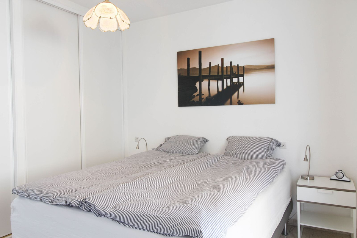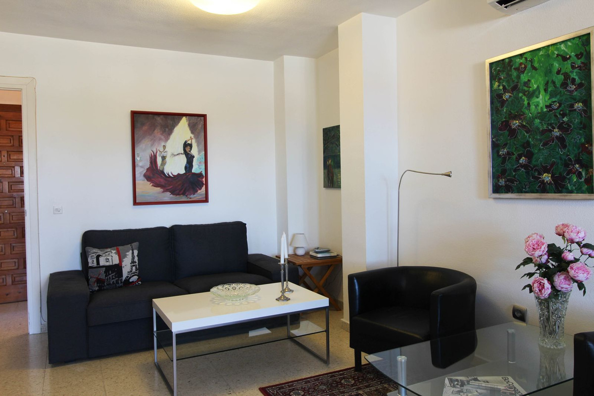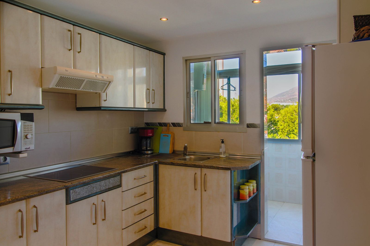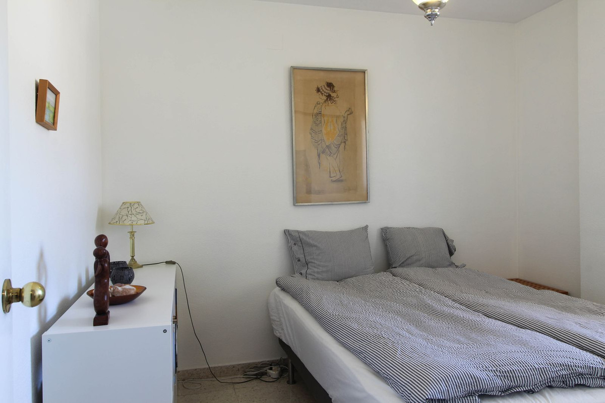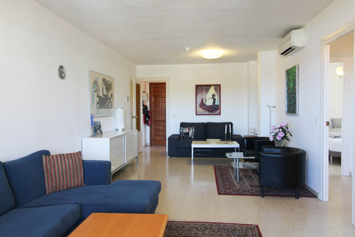 Fra det ene soveværelse er direkte adgang ud til en mindre altan med storslået udsigt til Mijas-bjergene. På samme gang som soveværelserne findes lejlighedens badeværelse. Stor lys stue med to sofa-afdelinger, aircondition samt adgang til terrassen/spisestuen, hvor du har udsigt til byen og bjergene. Udstyret køkken med god bord- samt skabsplads. I forlængelse af køkkenet via en dør, findes vaskerummet med vaskemaskine. Til lejligheden medfølger garage med plads til scooter, cykler og diverse.
