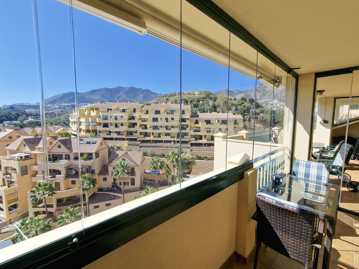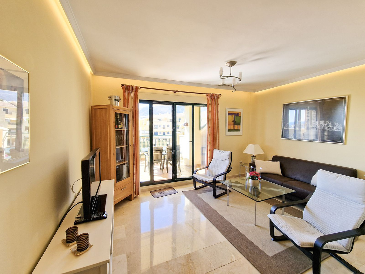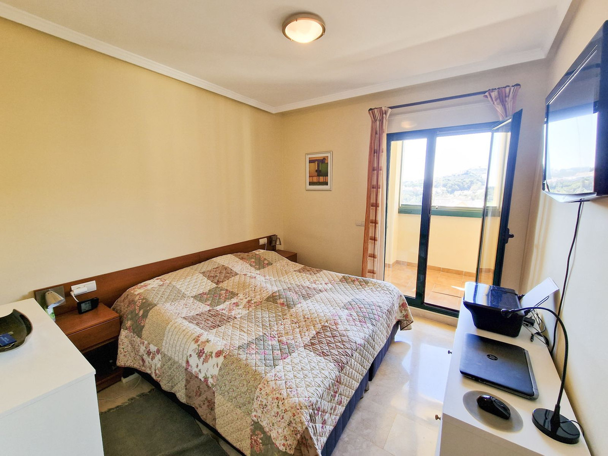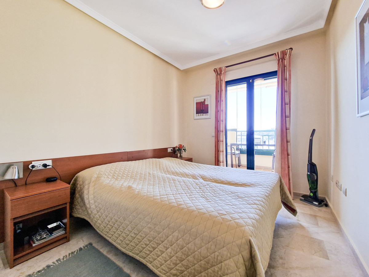 Lejligheden tilbyder en behagelig og afslappende atmosfære med to gode soveværelser, det ene med direkte adgang til terrassen samt indbyggede skabe. Fuldt udstyret køkken og rummelig stue med spise- og sofaafdeling, der fører ud til den private terrasse. Terrassen er det perfekte sted at slappe af og nyde den fantastiske udsigt, og den er delvist dækket af glasskydegardiner, så den kan nydes hele året rundt.