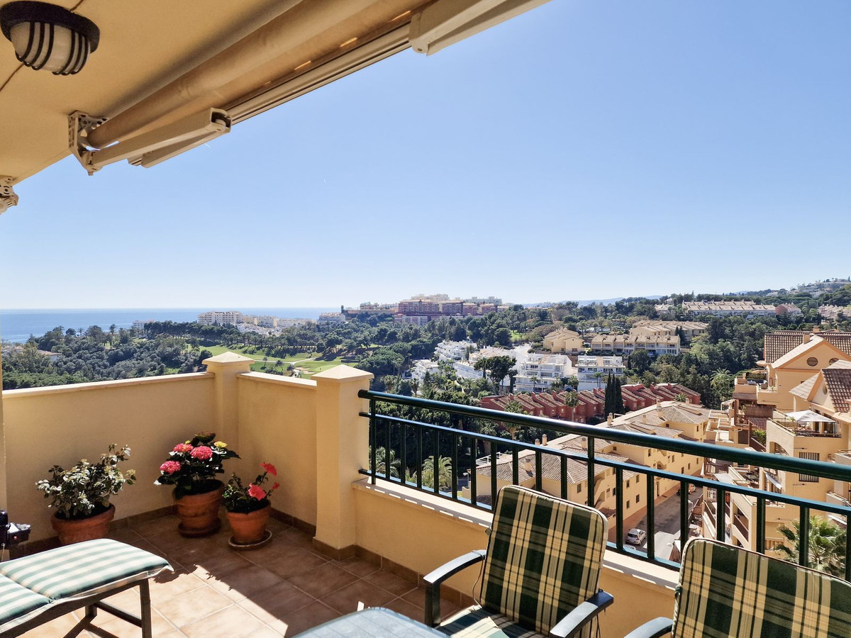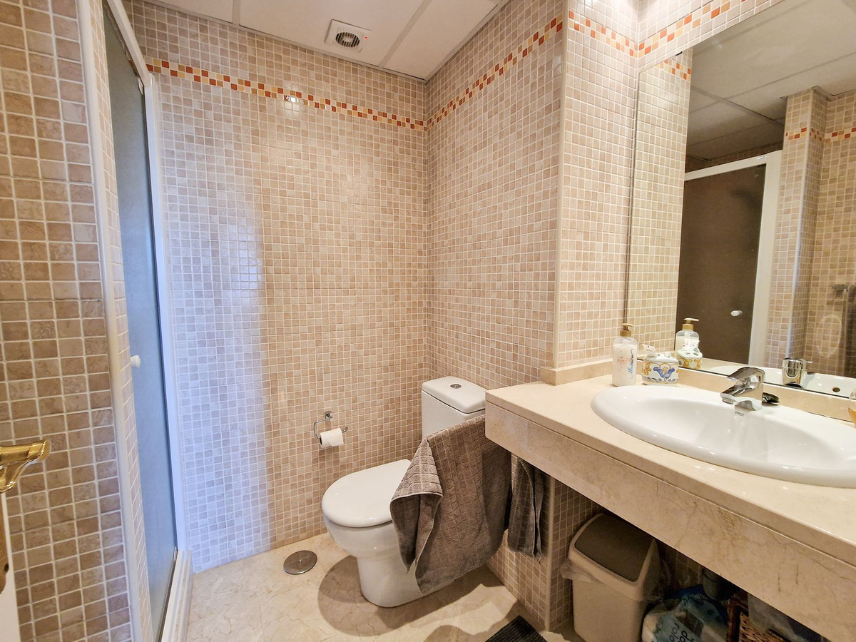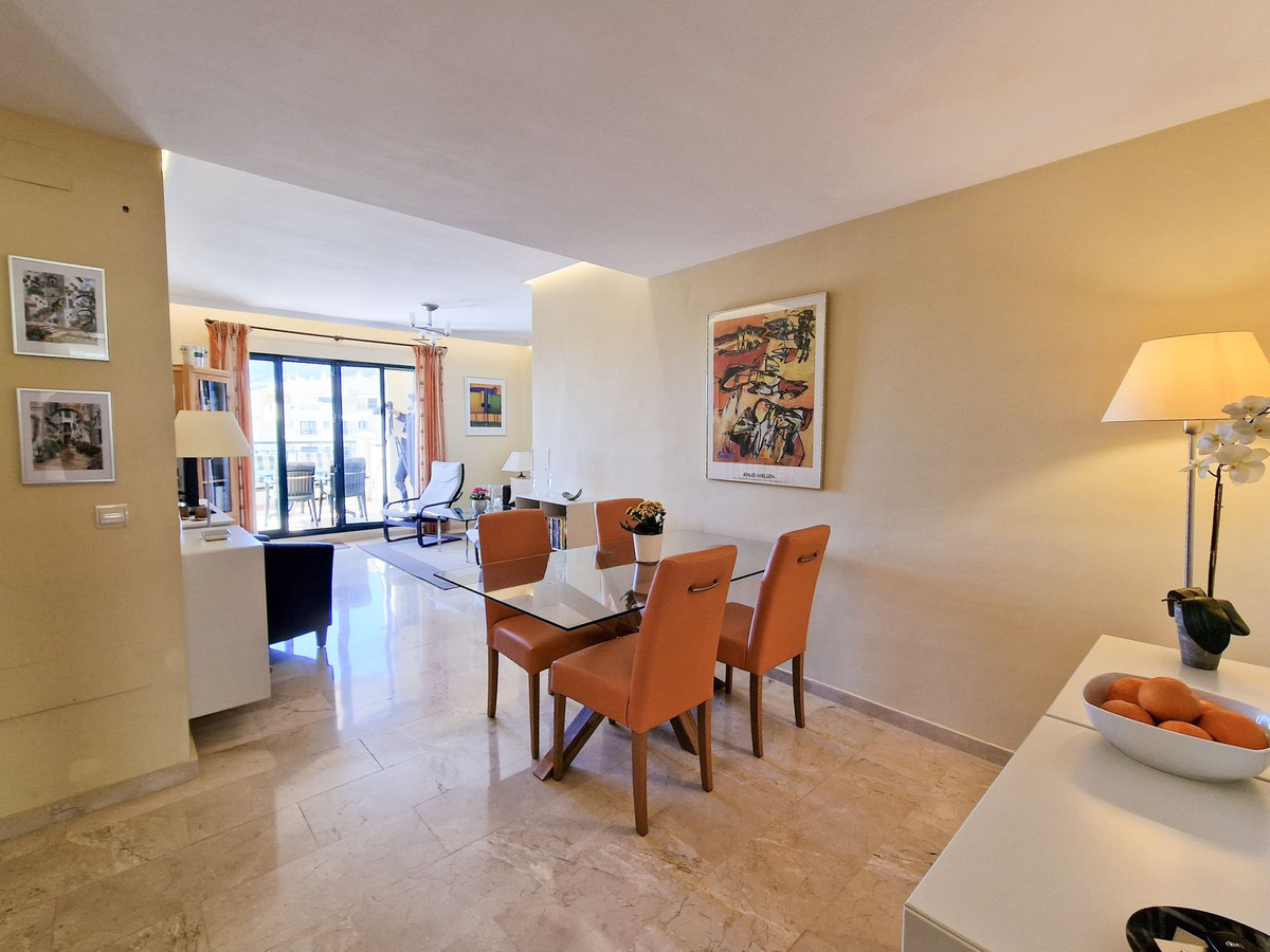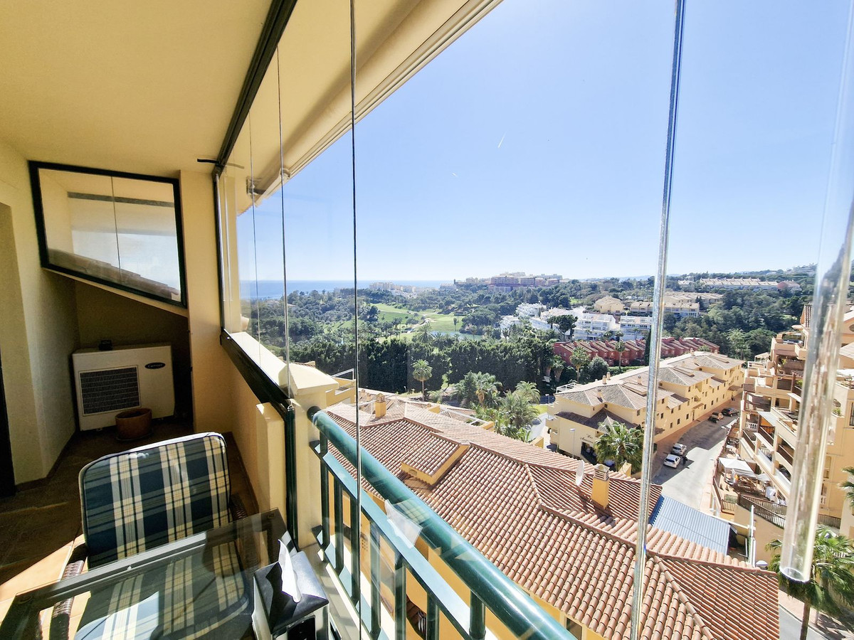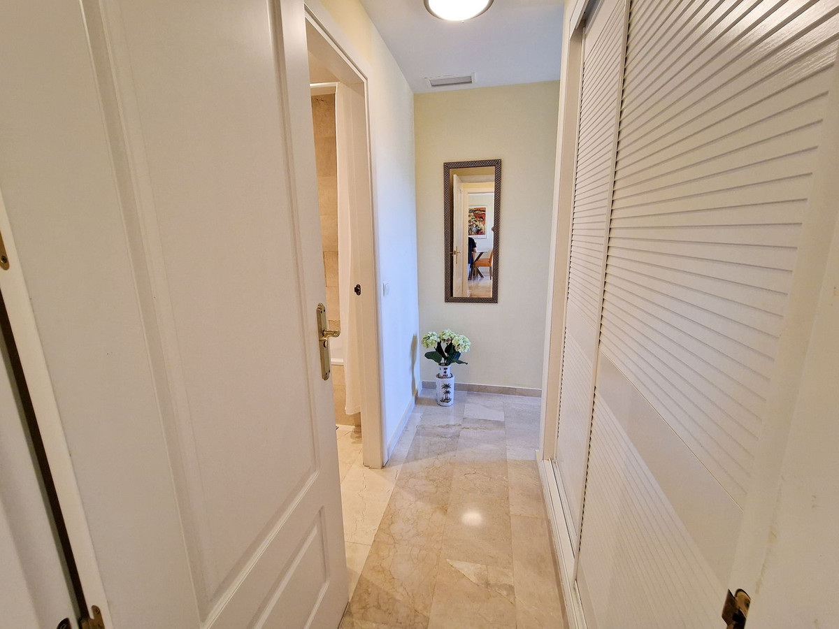 Lejligheden tilbyder en behagelig og afslappende atmosfære med to gode soveværelser, det ene med direkte adgang til terrassen samt indbyggede skabe. Fuldt udstyret køkken og rummelig stue med spise- og sofaafdeling, der fører ud til den private terrasse. Terrassen er det perfekte sted at slappe af og nyde den fantastiske udsigt, og den er delvist dækket af glasskydegardiner, så den kan nydes hele året rundt.