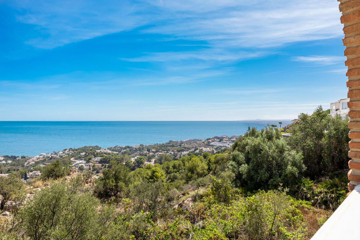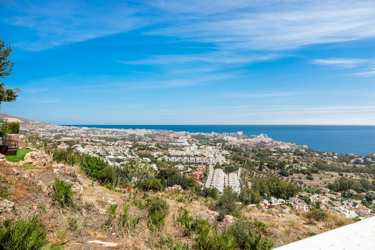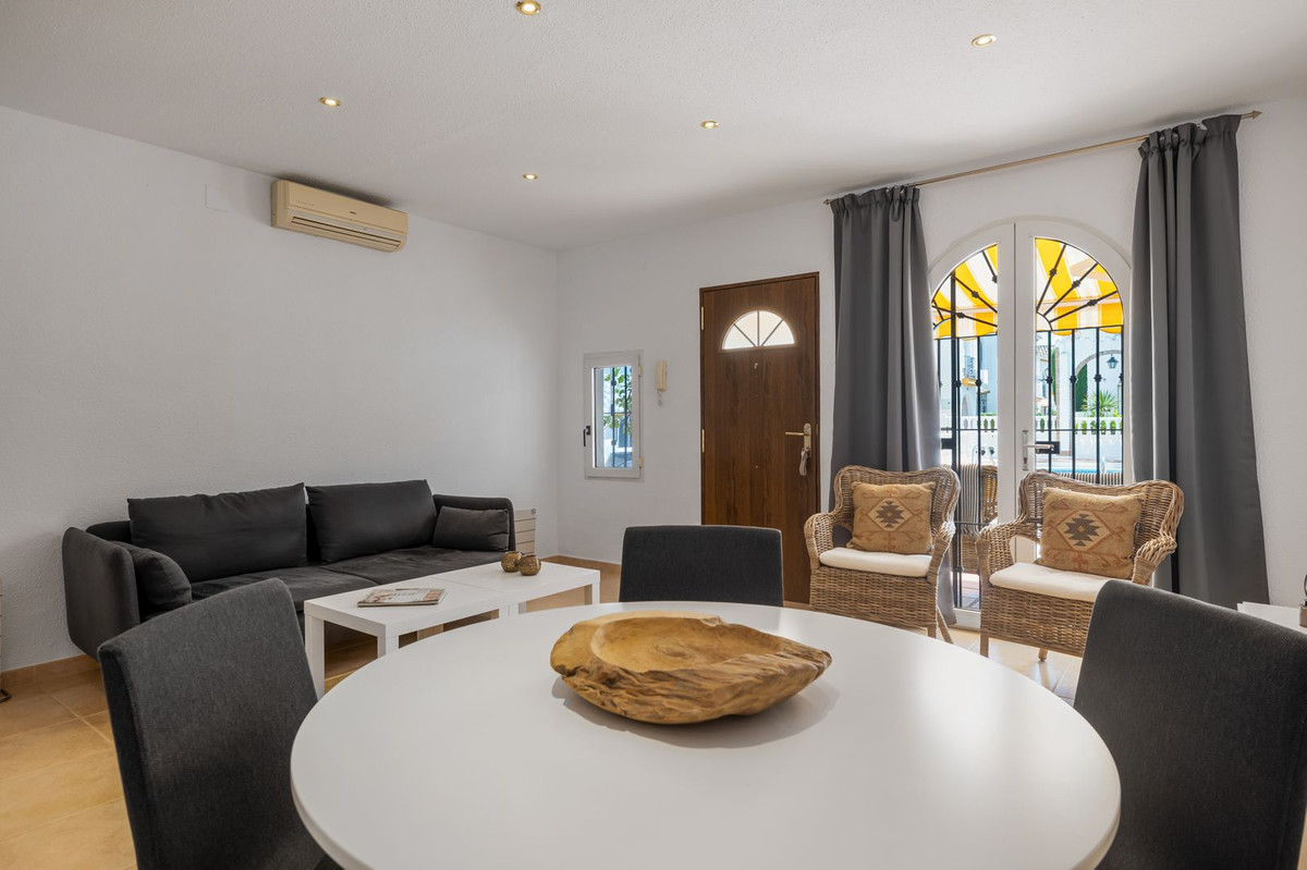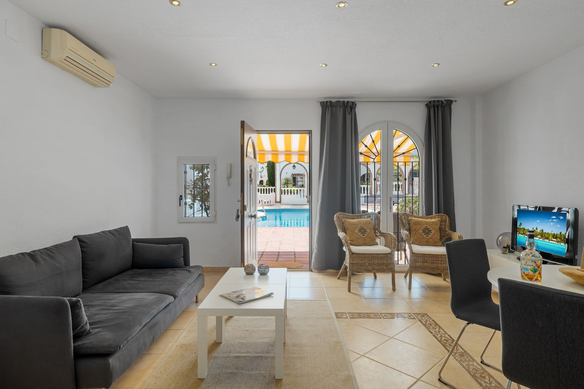 Massere af lysindfald fra vinduer og døre i begge ender af boligen, som henholdsvis giver adgang til den private terrasse med udsigt til bjerge og havet - og hoveddøren som fører ud til kompleksets ene ud af to swimmingpools.