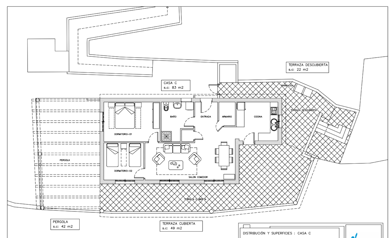 Huset er 83 kvm og består af to soveværelser, et badeværelse med bruser og vaskemaskine, stort fuldt udstyret køkken, stue med spiseplads og et walk-in-closet. Hele huset er omgivet af en vidunderlig terrasse, og der er åbningsdøre fra terrassen ind til alle rummene, så det er nemt at bevæge sig rundt. Der er også en pergola på over 40 m², udendørs opbevaring på 7 m² og et muret grillområde. Se den vedlagte plantegning.