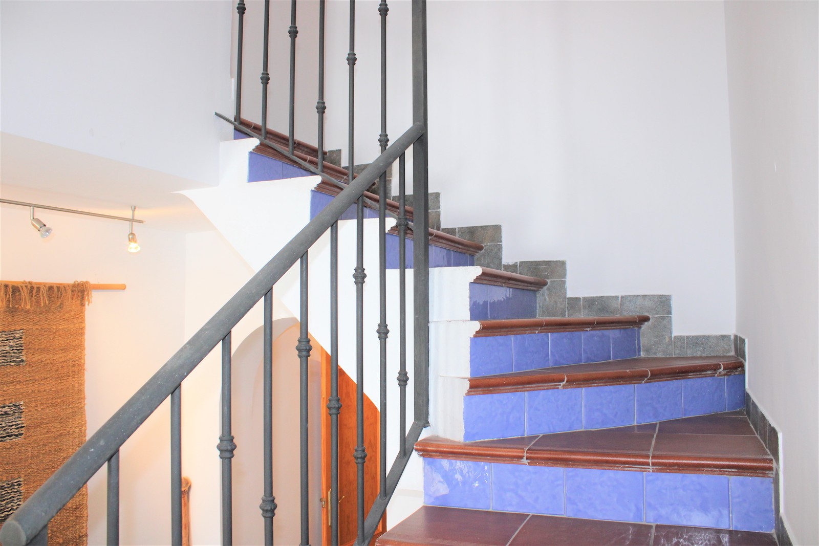 We make our way up to the first floor, where we have the second bedroom and bathroom. A balcony is reached that bedroom, with lots of light and also some views. Then we make our way to the living room, which is on the same level. Here we have the exit to the first terrace, with lovely views of the sea.