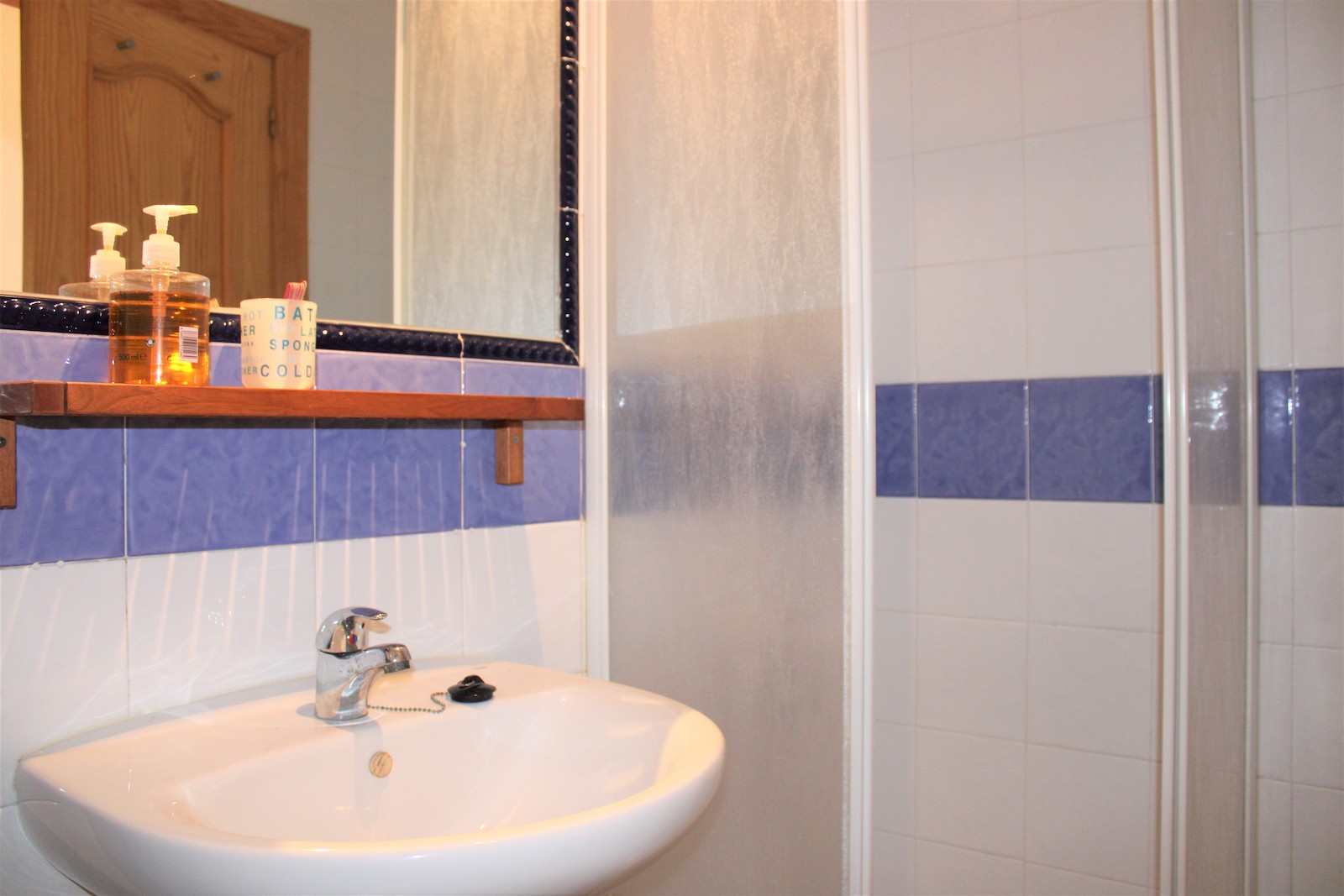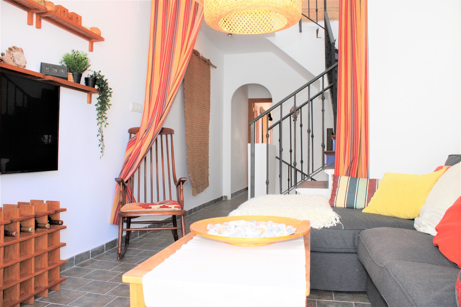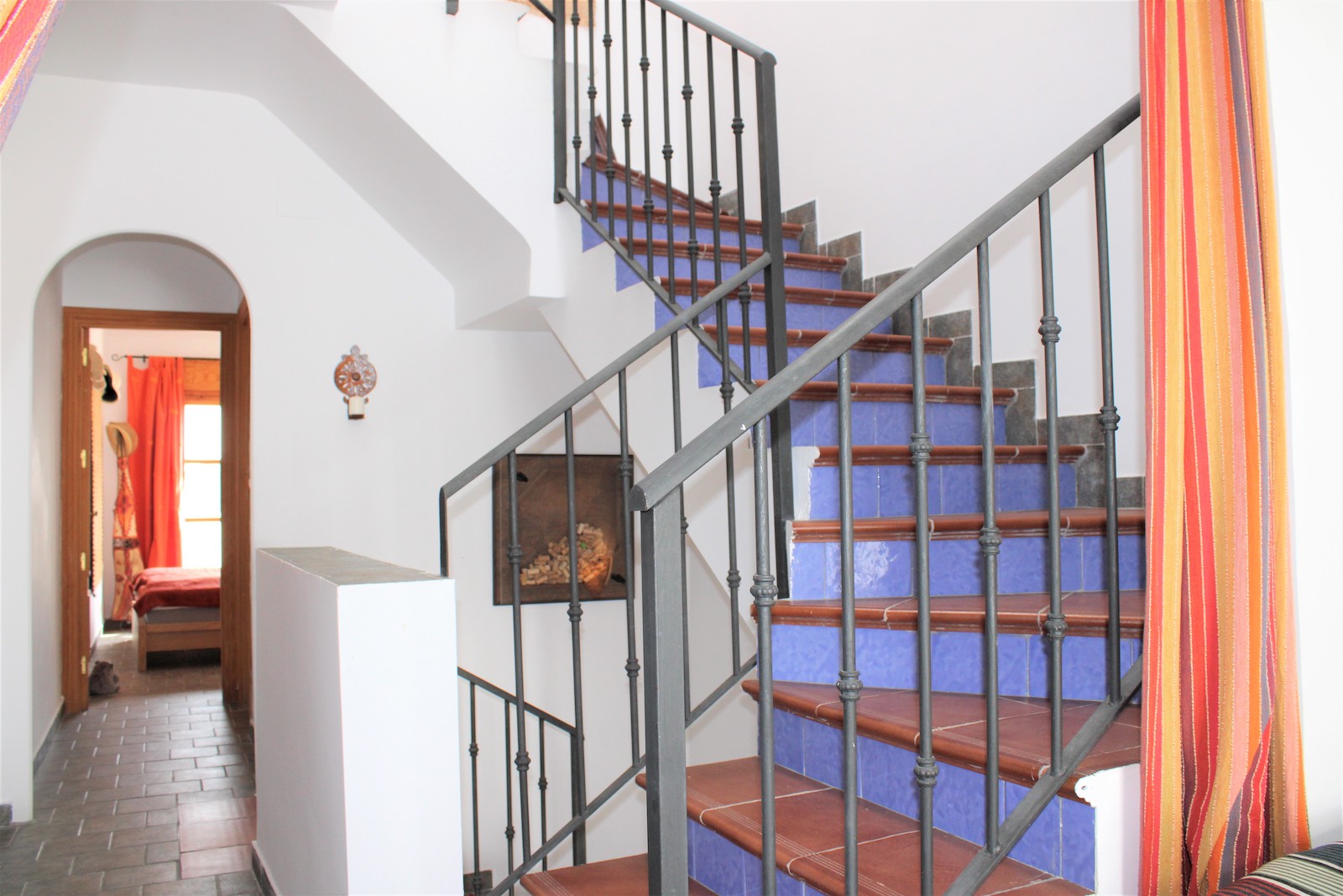 At the entrance directly to the right, we find a fully equipped kitchen with all the necessities. Furthermore, we have a dining area under the stairs leading to the first floor. The first bathroom of two is next and then comes the first bedroom of two. Adjacent to the bedroom there is a patio with plenty of light, where breakfast can be enjoyed.
