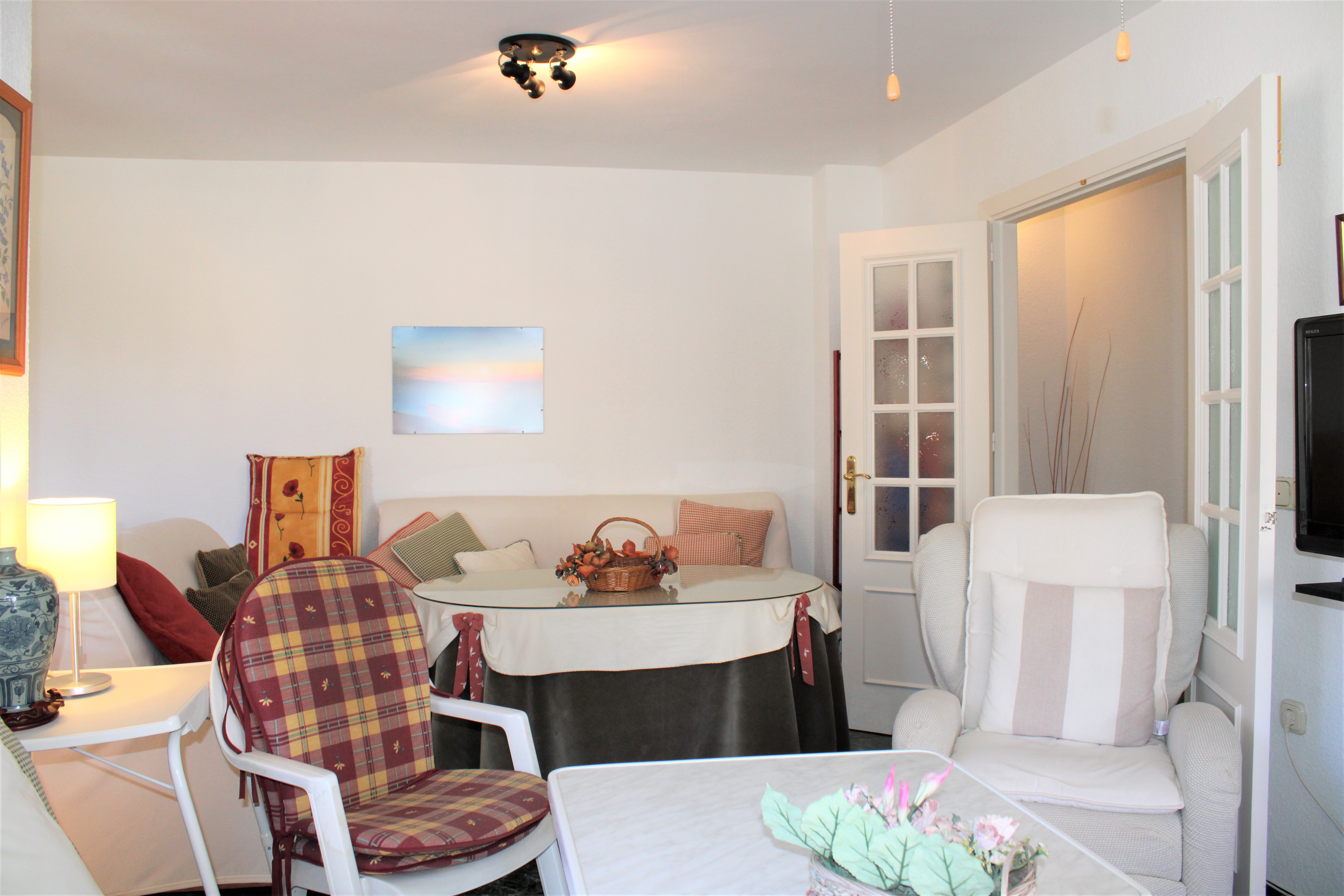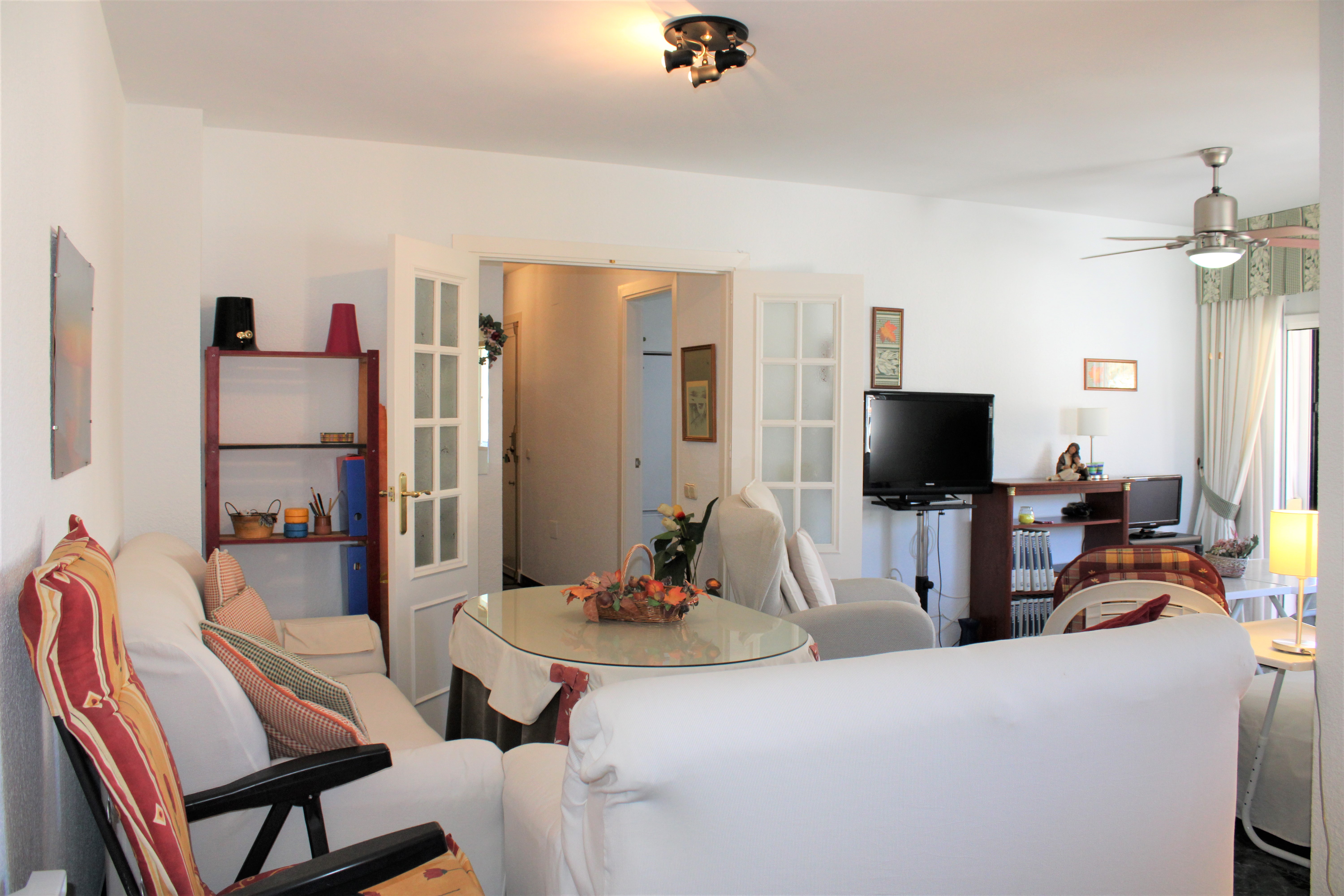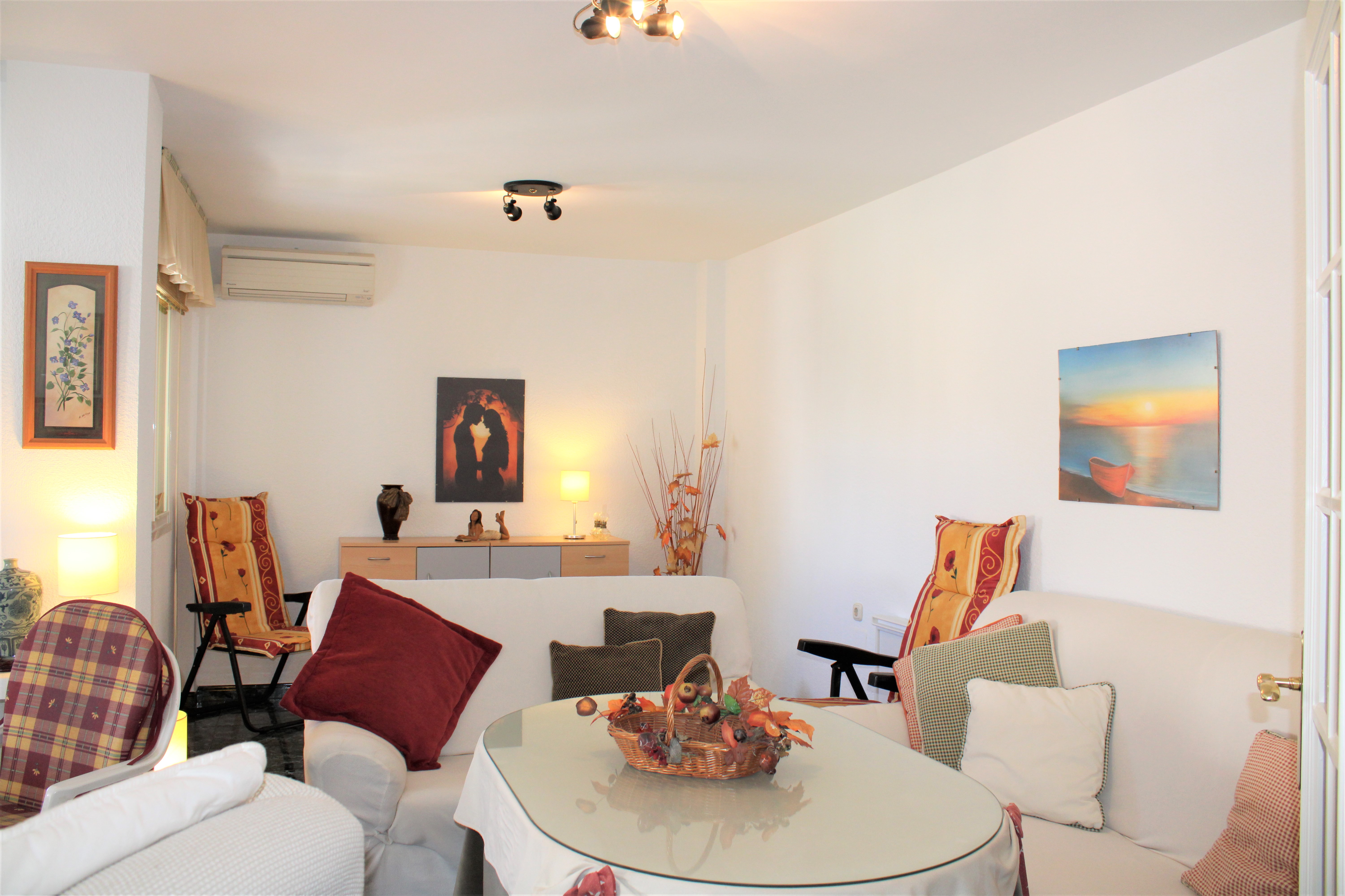 Lejligheden har to soveværelser og to badeværelser, et soveværelse med eget badeværelse. Begge soveværelser har loftsventilatorer og garderober, indbyggede skabe er også tilgængelige på gangen. Et lyst fuldt udstyret køkken med opvaskemaskine og en stor lys stue med spiseplads. Stuen har både loftsventilator og aircondition og støder op til den dejlige terrasse hvor man kan sidde og nyde aftensolen efter en dejlig dag på stranden.
