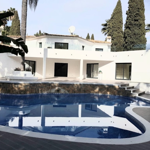 Rummelige værelser åbner ud til de forskellige terrasser omkring ejendommen, og layoutet er perfekt til at nyde alle aspekter af huset og den dejlige udsigt, der inkluderer havet. I stueetagen er en indbydende stue / spisestue, separat moderne køkken, fire soveværelser og tre badeværelser. Ovenpå er en anden stue med terrasse og det store soveværelse med eget badeværelse og omklædningsrum. Grunden er meget overskuelig og udendørsarealerne er en fryd med veranda, solterrasser og en stor pool (7 m x 4 m).