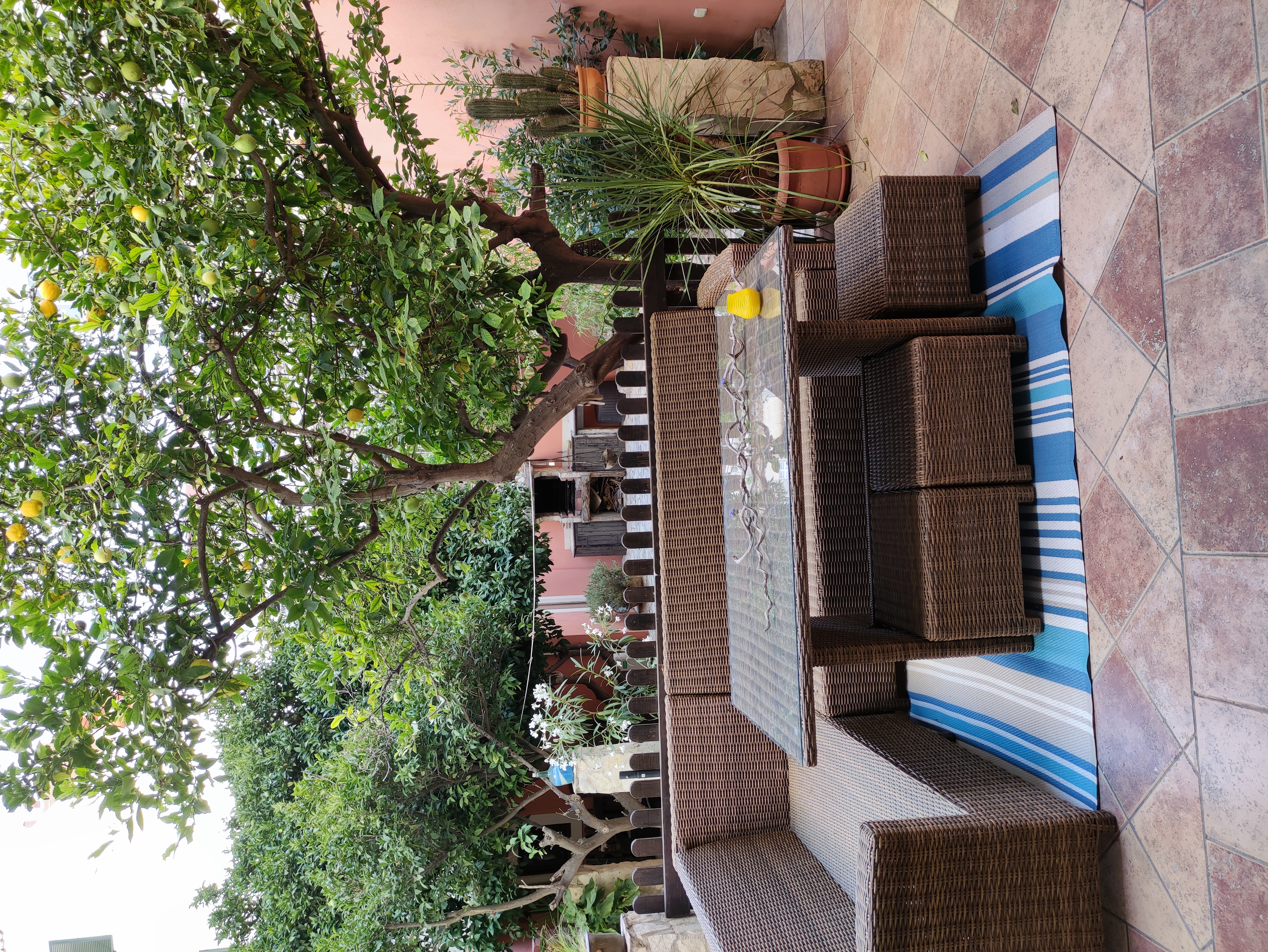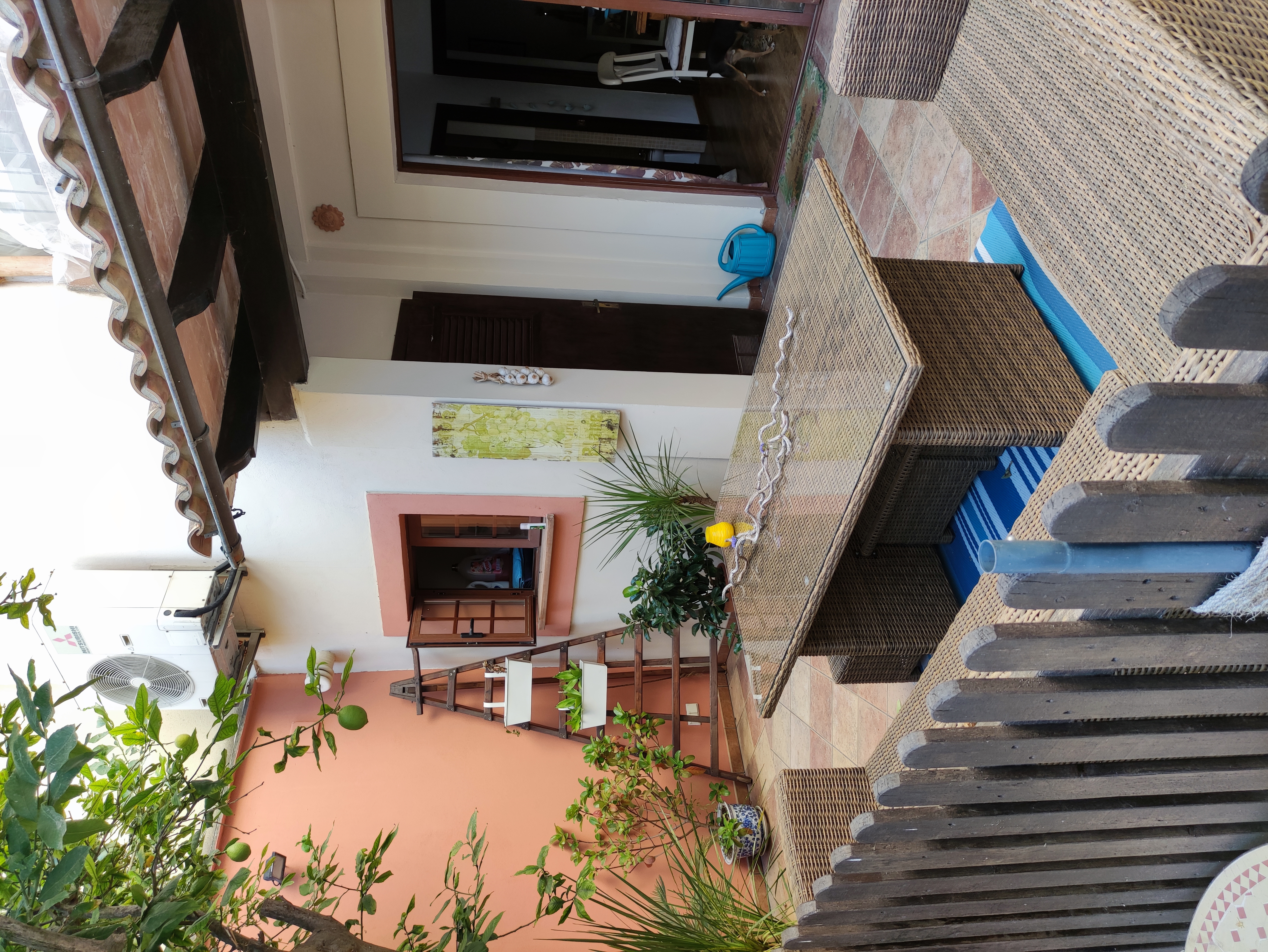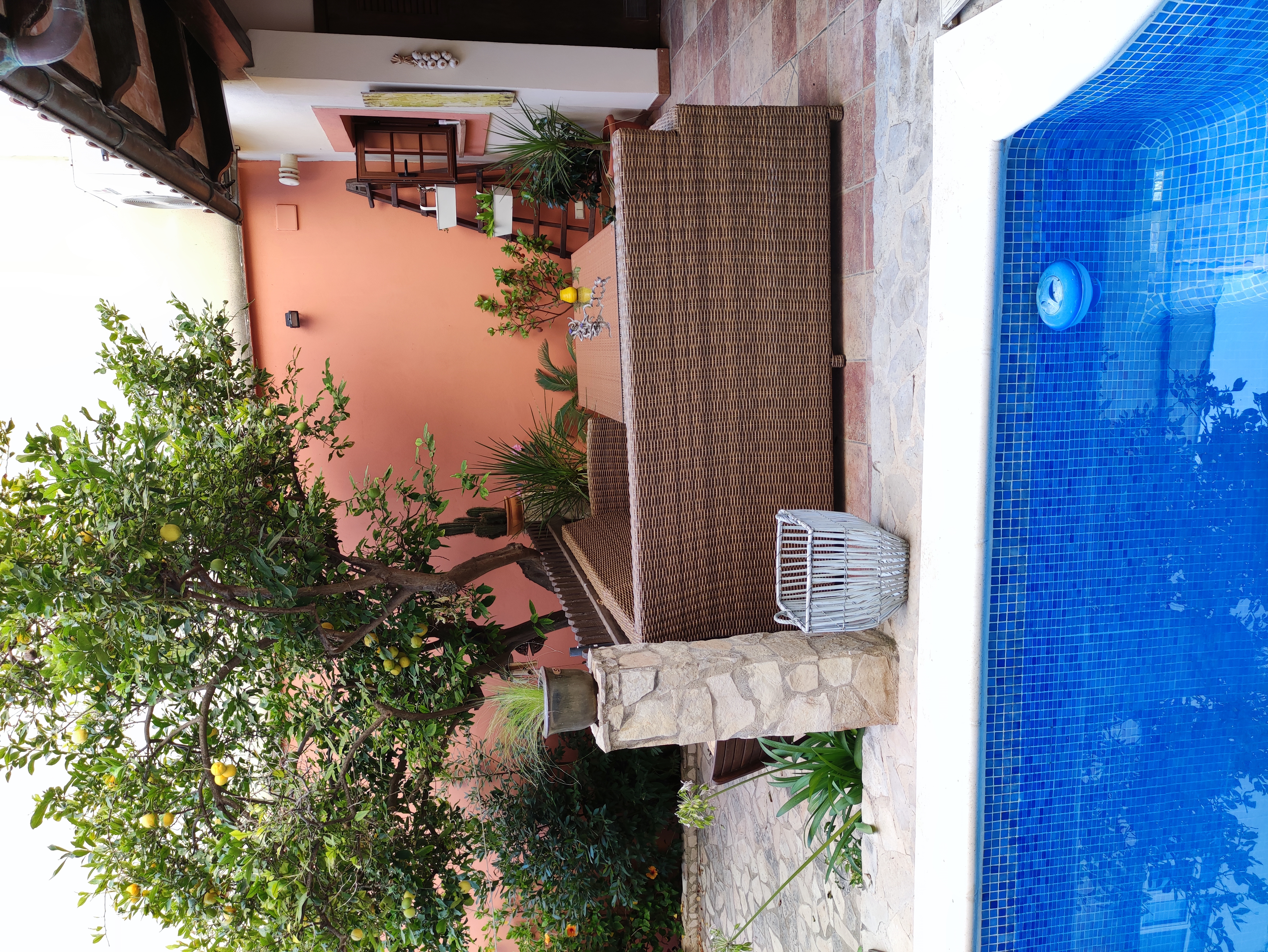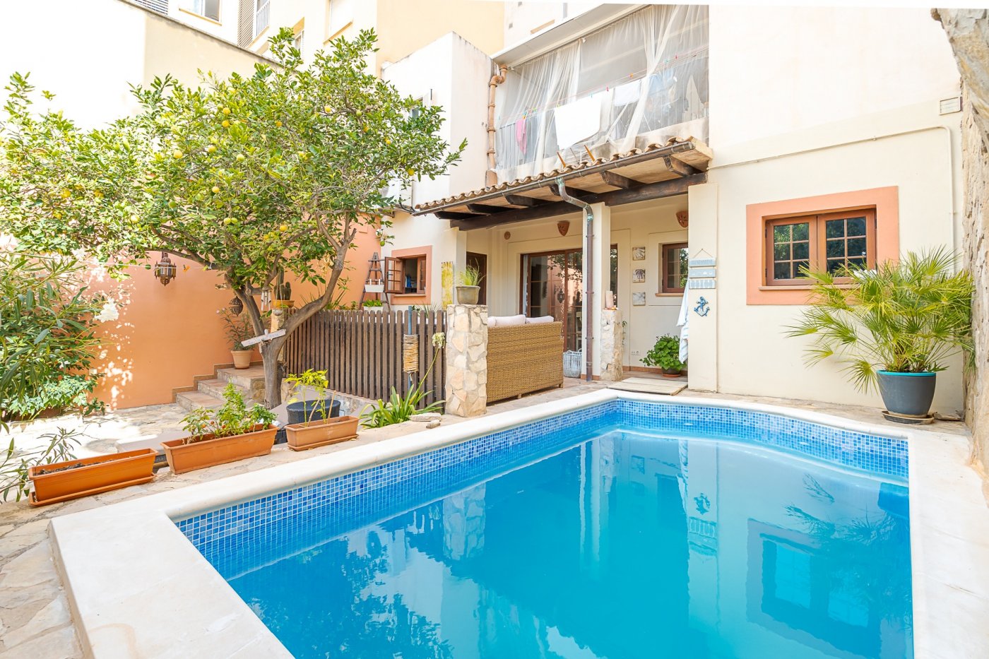 Ved udgangen til terrassen findes et vaskerum med plads til vaskemaskine, tørretumbler og vaskerum. Bortset fra terrassen med veranda, der går ned ad trappen, vil du blive overrasket over terrassen som er omkring 105 meter. Der er en lille privat swimmingpool, chill-out område, grill og frugttræer (blandt andet appelsin-, citron- og mandarin træer). Der findes også et casita med selvstændig varm/kold aircondition, som kan bruges som et opbevaringsrum eller som et ekstra rum (motionscenter, værksted osv.). Alt dette tilføjede det faktum, at ejendommen er beliggende i centrum af Palma, og kun 150 m fra "avenidas". Det har alle de nødvendige faciliteter i nærheden: supermarkeder, busstoppested, restauranter og lokale osv.
