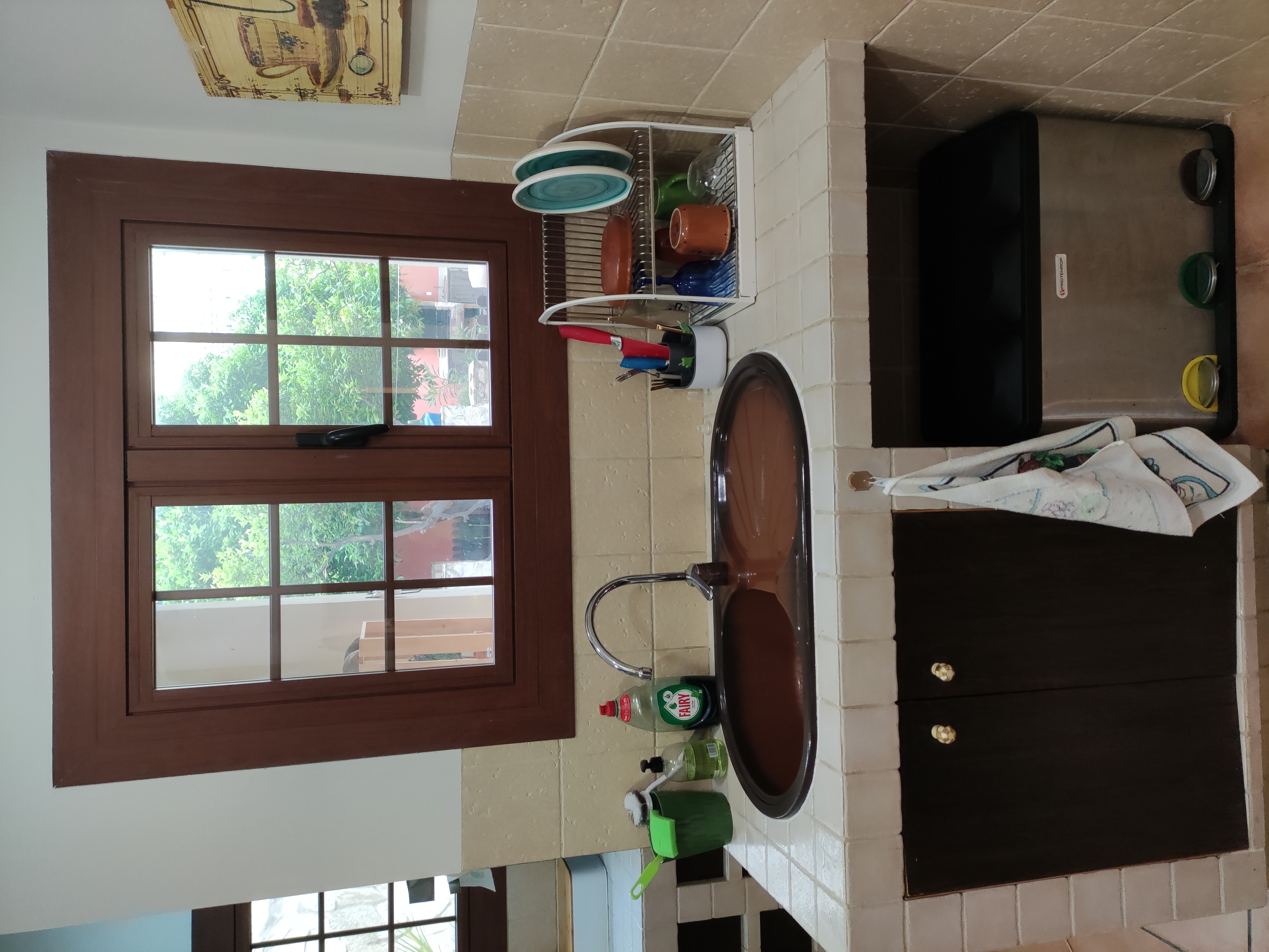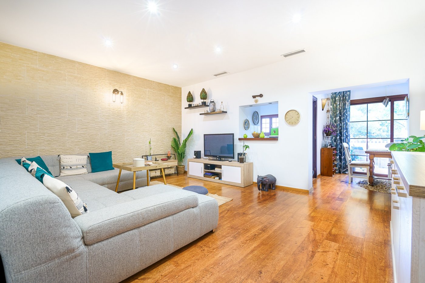 Lejligheden har en separat hall med store skabe, 3 soveværelser med dobbeltsenge (2 af dem med indbyggede skabe med masser af plads), 2 badeværelser, et af dem en-suite i master soveværelset, med stort badekar, og det andet med stor bruser; en rummelig stue, en spisestue med masser af lys og udsigt til terrassen, og et køkken, med rummeligt spisekammer og bar.
