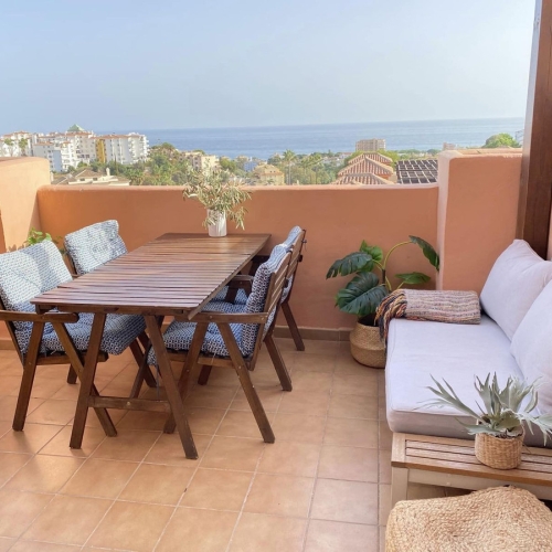 The property is a spacious contemporary south west facing apartment with stunning mountain views . Situated on the first floor with a lift , the apartment is on two levels with air conditioning throughout.