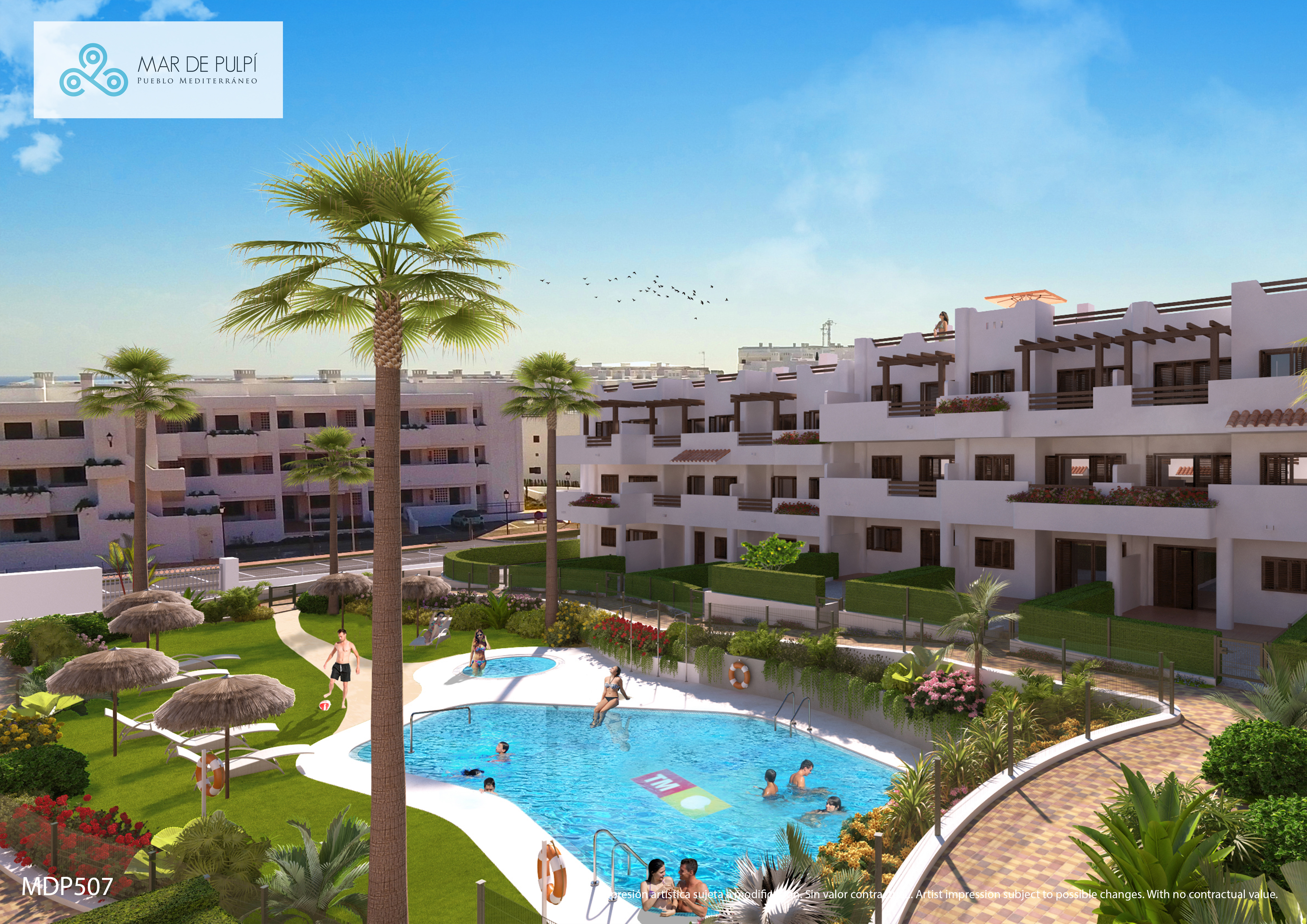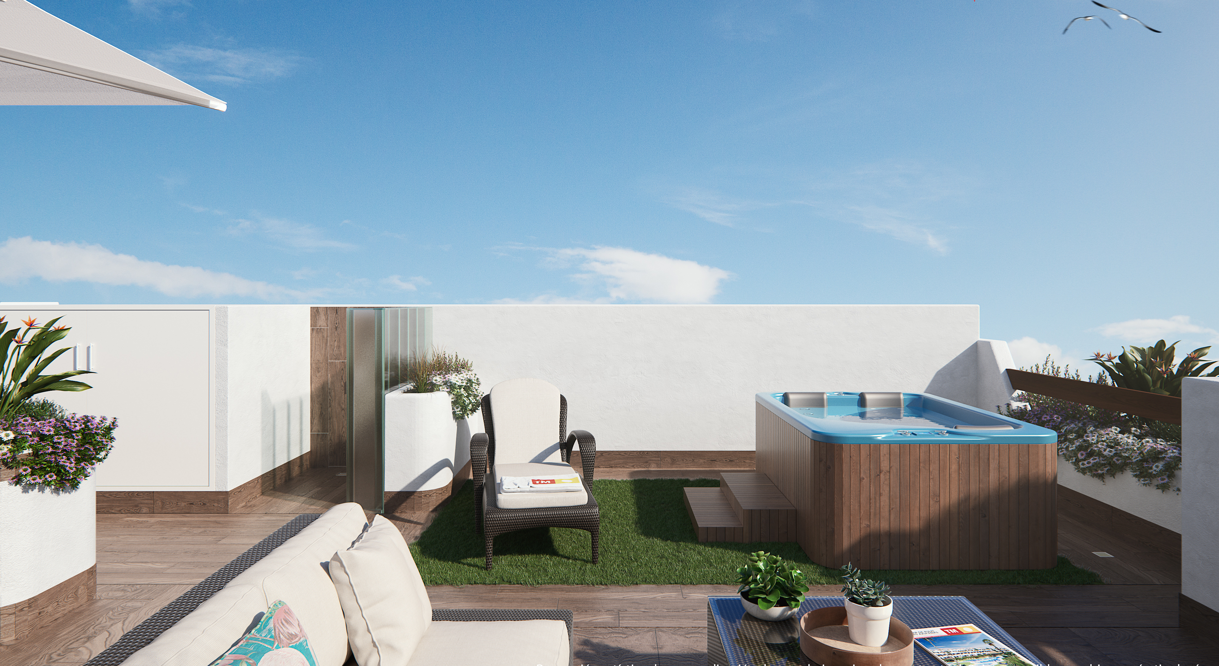 Lejlighederne i stueetagen har en overdækket terrasse samt en udendørs have med direkte adgang til gangbroerne, der fører til poolen. Udendørs arealet er ideelt, hvis du har lyst til at slappe af i skyggen eller solbade i privatlivets fred.