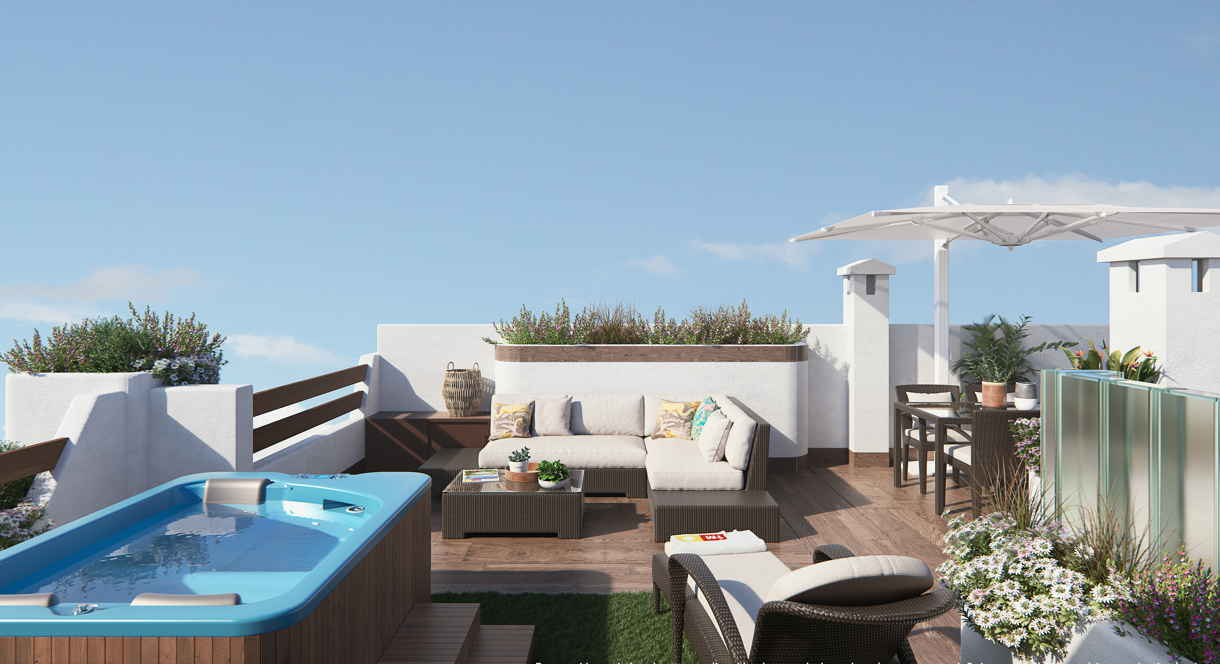 1, 2 og 3 værelses lejligheder, der har store terrasser, hvor man kan spise morgenmad eller solbade.