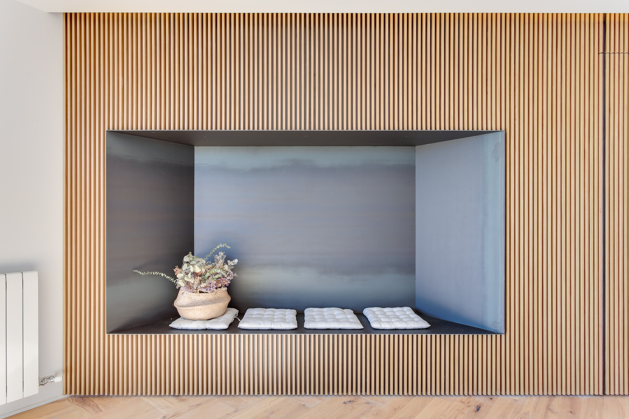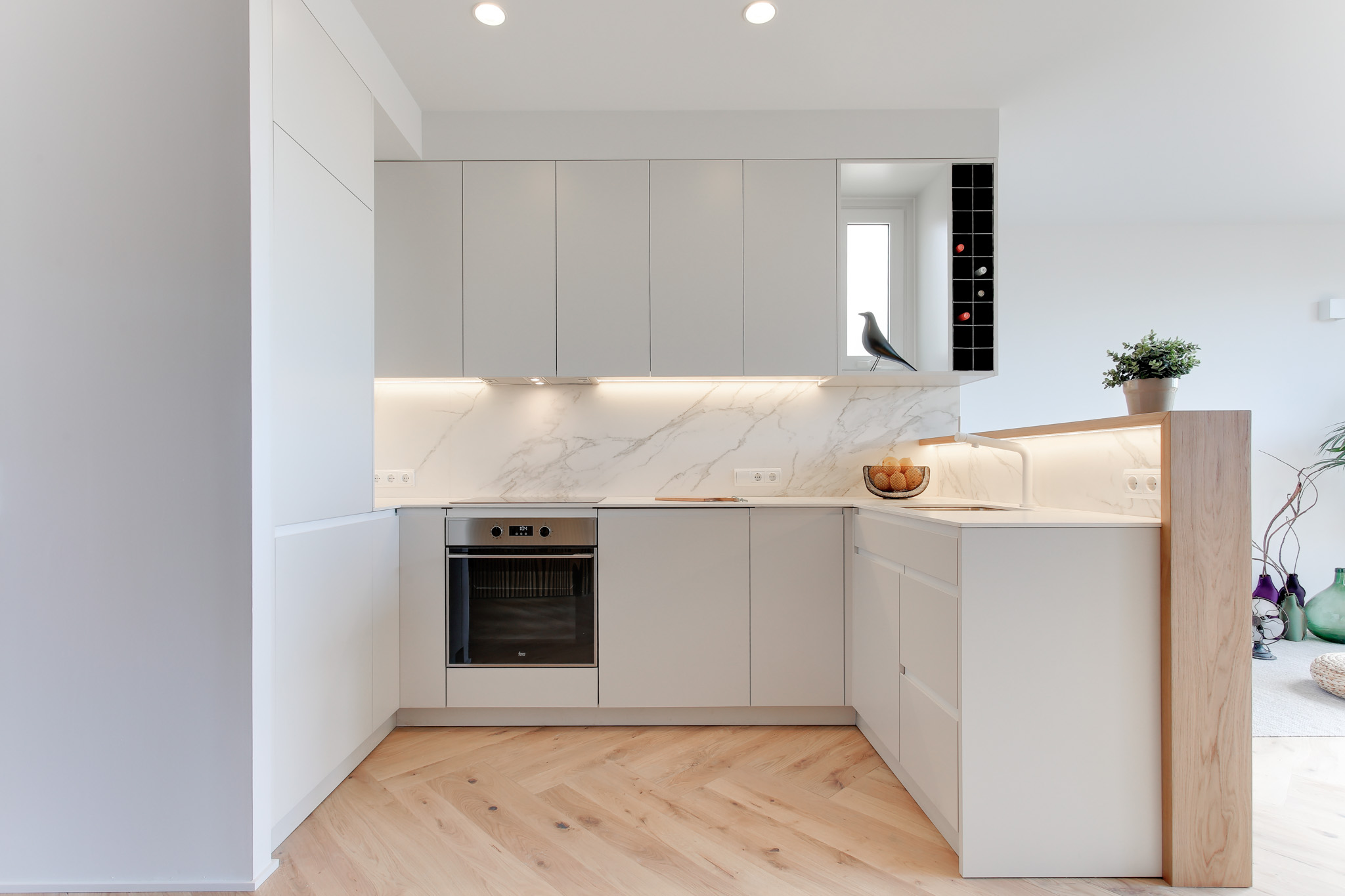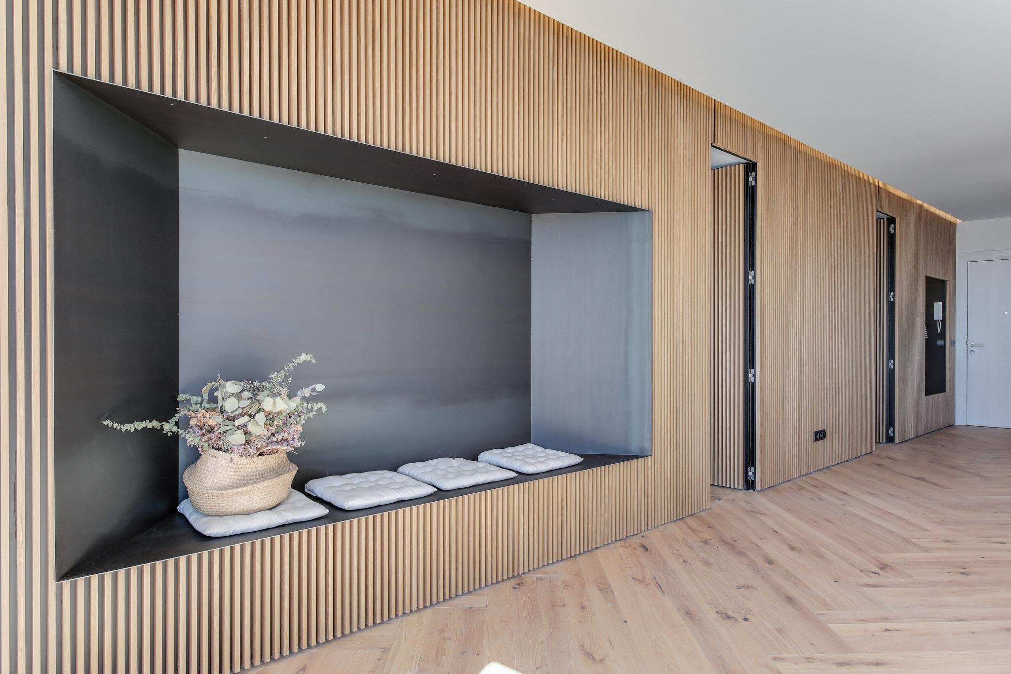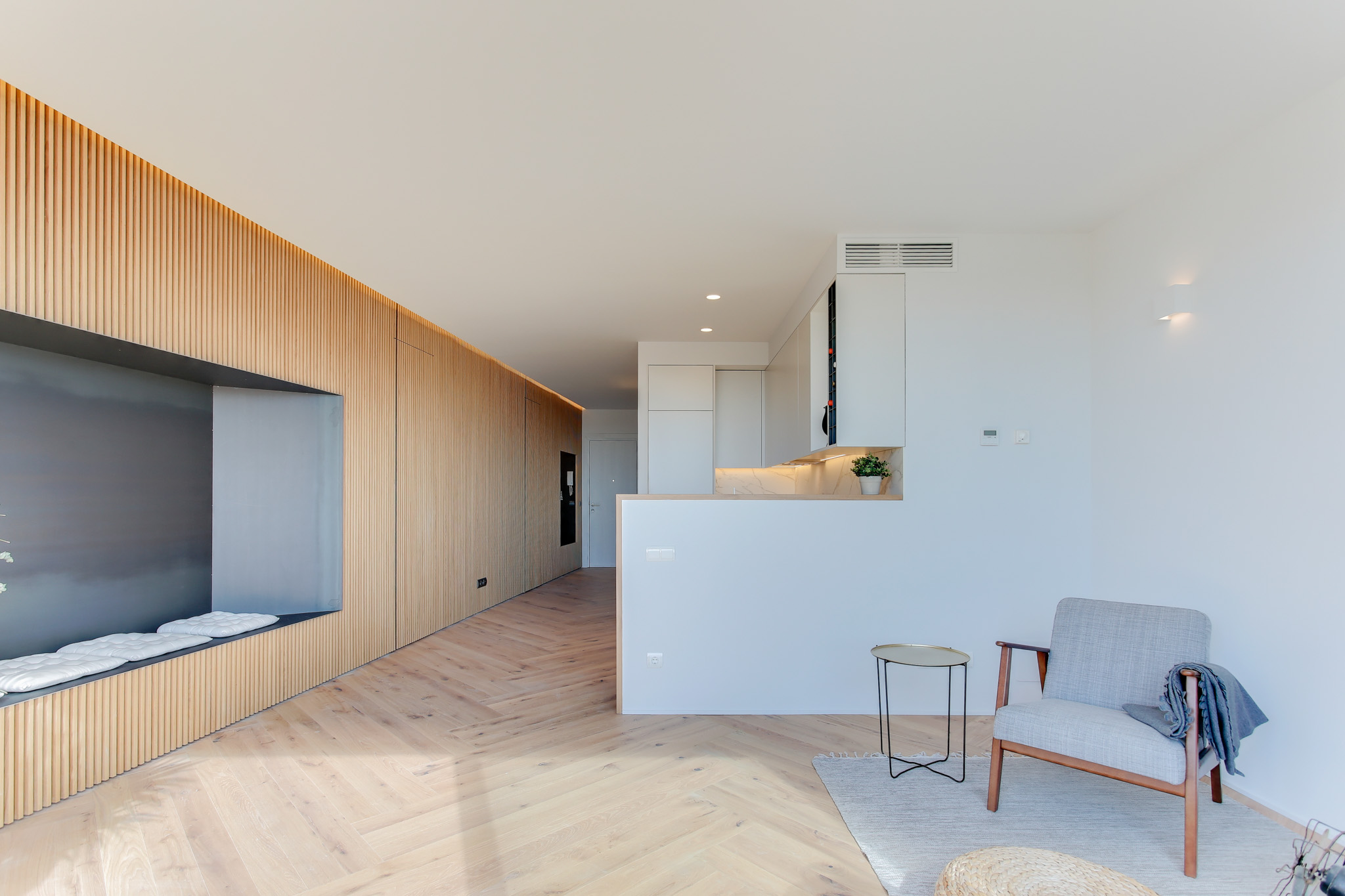 - Lejlighed er i nordisk stil og dekoreret med elegante detaljer såsom vægge dækket af træ.