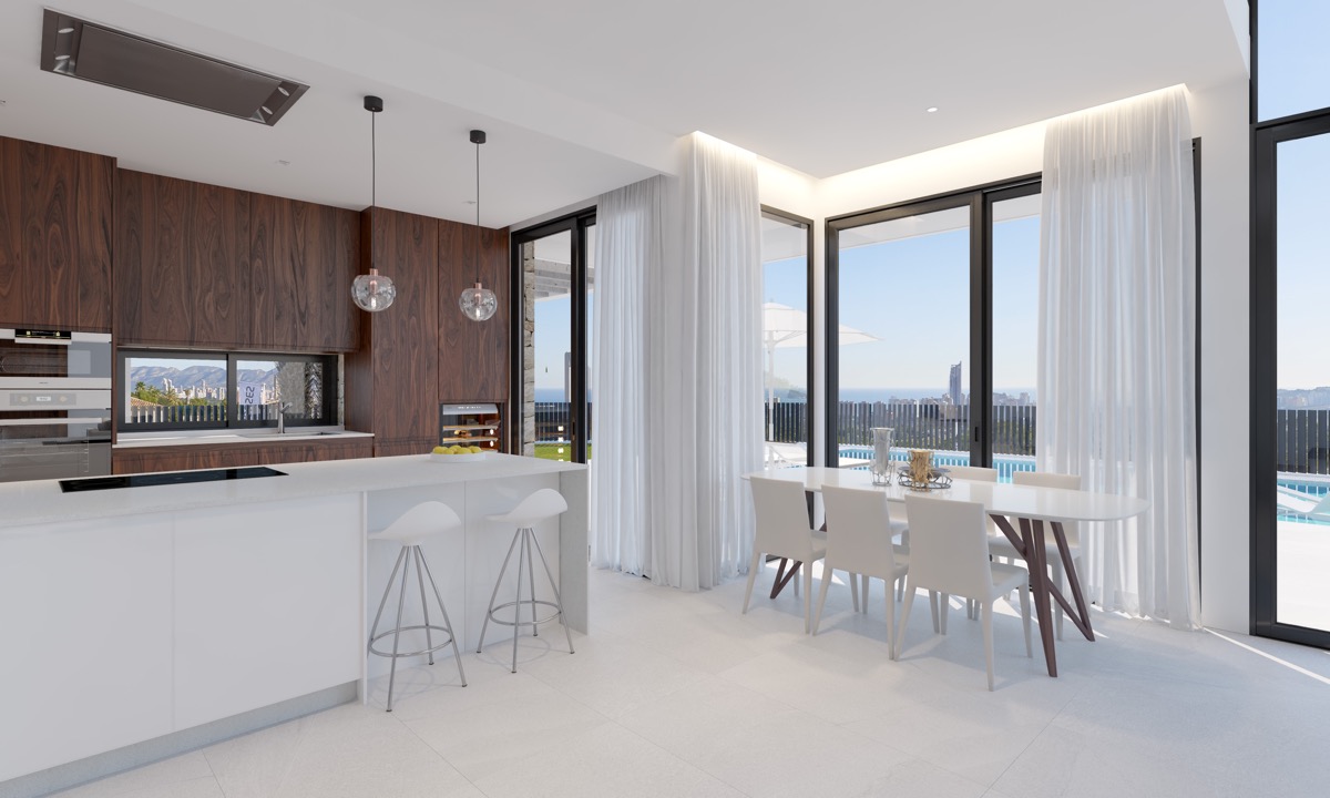 I stuen / spisestuen samler villaerne materialer, der tilføjer både elegance og varmen fra Middelhavet. Der er lyse, rummelige områder, der åbner ude efter et moderne arkitektonisk koncept, der smelter luksus med charmen af de finere detaljer.