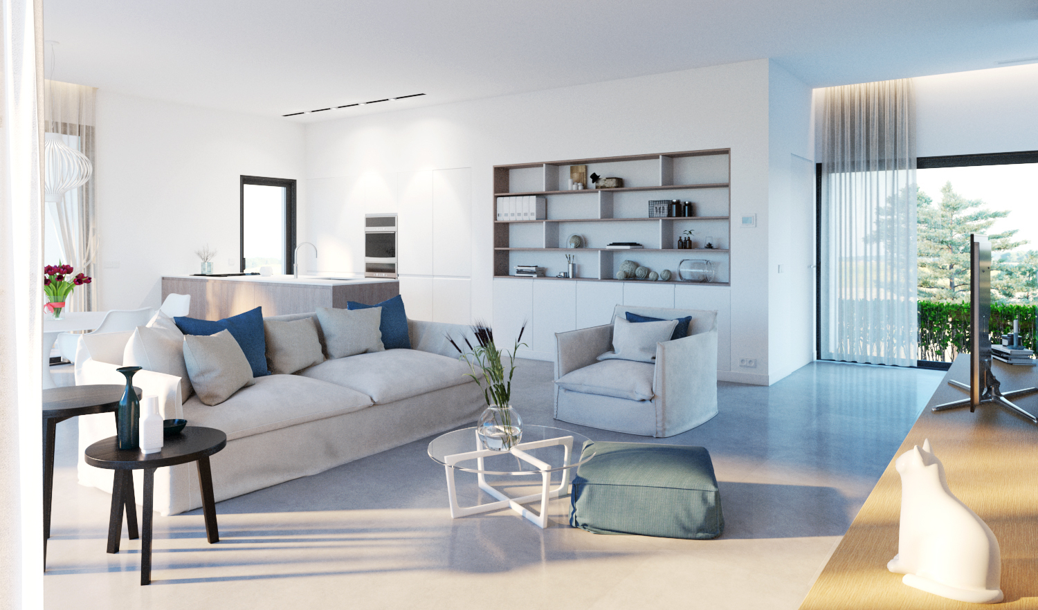 Fra køkkenet har du adgang til praktisk opbevaring og vaskerum. Ved siden af køkkenet giver brede skydevinduer adgang til en hyggelig og praktisk overdækket veranda på 44 m2. Her finder du et udendørs køkken med grill. Ved siden af spisepladsen finder du et andet skydevindue, der fører dig til en anden terrasse.