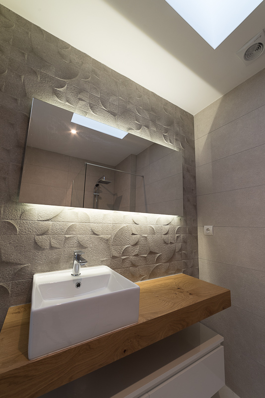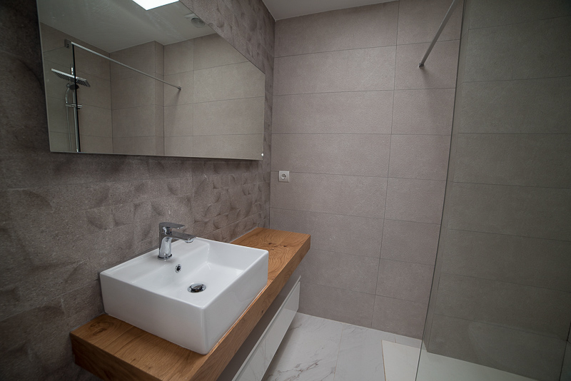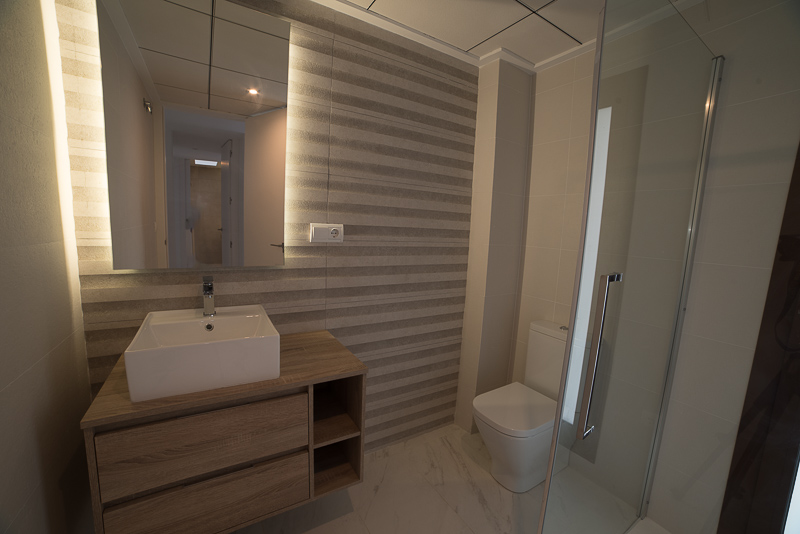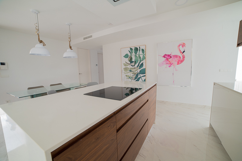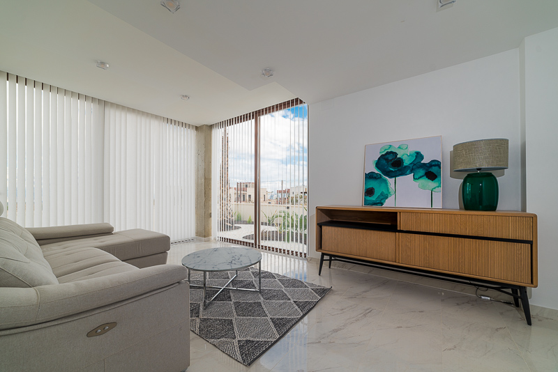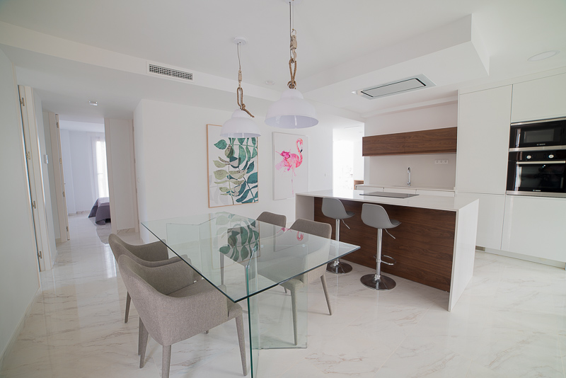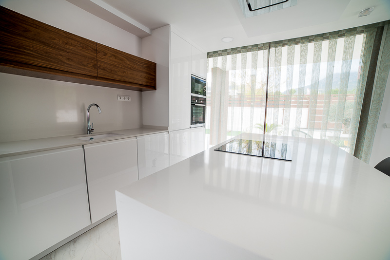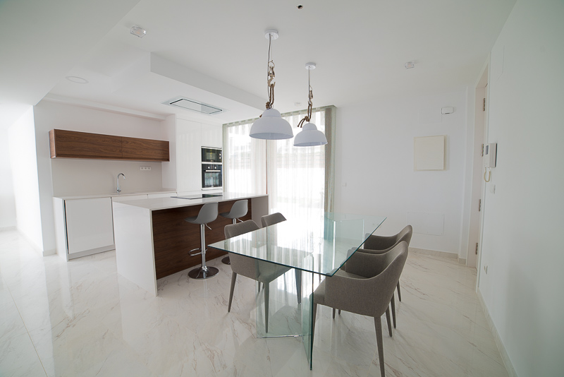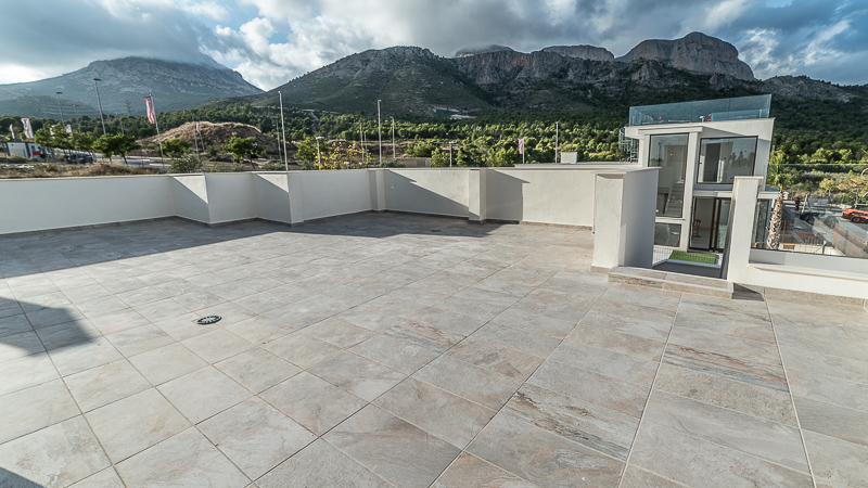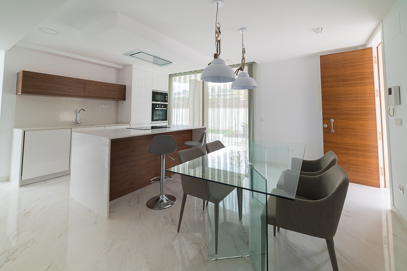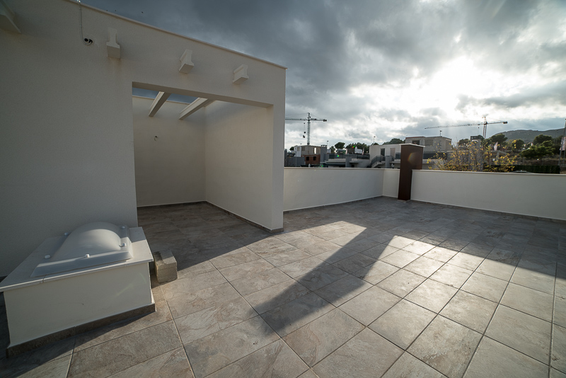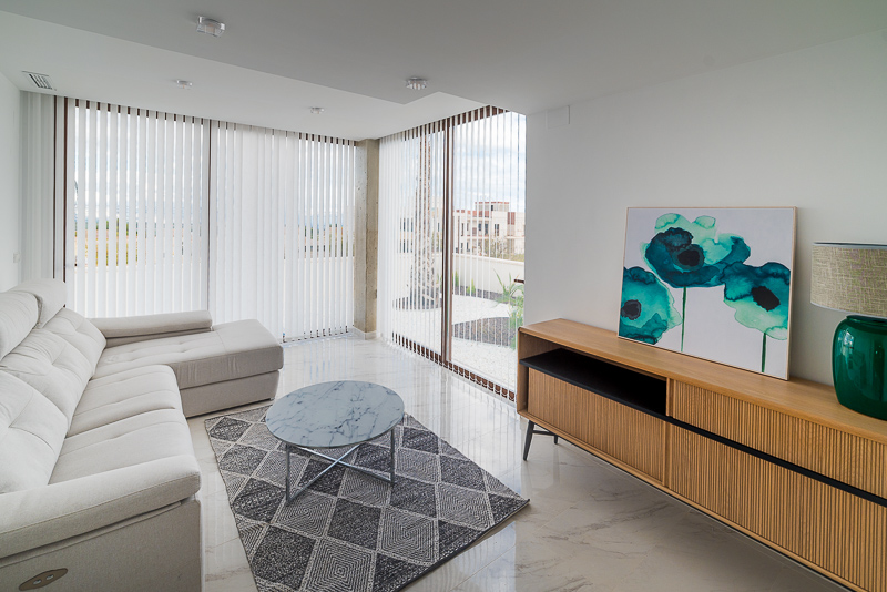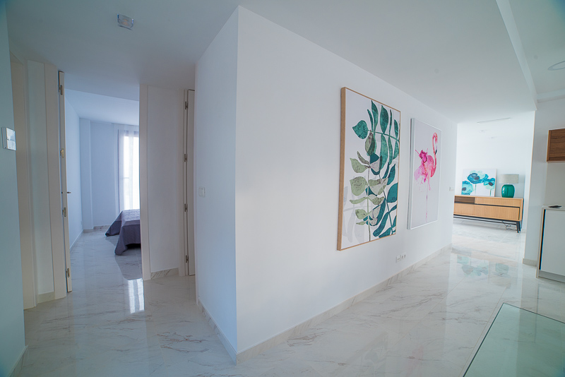 Indenfor er der en stor stue / spisestue med højt til loftet og store vinduer, køkken, 3/4 soveværelser, 2/3 badeværelser. På taget er der solarium med betagende udsigt over havet og bjergene.