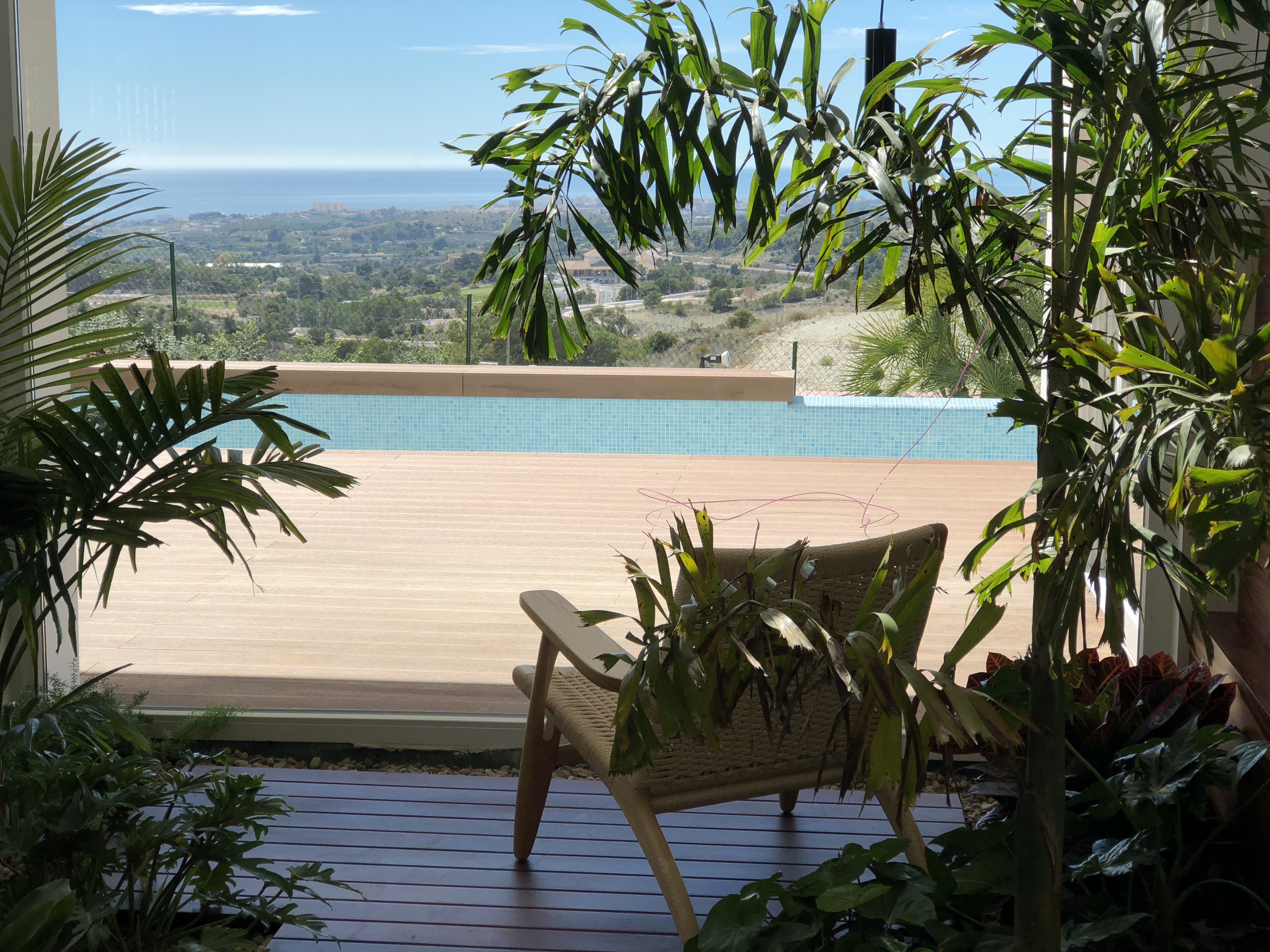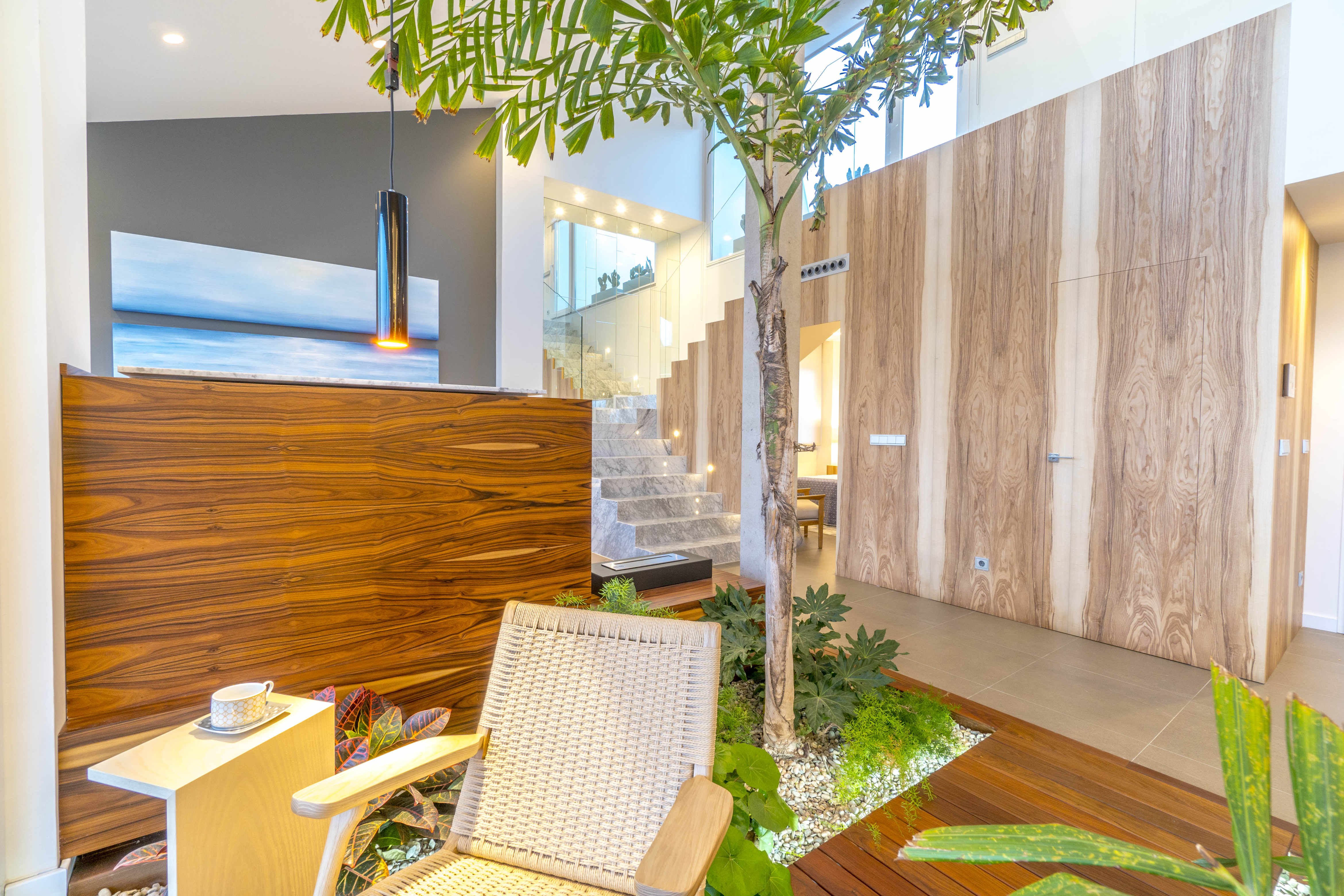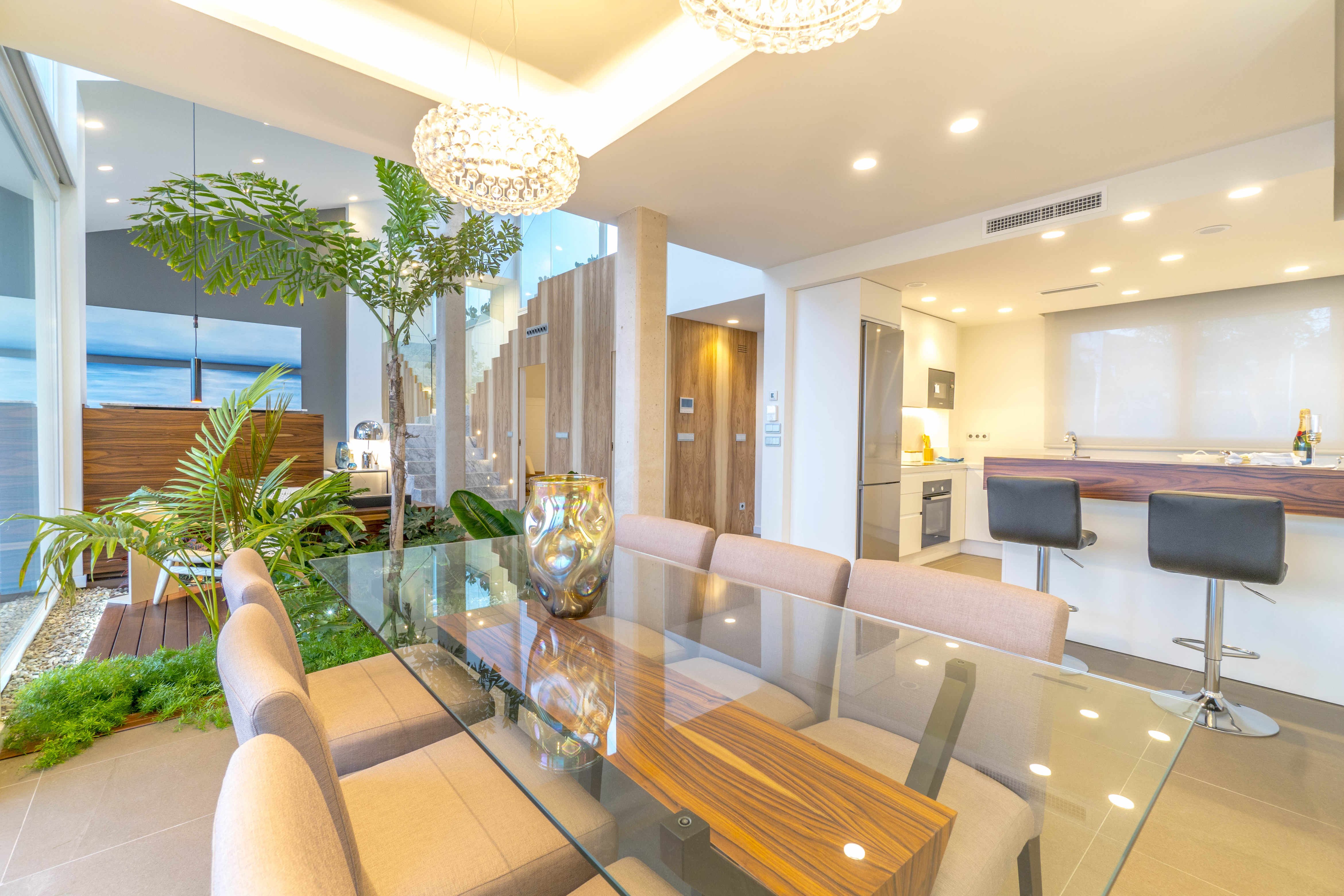 Premium kvalitet inklusive blandt andet aerotermisk klimatisering, gulvvarme i badeværelser, hjemmeautomatiseringssystem KMS, indendørs have, Carrara marmortrappe, komplet køkken højt kvalificeret, udendørs have med landskabsprojekt og infinity pool med belysning.