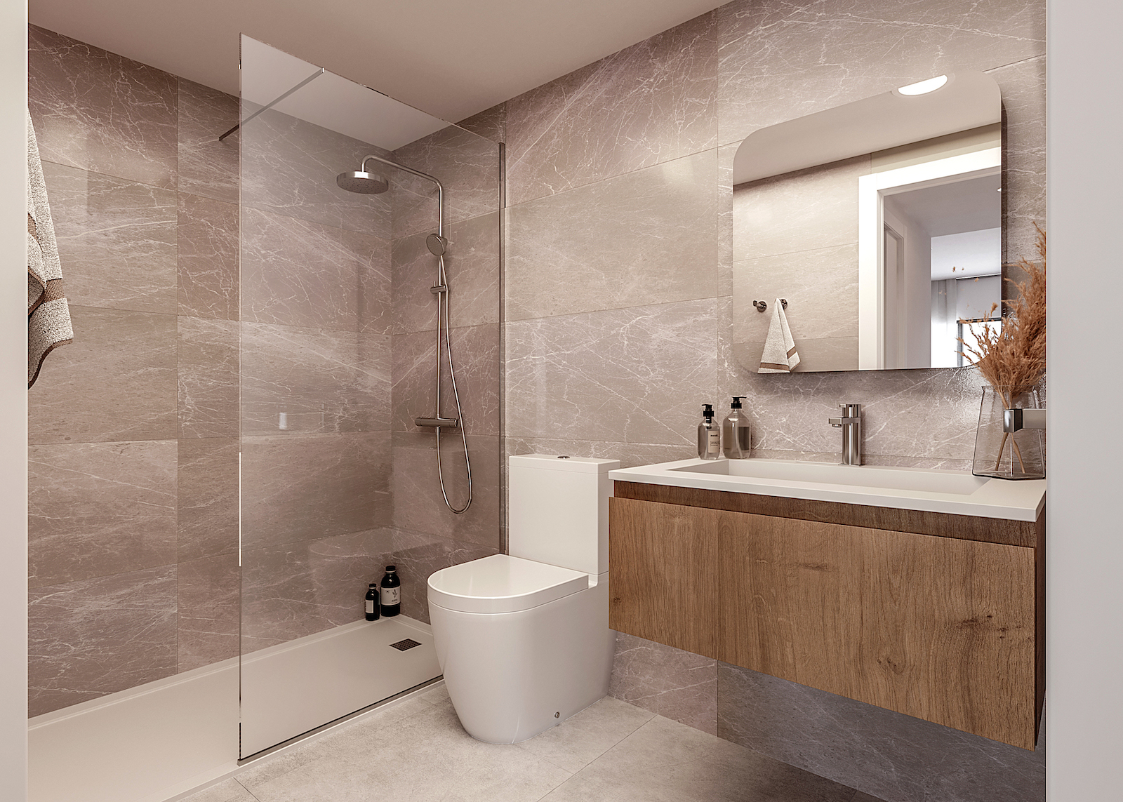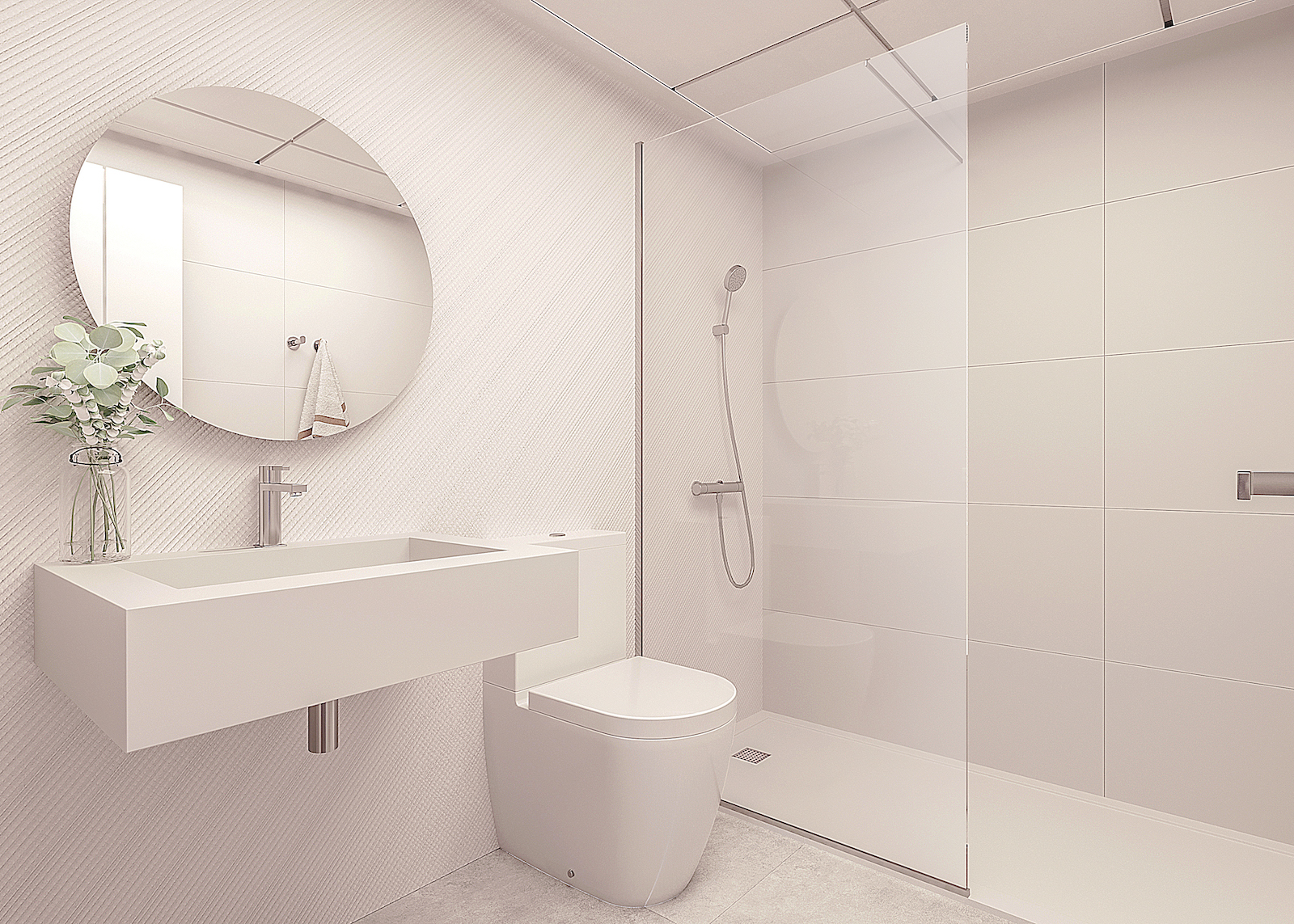 Boligerne på Essential projektet har 2 badeværelser, et åbent køkken og en stue / spisestue. De rummelige terrasser er i direkte forlængelse med stuen takket være de store vinduer. En underjordisk parkeringsplads er inkluderet for hver lejlighed.