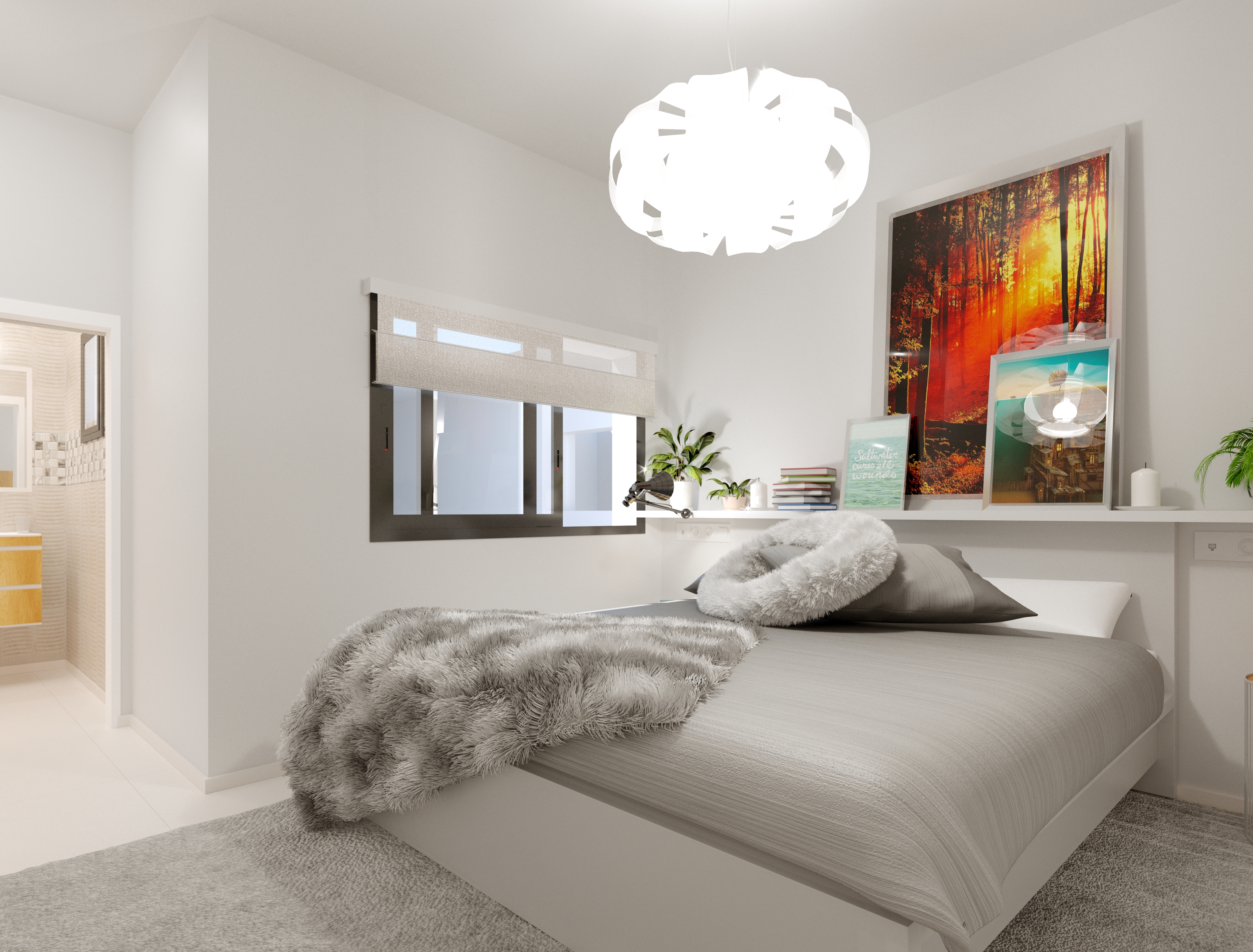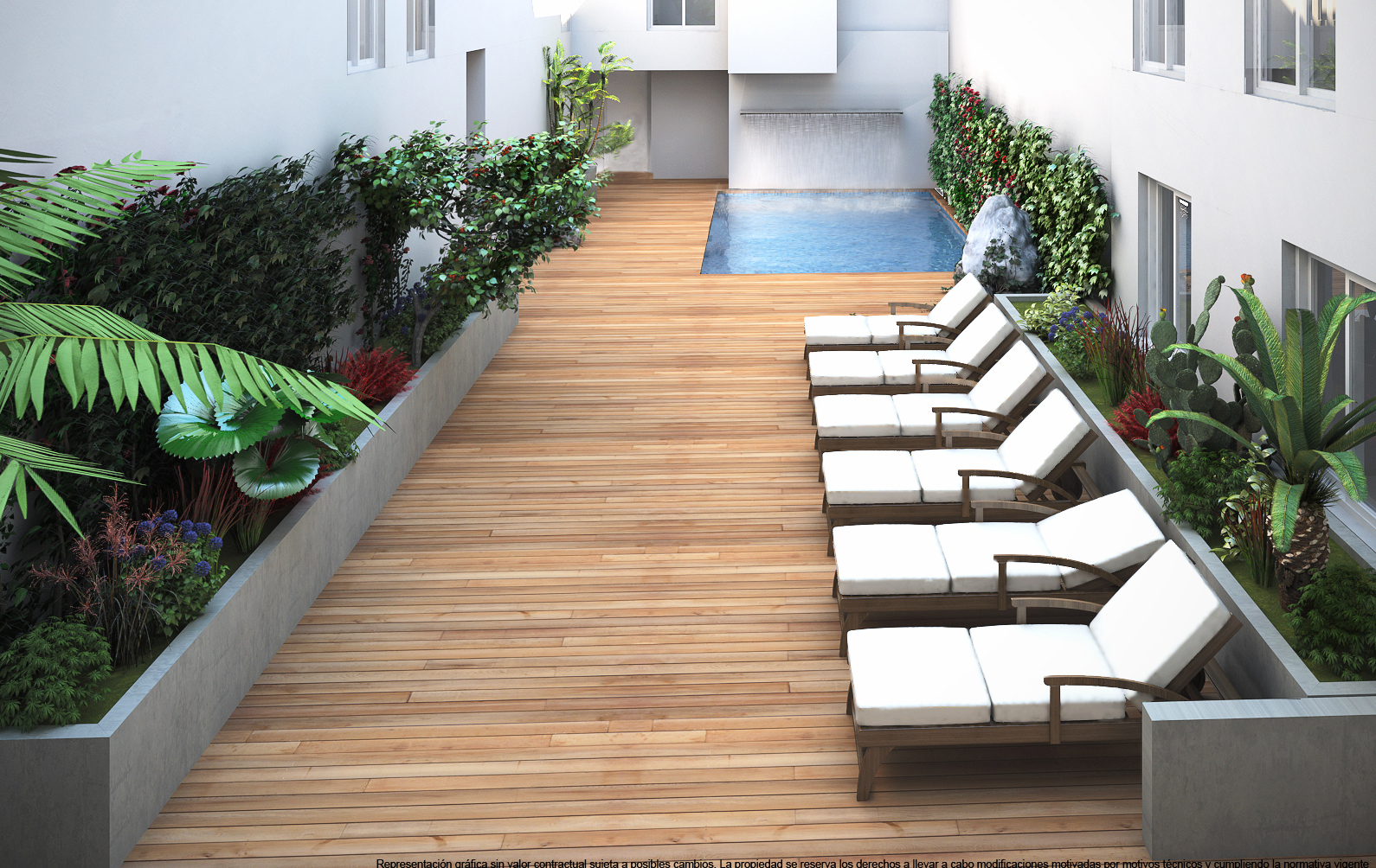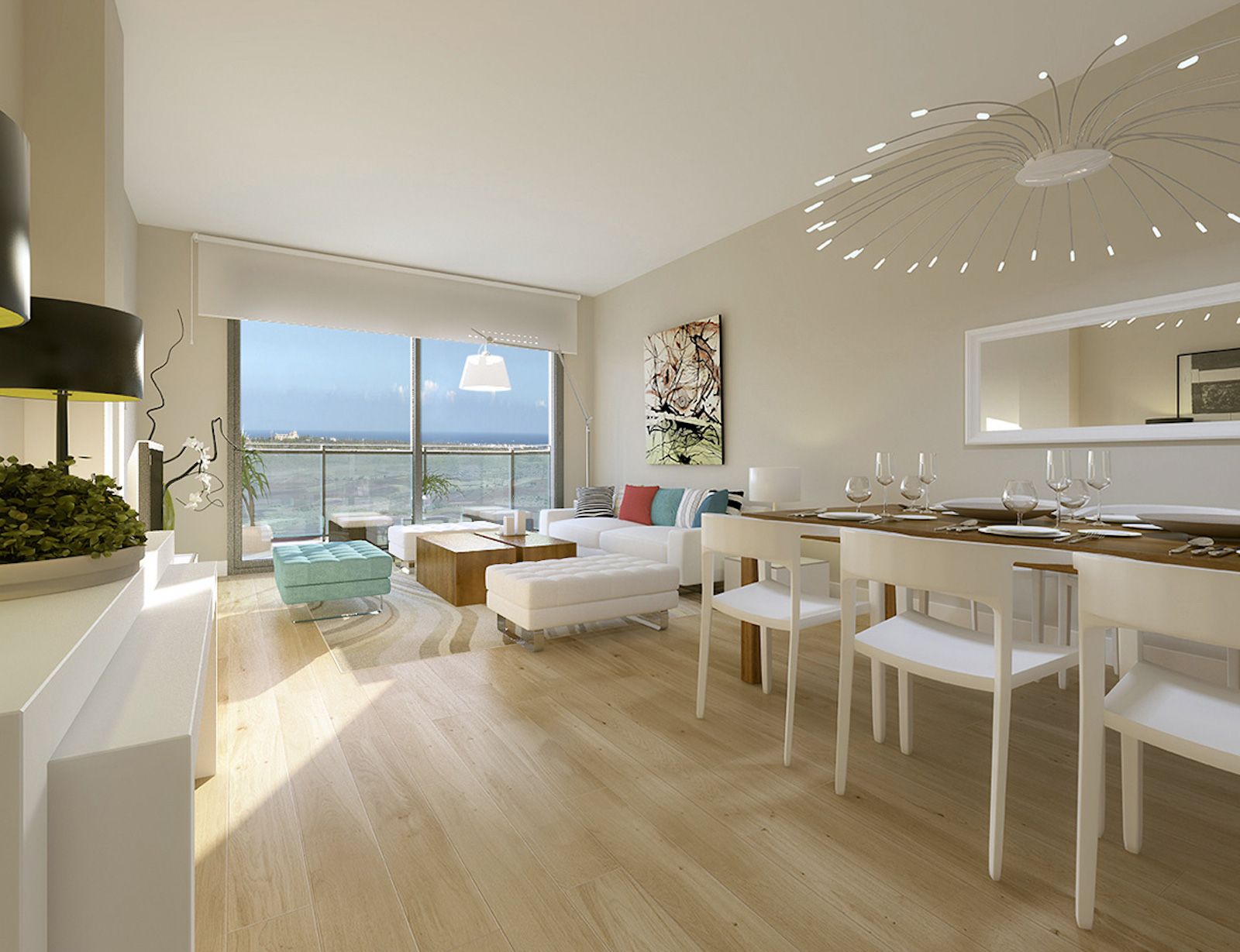 Husene har 2 eller 3 soveværelser og 2 badeværelser, penthouseerne, på øverste etage har et privat solarium og desuden har alle boliger en privat terrasse.