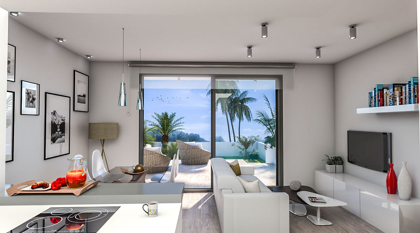 I dette boligområde finder du lejligheder i moderne stil med 2-3 soveværelser, private udendørs områder med terrasse, solarium og/eller have til fri benyttelse med den dertilhørende storslåede udsigt. Komplekset har store fællesområder udstyret med fælles swimmingpool, grønne områder og parkering. Her har man været opmærksom på samtlige detaljer der gør din drøm til virkelighed.