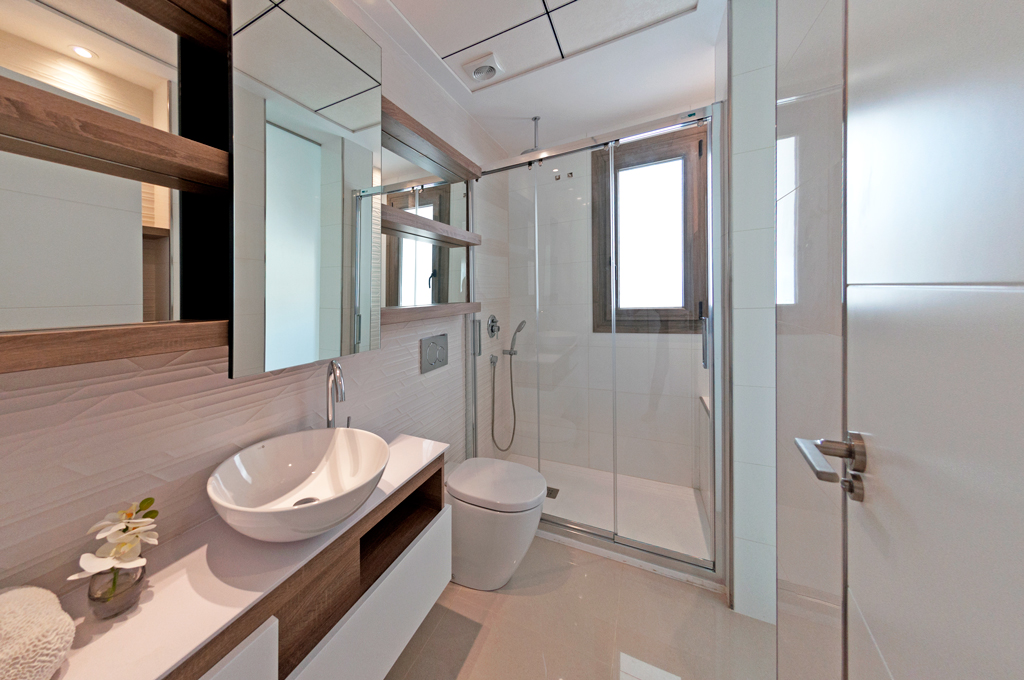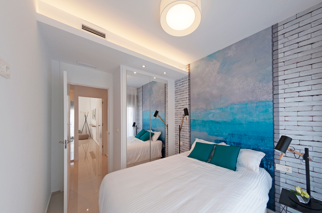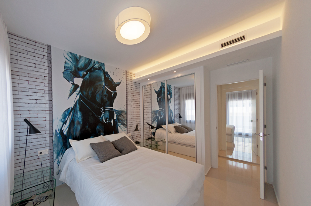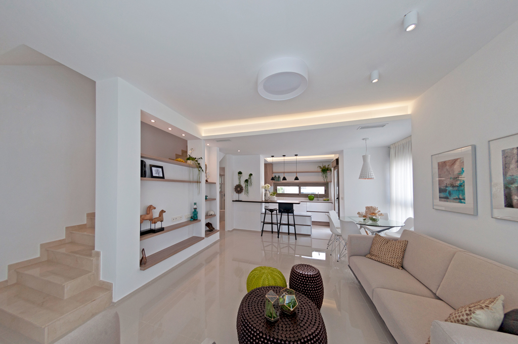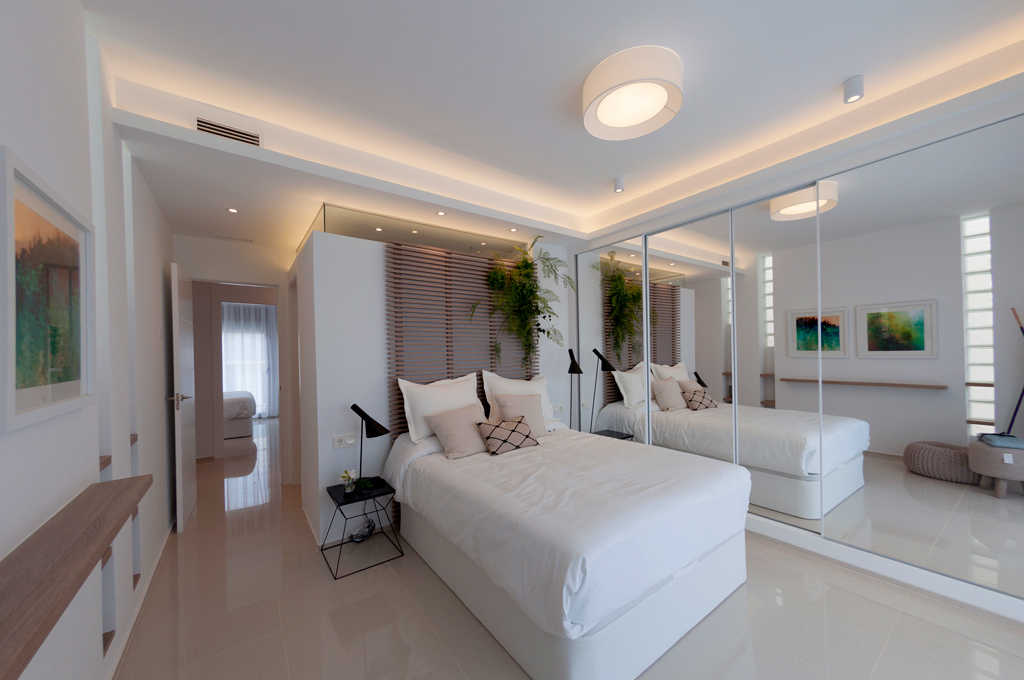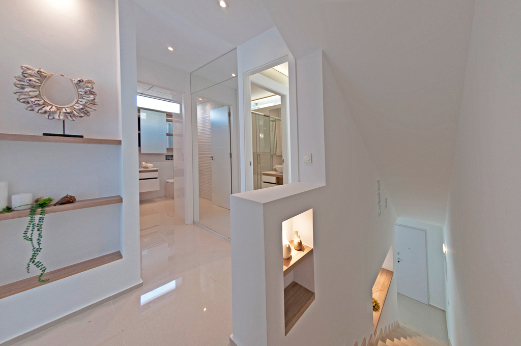 I stueetagen finder du et rummeligt åbent moderne køkken og opholdsstue med adgang til den private have, et badeværelse og et opbevaringsrum. På første sal finder du 2 soveværelser med adgang til en balkon og fælles badeværelse samt et ’master’-soveværelse med eget badeværelse og adgang til en terrasse der komplimenterer med udsigt over pool området og med udvendig trappe til tagterrassen på 45m2.