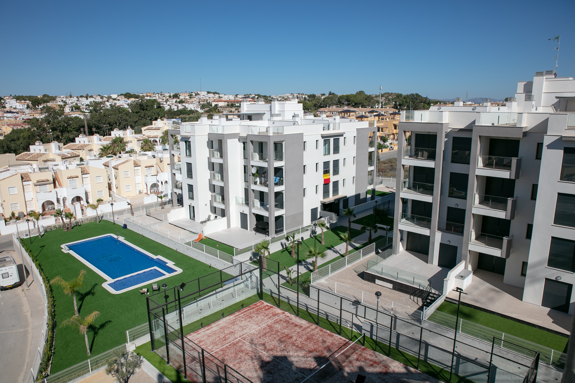 Nybygget privat kompleks med 144 moderne lejligheder, der består af 6 blokke, store grønne områder, svimming pools og paddle tennisbane.