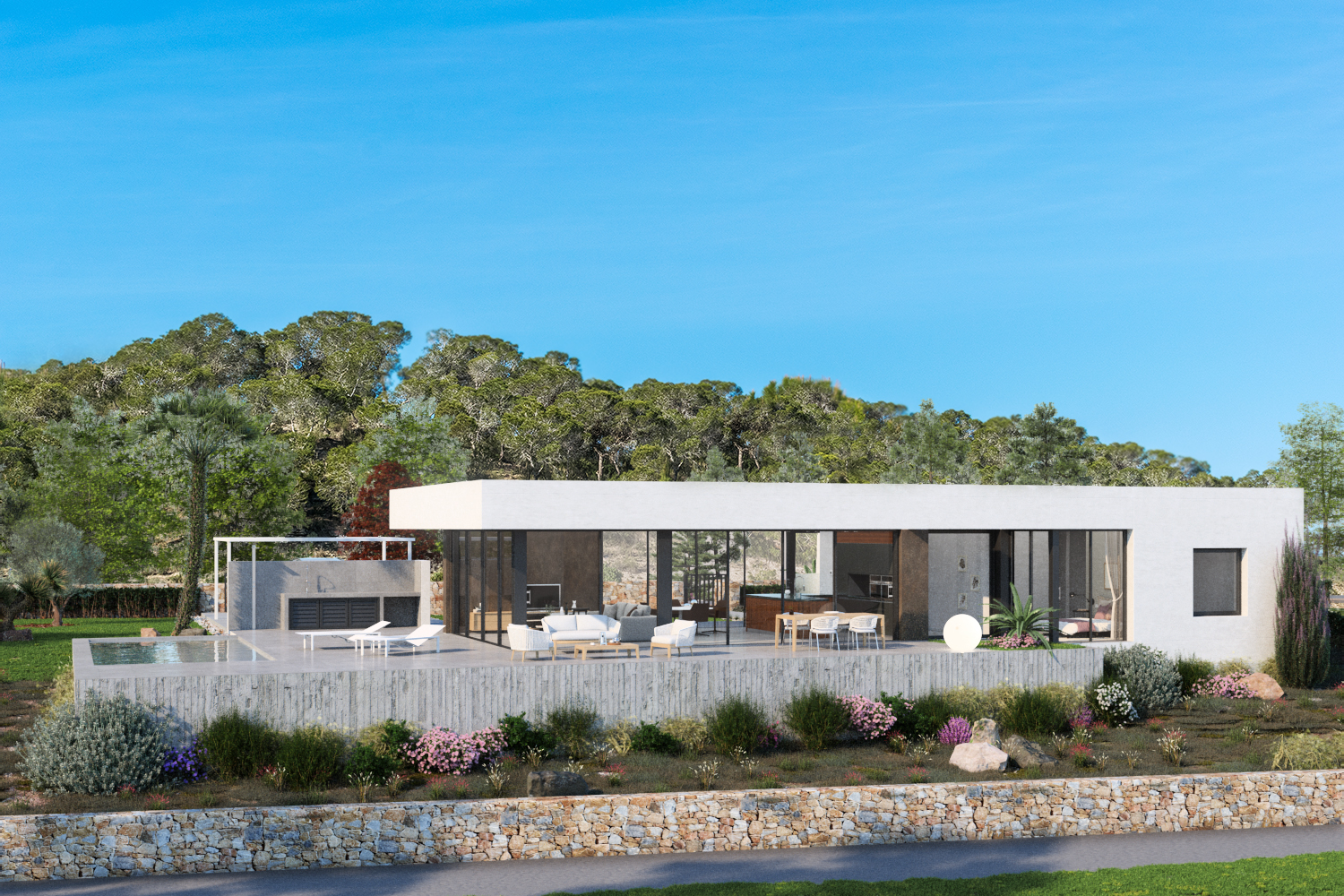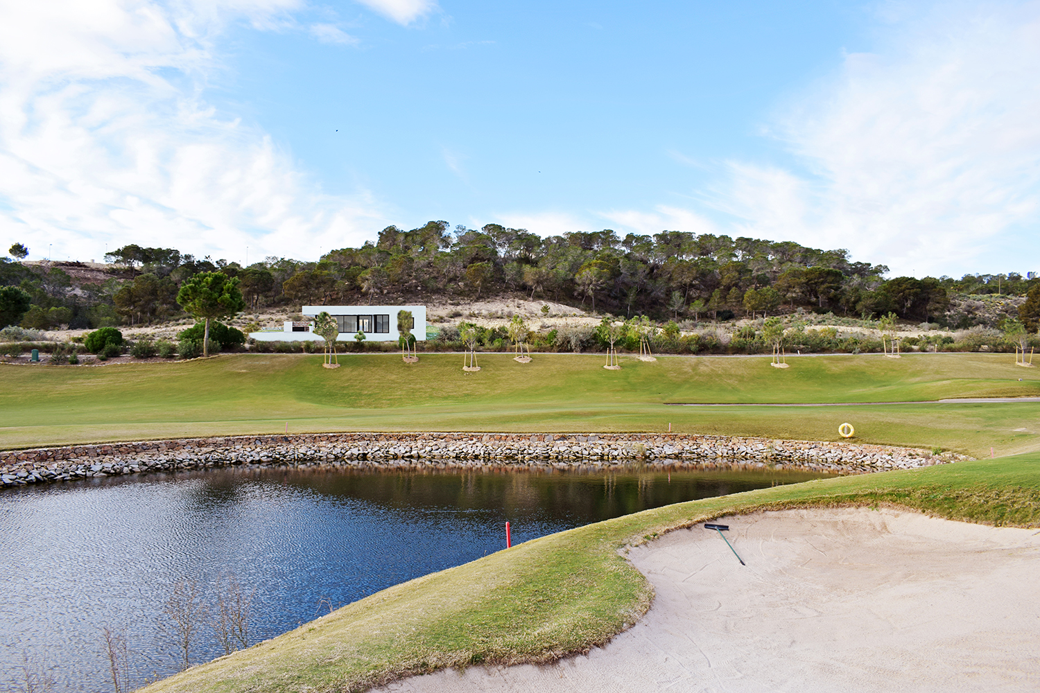9 uafhængige villaer med golf og panoramaudsigt over havet. Alle villaer har kælder, privat pool og garage.