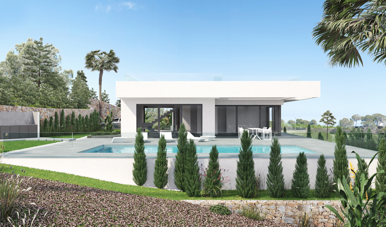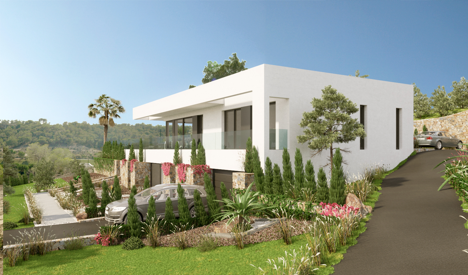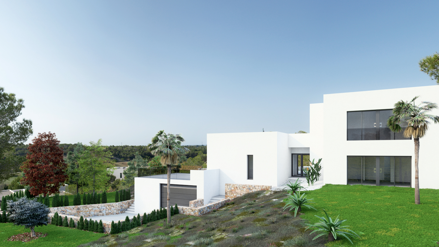 Denne fantastiske villa med 5 soveværelser og 4 badeværelser ligger på en af de højeste grunde i centrum af øen Las Colinas. Villaen har to indgange. Begge fra bagsiden af plottet. Fodgængeren fører dig gennem et dejligt rummeligt område mod indgangen i stueetagen. Den brede indgang inviterer dig ikke kun til at nyde udsigten til terrassen og poolområdet, men adskiller også køkken og spiseplads fra stuen og soveværelserne.