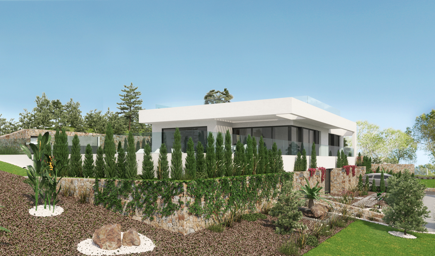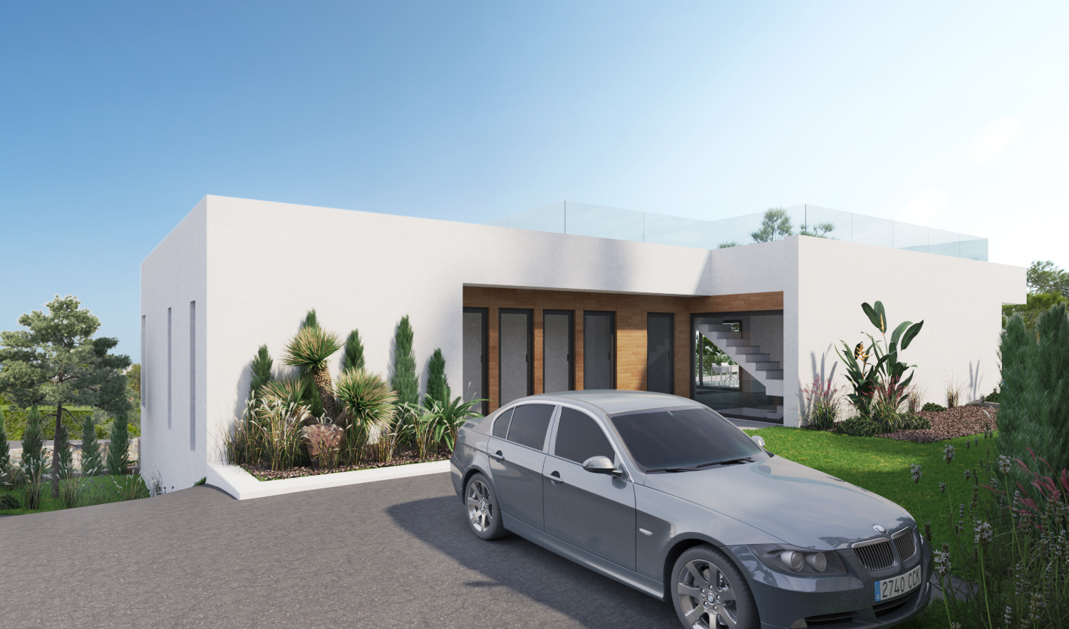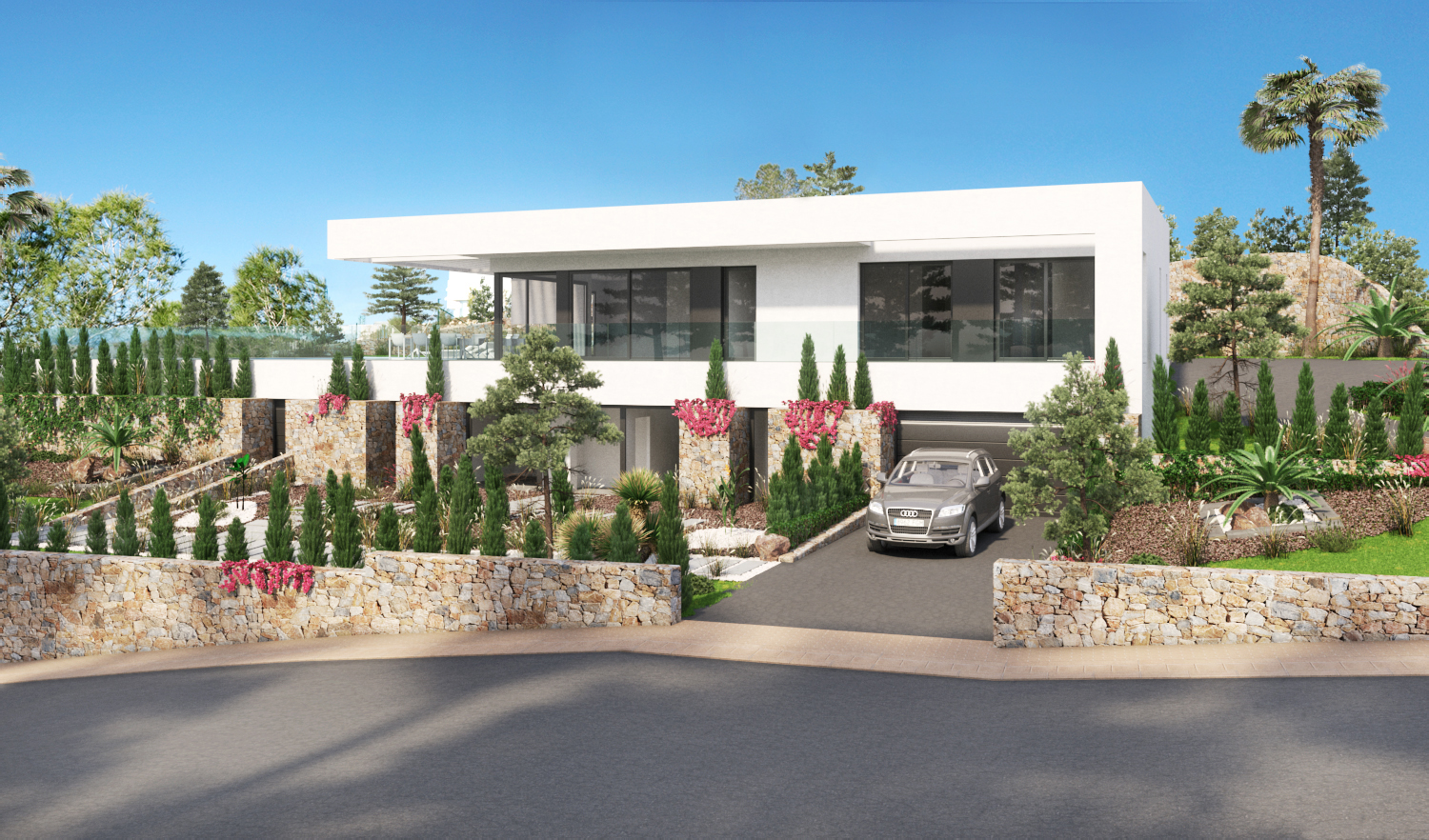 Denne fantastiske villa med 5 soveværelser og 4 badeværelser ligger på en af de højeste grunde i centrum af øen Las Colinas. Villaen har to indgange. Begge fra bagsiden af plottet. Fodgængeren fører dig gennem et dejligt rummeligt område mod indgangen i stueetagen. Den brede indgang inviterer dig ikke kun til at nyde udsigten til terrassen og poolområdet, men adskiller også køkken og spiseplads fra stuen og soveværelserne.
