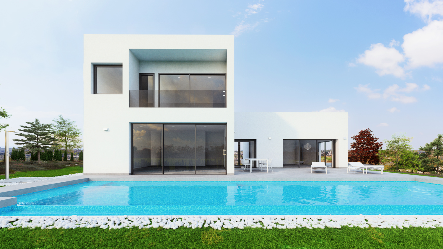 Det åbne køkken og spiseplads nyder det naturlige lys fra de store vinduer mod terrassen. Bag køkkenet finder du et gæstetoilet og et praktisk vaskerum. Fra stuen og spisepladsen har du adgang til hovedterrassen på 65 m2. Hovedterrassen er desuden forbundet med en anden terrasse på 43 m2. Alt i stueetagen. I stueetagen finder du desuden 2 soveværelser og et badeværelse. Fra stuen og spisepladsen har du udsigt over golfbanen og havet.