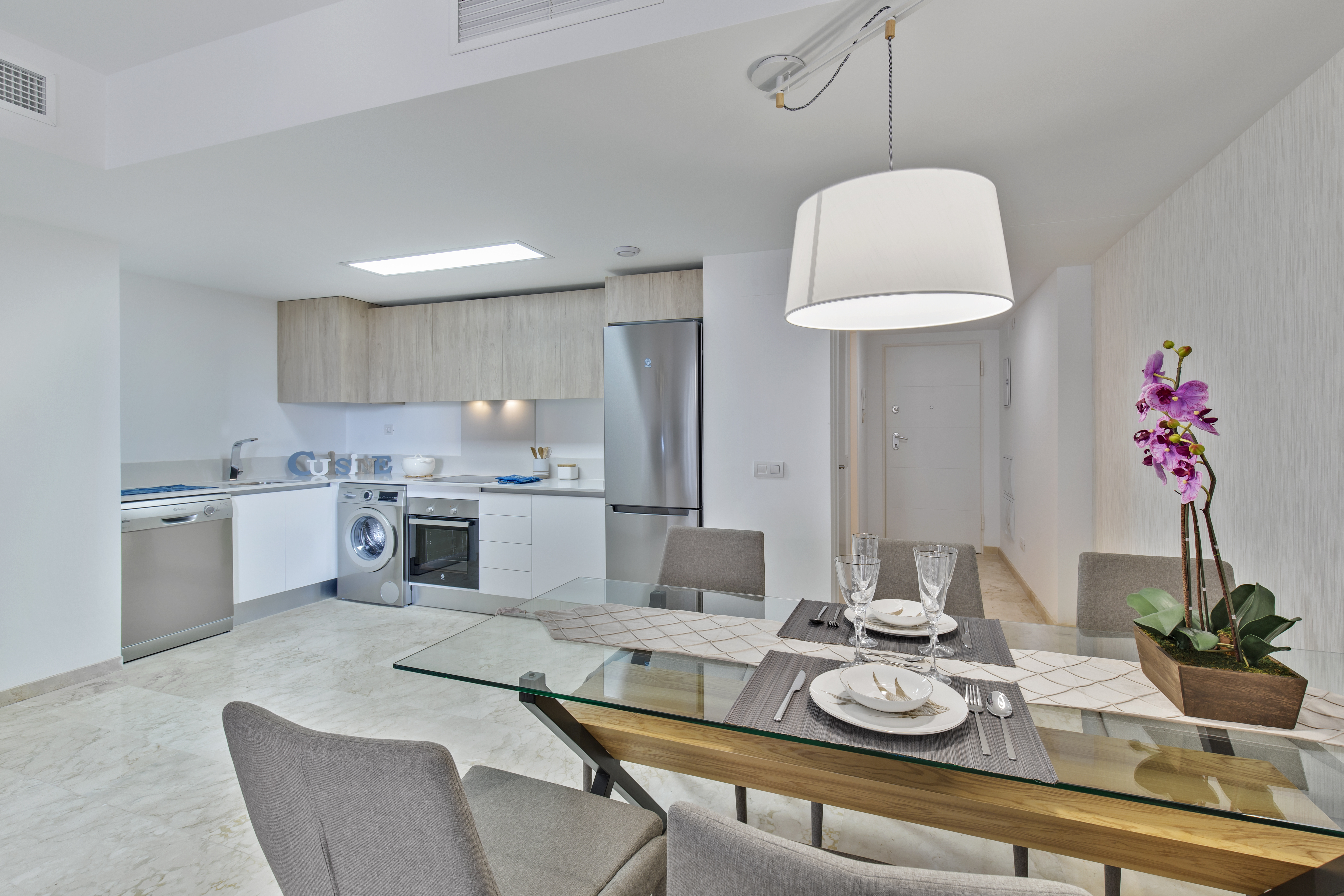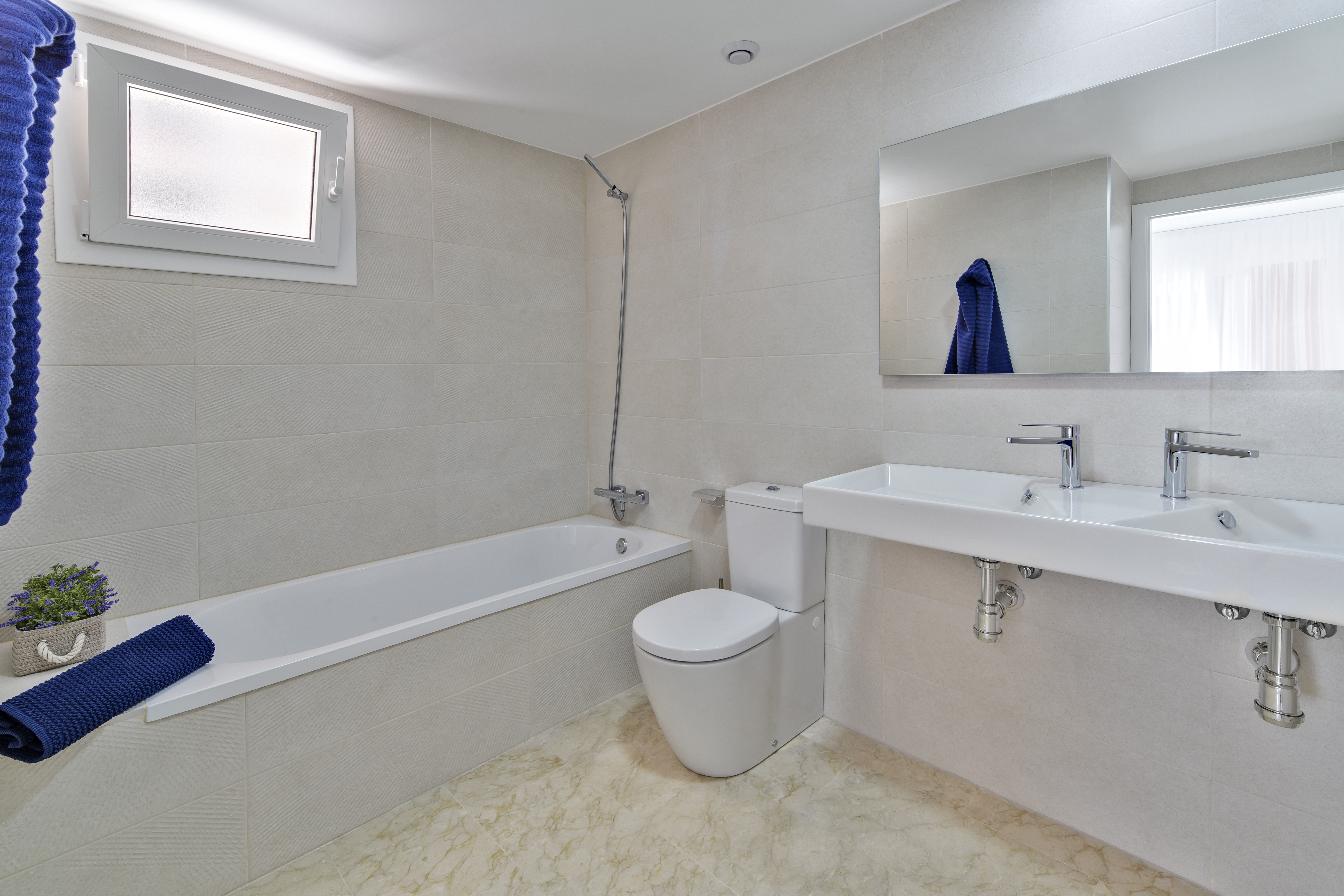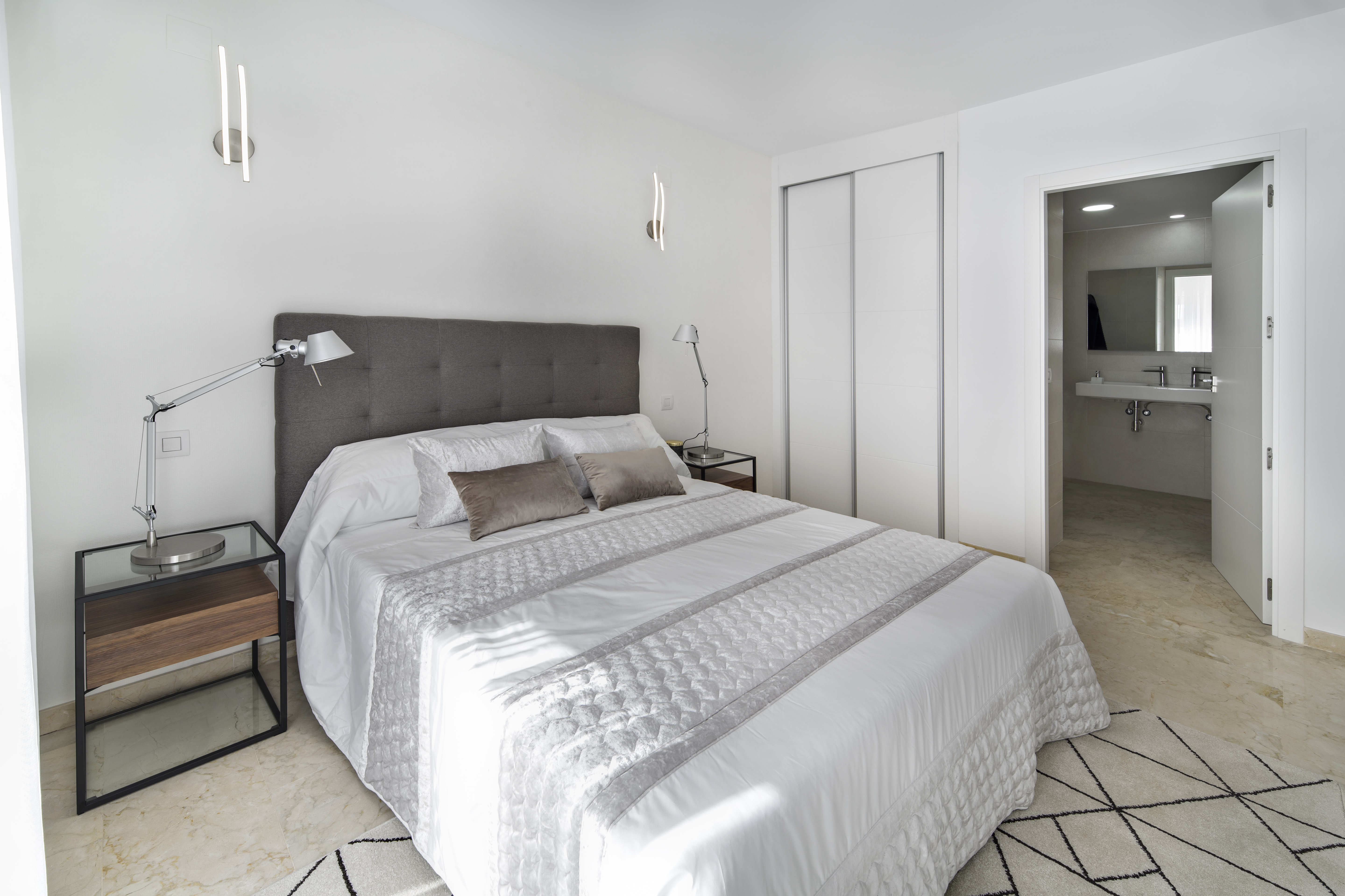 Disse 3 badeværelser og 3-værelses lejligheder har et veldesignet layout, alle master bedrooms med en-suite badeværelse og hver med en privat terrasse. Fra terrassen kan du nyde den smukke udsigt over havet, poolen og de private haver i udviklingen. De unikke penthouses inkluderer solområder med enestående udsigt. Hver lejlighed har også en underjordisk parkeringsplads og et opbevaringsrum. Alle bygningerne har en elevator, som også bringer dig til garagen.
